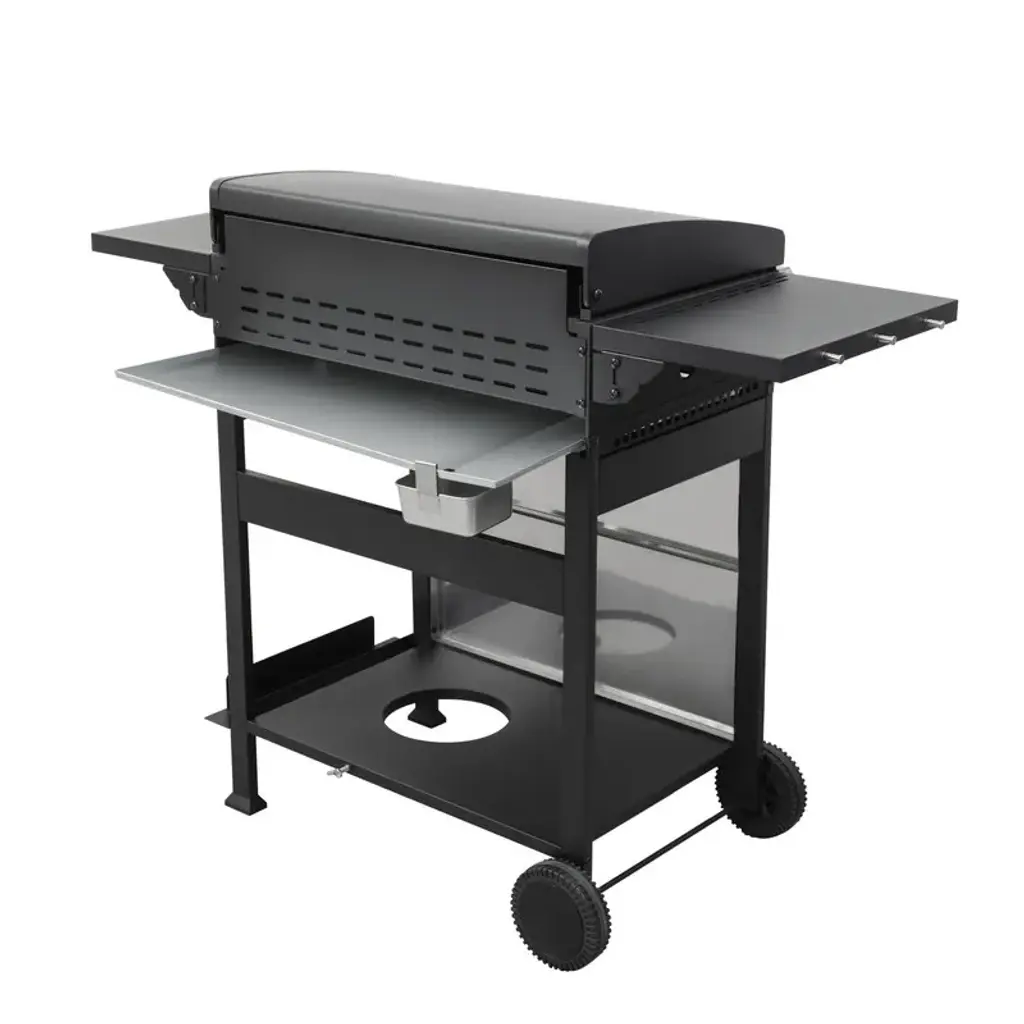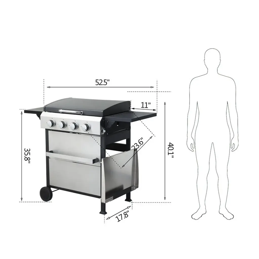 【Firebox】: Enamel 【wheel】: 2pcs 6inch wheels 【wire enamel cooking grids】: 2pcs 11.6x17.3 inch 【Warming rack】: Enamel 【Ignition system】: Push and turn, integrated automatic easy ignition【Flame tamper】: Enamel flame tamper, 4pcs【Power】: 12300 BTU * 4= 49200 BTU【Hanging baskets】: 22.2x3.15x1.57inch【Side table】: Steel, black powder coating, foldable, 11x17.7inch【Hooks】:6pcs
