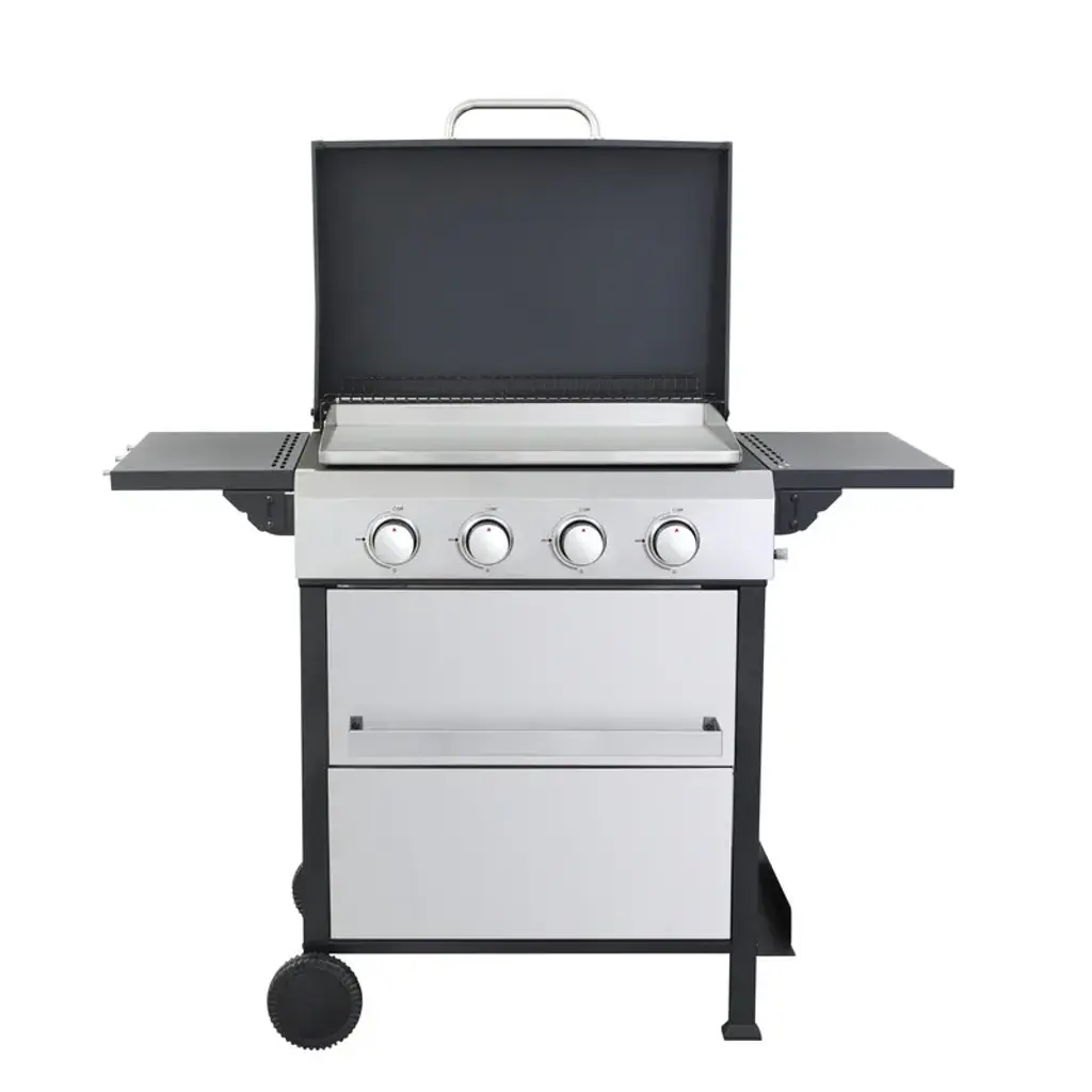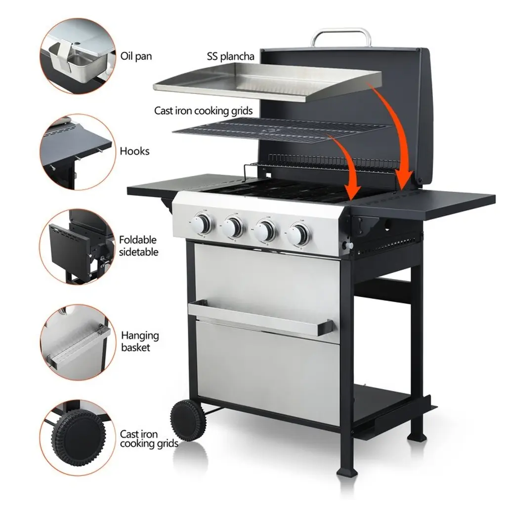 4-Burner Propane Gas Bbq Grill, Ss Plancha, 49200btu Output With Wire Enamel Cooking Grids Hanging Basket, Stainless Steel - Propane Gas