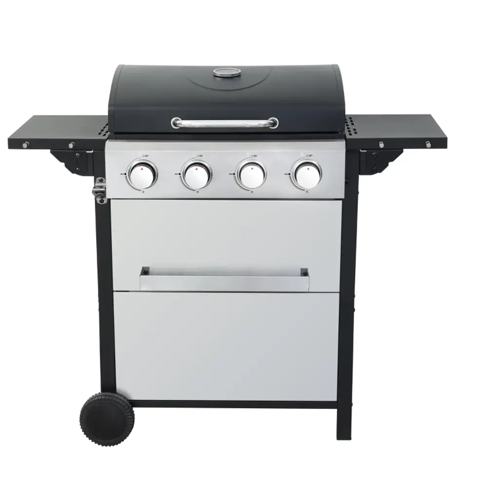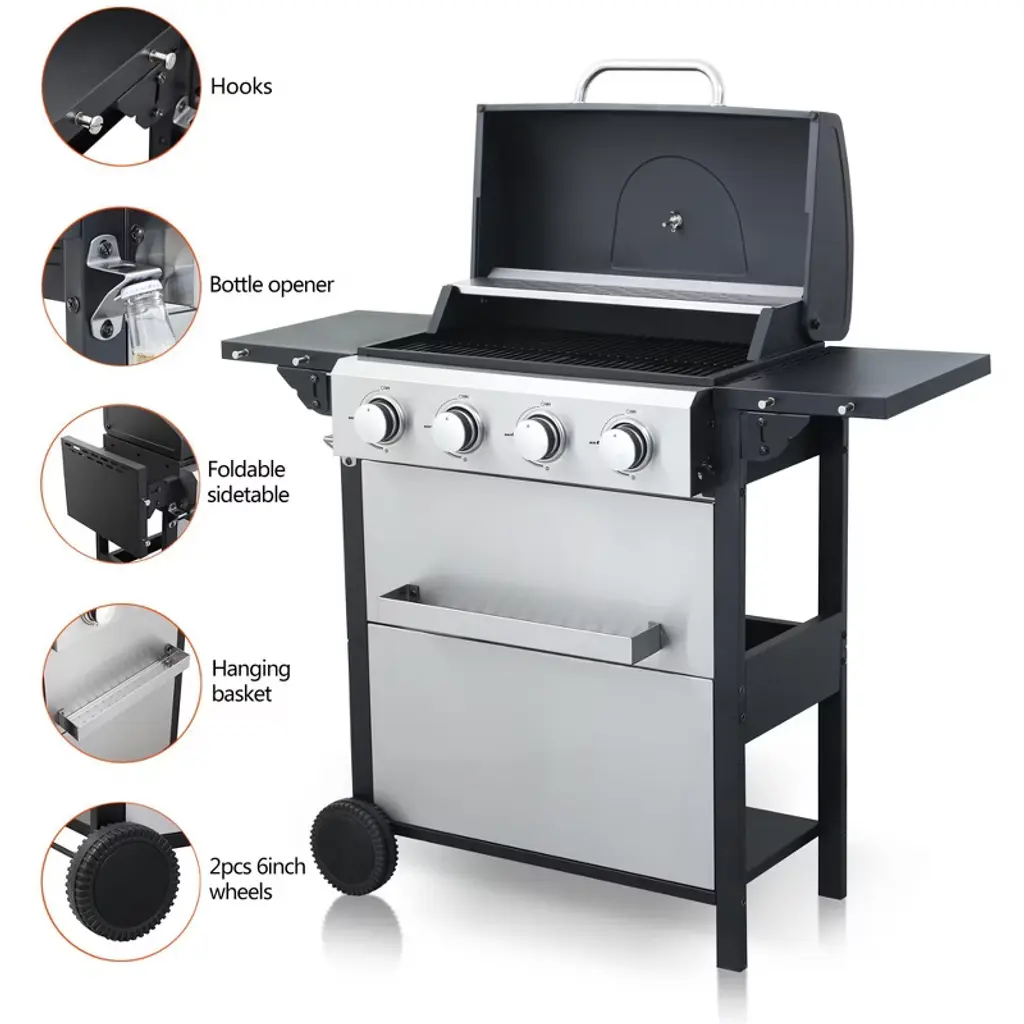 This 4-burner propane grill features durable wire enamel cooking grids and foldable steel side tables for versatile outdoor cooking. Stainless steel hanging baskets, integrated hooks, and a built-in bottle opener enhance convenience, while push-and-turn ignition and high-temperature resistant powder-coated firebox ensure precise heat control and long-lasting durability. Perfect for backyard parties, patio gatherings, and family cookouts, this grill provides an efficient and organized cooking experience.