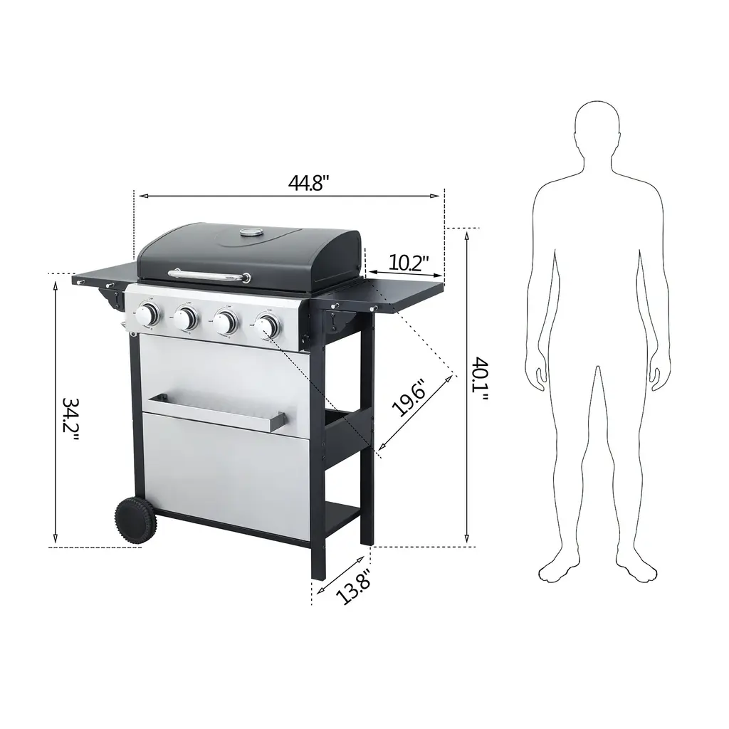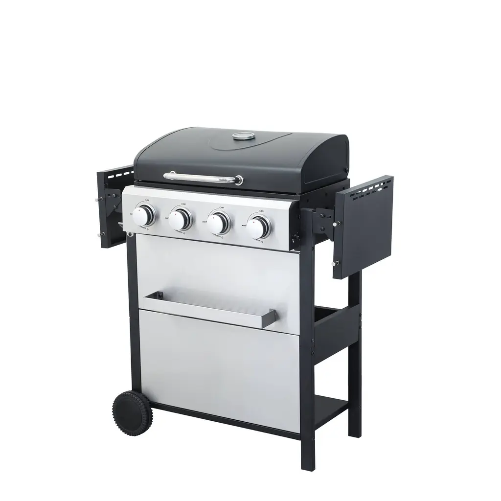 4-Burner Propane Gas Bbq Grill,output With Wire Enamel Cooking Grids For Outdoor Barbecue, Foldable Side Table, Hanging Basket - Propane Gas - Silver/black