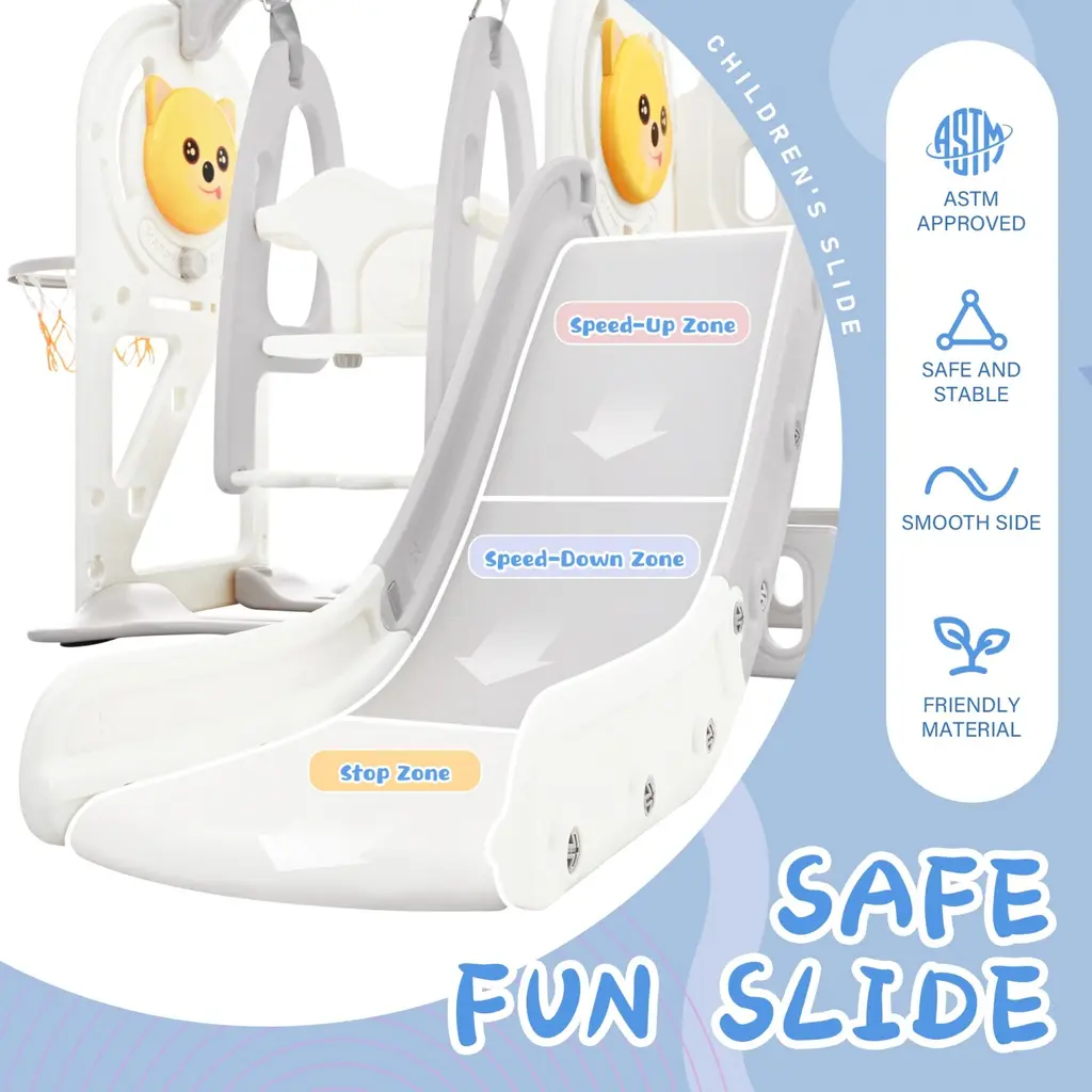 Children's Playground 5-in-1: Delicate and cute freestanding swing and slide set for toddlers with five functional parts: 1 slide, 1 climbing ramp, 1 swing, 1 basketball hoop, and 1 hidden space for toy storage.Certificated HDPE Material: Our material is made of certified HDPE material. It is completely non-toxic and will not cause any impact on the baby's health. Parents can buy this set of suits at home with peace of mind.Safe:The stable and safe structure is full of design. The rock-climbing-shaped steps on the climbing ramp not only attract children's attention but also effectively prevent slippage. The smooth surface allows children to play freely and pleasantlyFully Adapted: The happy swing is adjustable on 2 different levels, which is fully adapted to the little babies who are growing taller every day. The overall rocking center of gravity is set to the lowest possible height and a safe position.Best Gift for Baby: This swing and slide set is easy to install and clean, which is undoubtedly the best gift for children. Ideal for spacious interiors, backyards, or gardens.Description:Name: 5 in 1 Toddler Slide Swing Set Main Material: HDPEColor: Grey, Yellow, PinkProduct Dimensions: Assembled Length (in.)--79.50Assembled Width (in.)--73.00Assembled Height (in.)--50.00Weight (lbs.)--31.53Number of package: 1Package Size: Length (in.)--41.14Width (in.)--14.37Height (in.)--21.06Weight (lbs.)--33.29Packing list: 1 x slide, 1 x climbing ramp, 1 x swing, 1 x basketball hoop, 1 hidden space for toy storageNote:Due to manual measurement, please allow 1-3 cm error, thank you.Due to screen and other objective reasons, there may be a certain color difference, please understand.