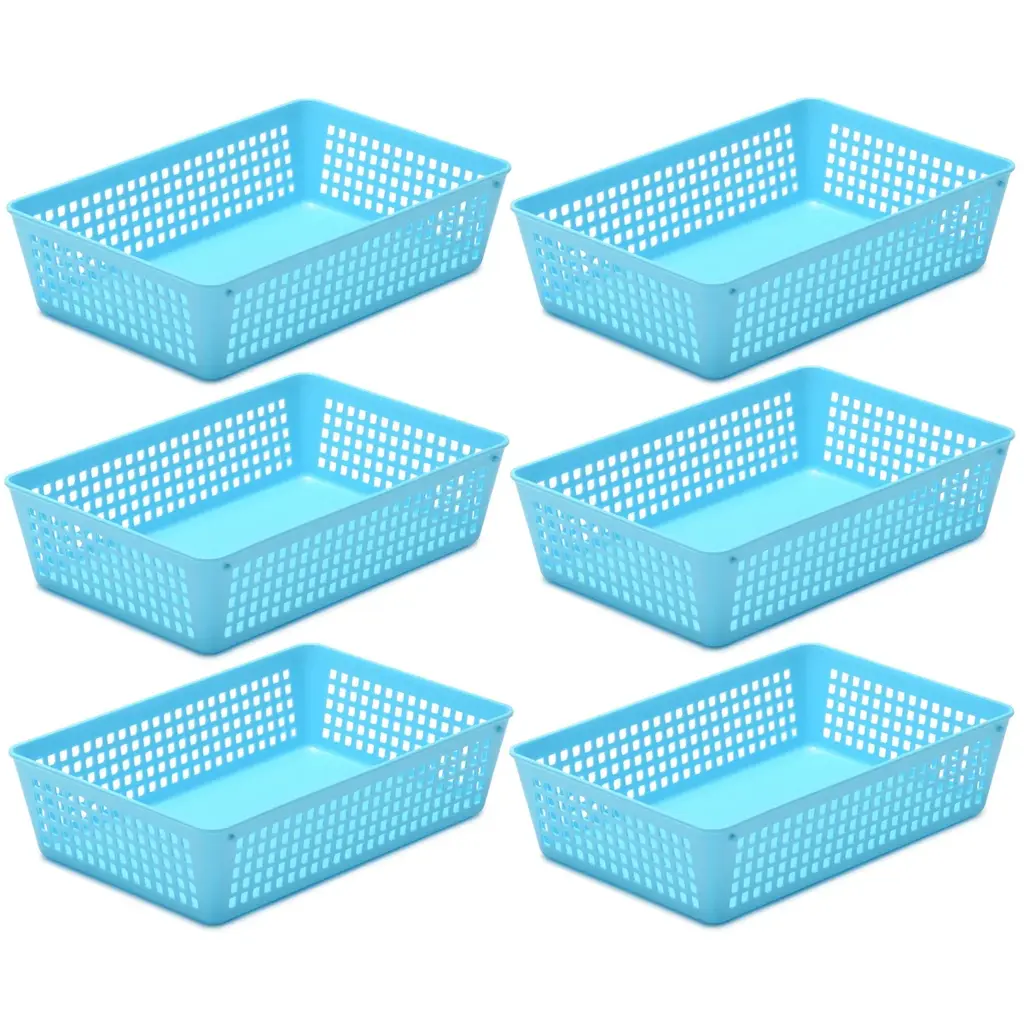 Clean up and organize common areas in your home or office with these plastic storage basketsKeep Supplies ContainedWhether you need to organize the kitchen pantry, bathroom shelves, closet, or kids room, these plastic baskets expedite the process to keep everything organized and easy to access. These baskets are solidly made to contain small items and heavy objects in drawers, desktops, shelves, and pantries without acting flimsy or wobbly. Featuring vented holes for airflow, they are made of BPA-free plastic material and withstands common tear and wear for long-term durability.Attractive Colors to Choose FromStorage baskets built with personality and style in mind. We offer these trays in six vivid colors to match your living settings:- Blue- Green- Gray- Pink- Purple- White