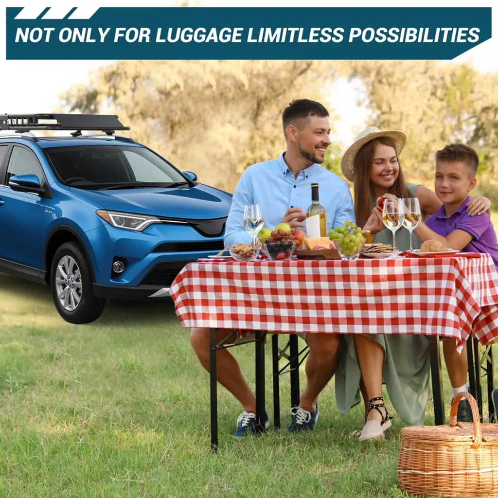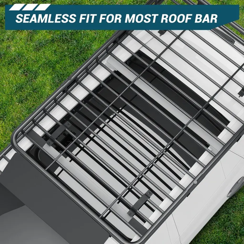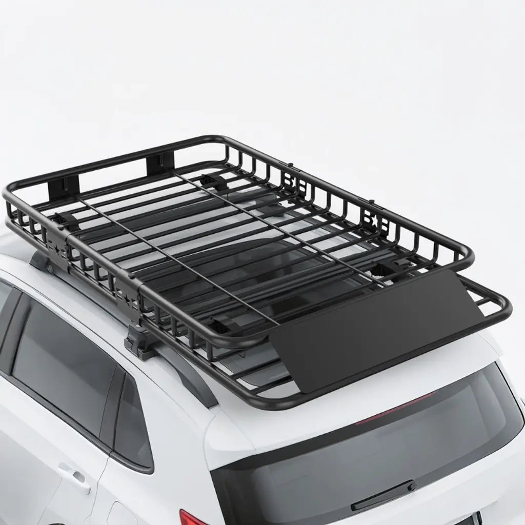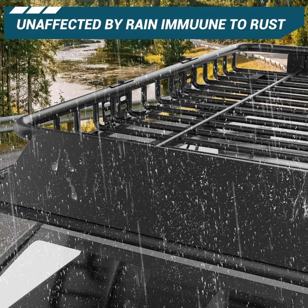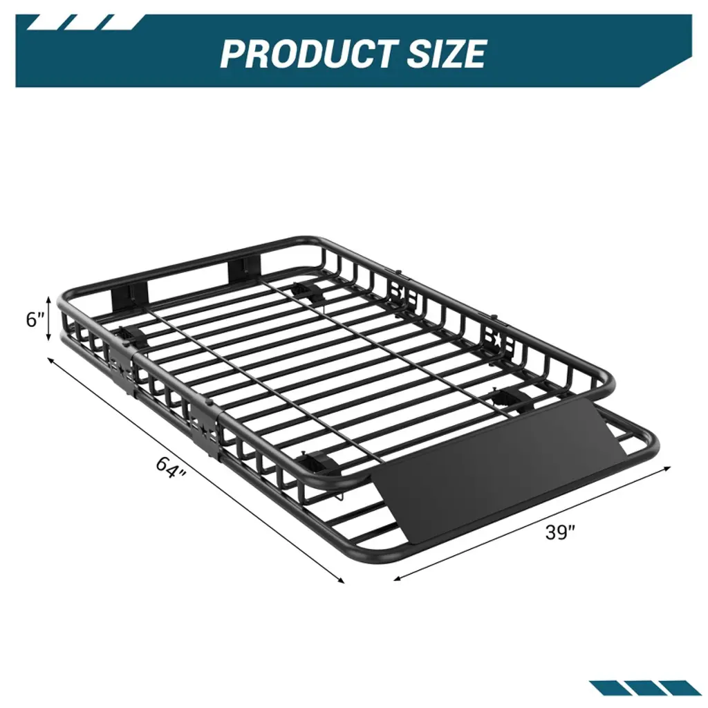 64" x 39" Universal Roof Rack Basket - 200LB Heavy Duty Cargo Carrier for SUV, Truck & VehicleKey Features:Extra-Large 200LB Capacity PlatformProvides massive additional storage space measuring 64" L x 39" W x 6" H, supporting up to 200 lbs of equipment. Ideal for extended road trips, camping expeditions, and outdoor adventures where substantial cargo space is essential.Premium Weather-Resistant ConstructionBuilt with heavy-duty steel and finished with advanced powder coating plus electrophoretic technology for exceptional resistance against rust, corrosion, and harsh weather conditions. Engineered for maximum durability and long-term performance.Universal U-Bolt Mounting SystemFeatures four universal U-bolts for quick and easy installation on most factory and aftermarket crossbars. Compatible with cars, SUVs, trucks, and RVs (requires existing crossbars for proper mounting).Enhanced Safety and Wind ProtectionReinforced with structural bottom metal bars and side rails to ensure cargo stability during transit. Includes a steel wind deflector to reduce wind resistance and protect contents, plus reflective stickers for improved nighttime visibility and safety.Professional-Grade PerformanceDesigned for heavy-duty use across various vehicles and applications. The robust construction ensures reliable cargo protection during cross-country travel, outdoor expeditions, and long-term storage needs.Specifications:Material: Steel with Powder CoatingColor: BlackDimensions: 64" L x 39" W x 6" HLoad Capacity: 200 lbsItem Weight: 44.5 lbs (20.2 kg)Mounting: Universal U-Bolt SystemCompatibility: Cars, SUVs, Trucks, RVs (with crossbars)Special Features: Wind Deflector, Reflective Stickers, Weather ResistantMetric Dimensions: 162.6 cm L x 99.1 cm W x 15.2 cm H