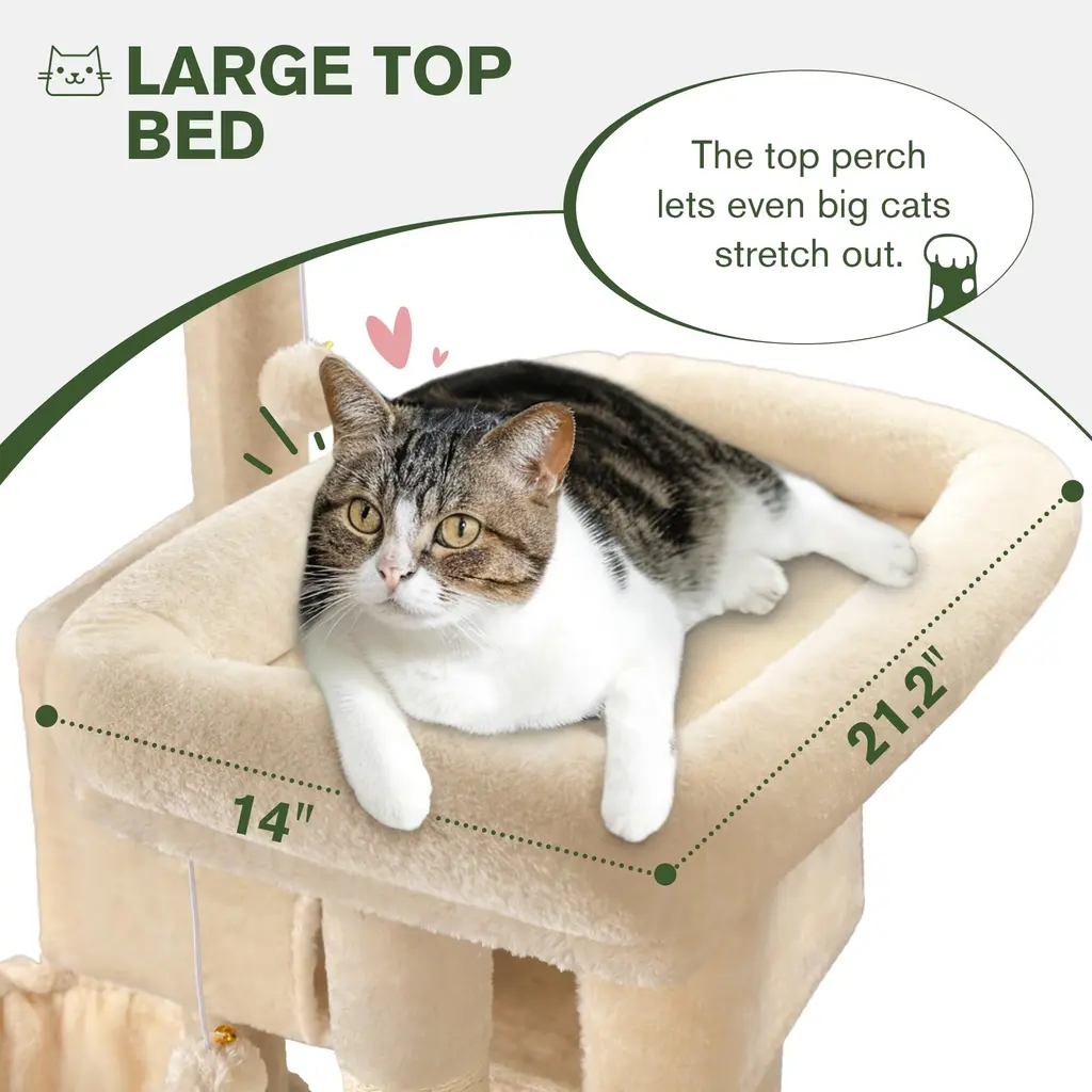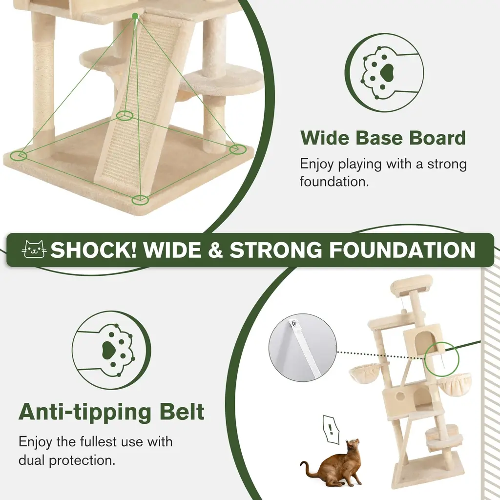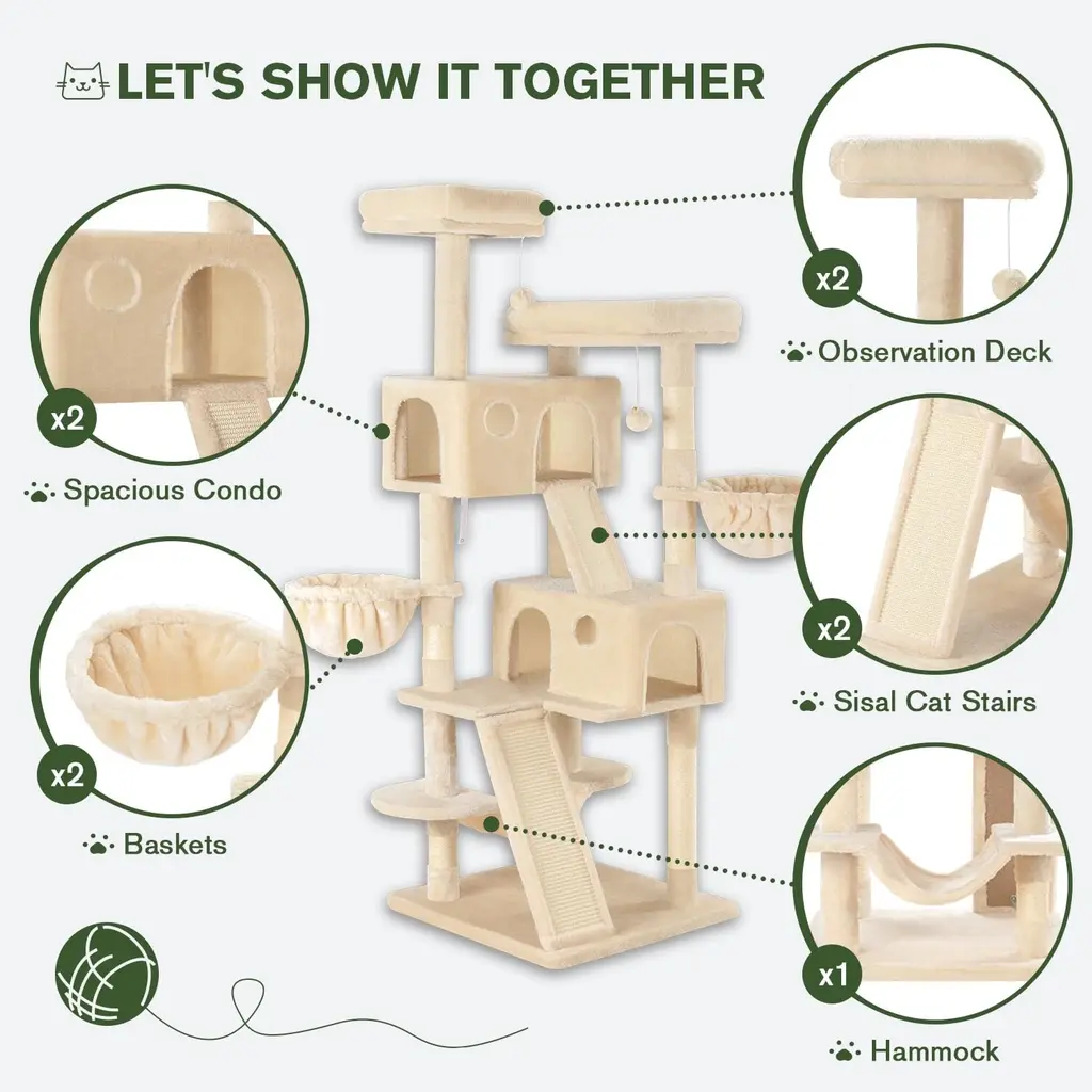 66" Multi-Level Cat Tree Tower/plush Perches/sisal Scratching Posts/hammock & Baskets/cat Activity Center Play House/wide Base - Beige