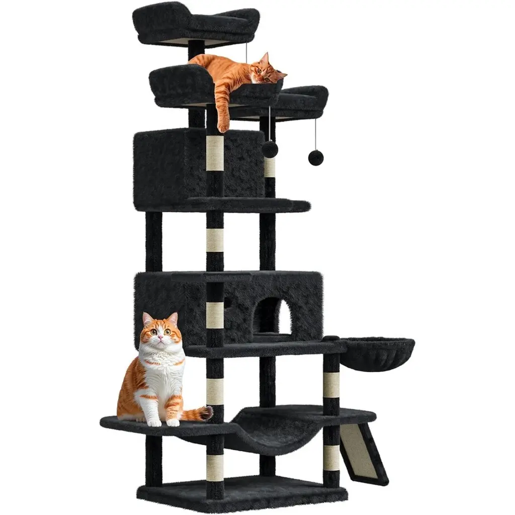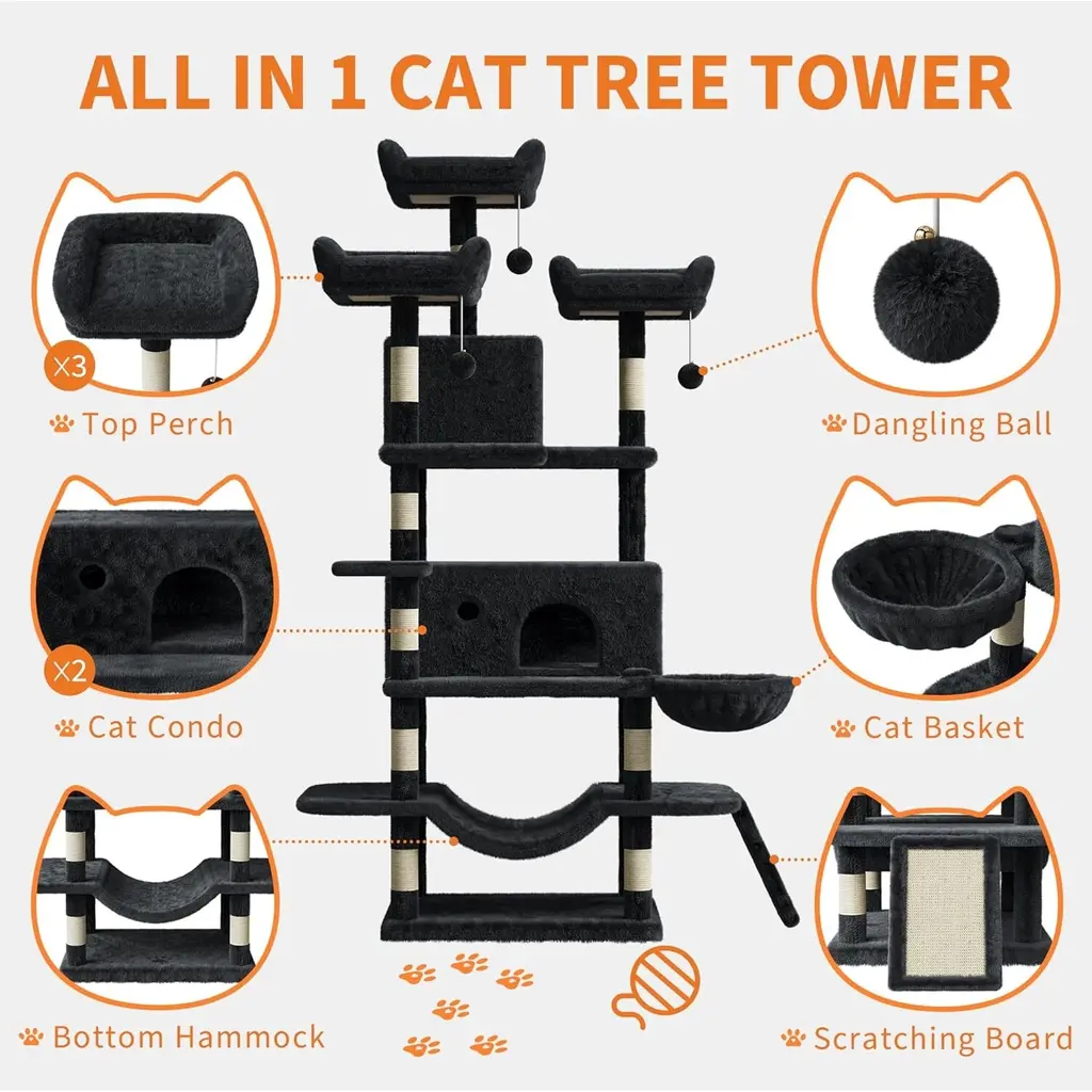 68.5'' Large Cat Tree, Heavy Duty Cat Tower With Condo, Plush Perches, Sisal Scratching Posts, Hammocks, Basket, - Black - 2604