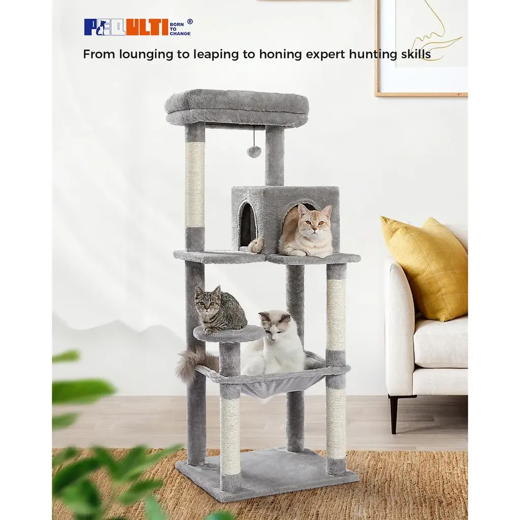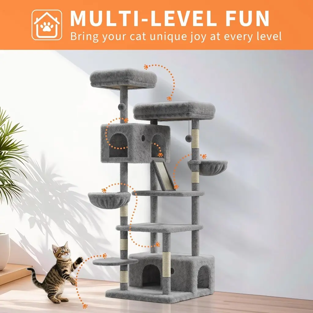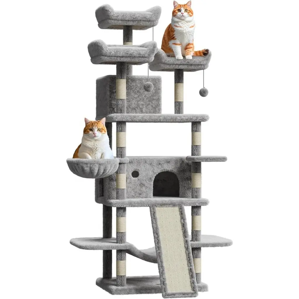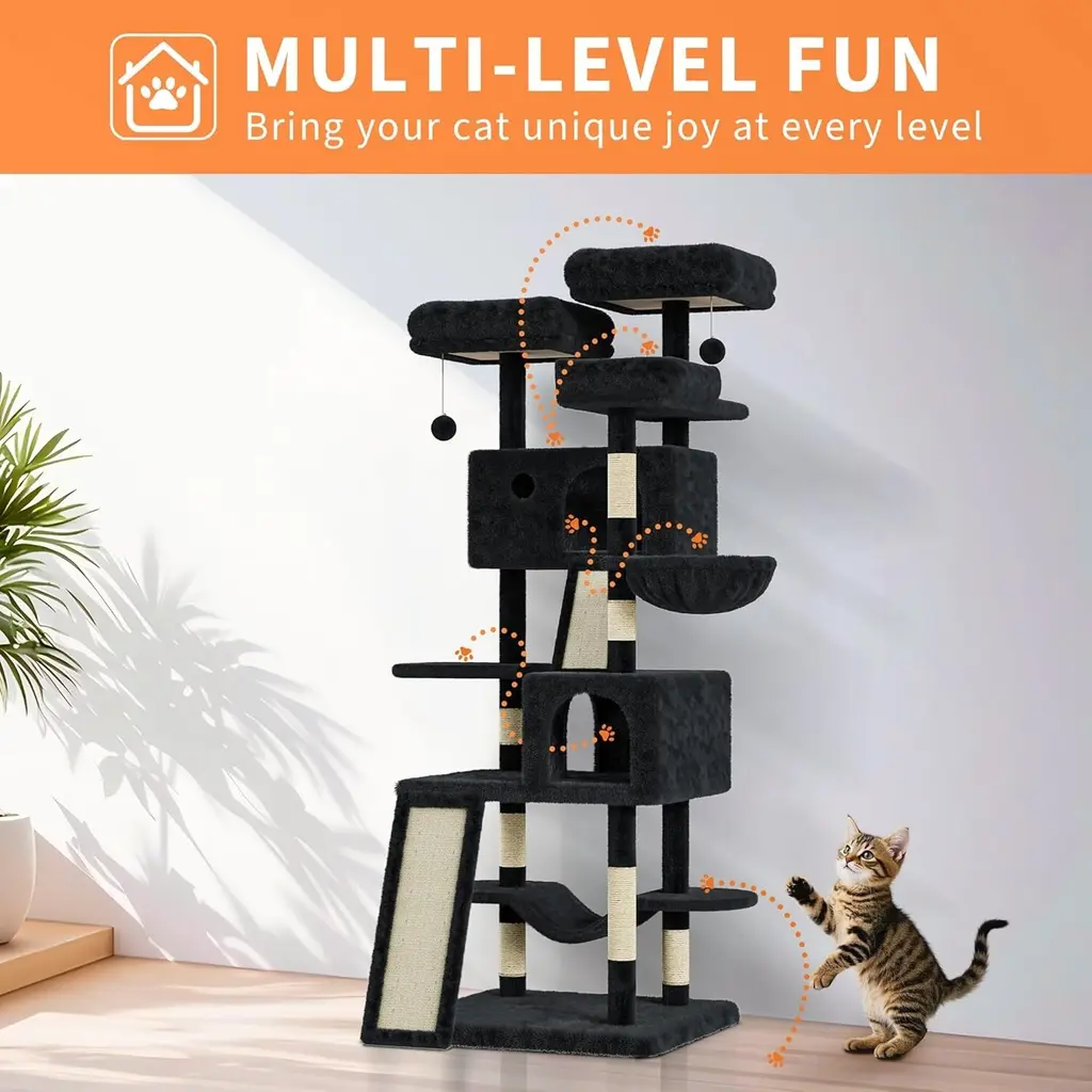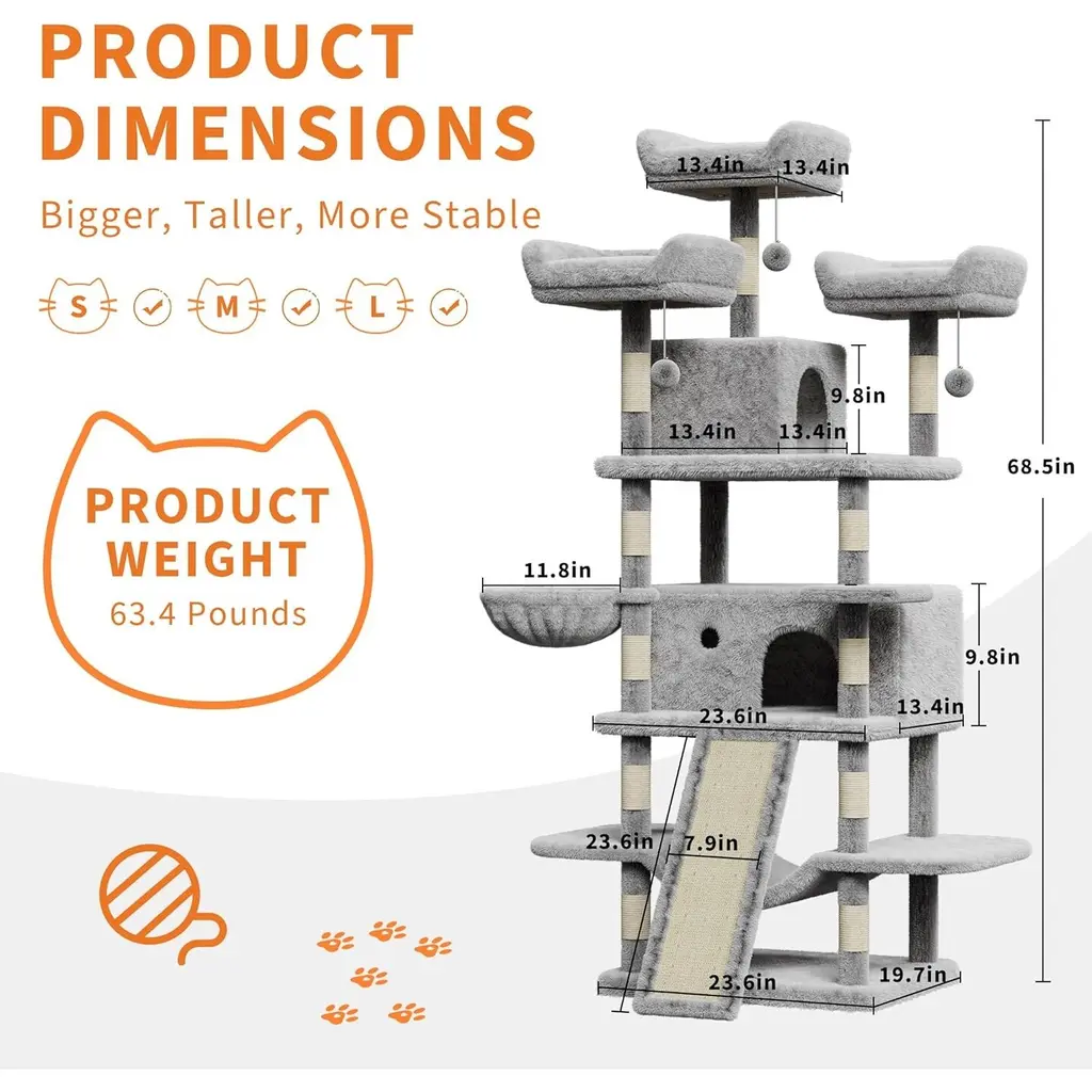[BUILT FOR LARGE CATS (20+ LBS)]: Designed for large cats, this heavy-duty tower easily supports pets 20 pounds or more. The sturdy design ensures that even the most energetic cats can enjoy climbing and scratching without worry. Perfect for big cats who need room to move and play. [Thoughtful Multi-Level Design for Active Cats] Standing at 68 inches tall, this cat tree offers multiple levels of platforms, hammocks, and perches, providing cats with plenty of opportunities to climb, rest, and play. The design encourages natural cat behaviors such as scratching, jumping, and resting, while still blending seamlessly into your home. [INTERACTIVE FEATURES FOR FUN]:] Featuring a hanging ball, sisal-covered scratching post, cozy basket, and private condo, this cat tower has a variety of fun features that will keep your cat entertained for hours. From scratching to resting, it provides everything your cat needs to stay active, healthy and happy. [QUALITY MATERIALS, DURABLE]:] This cat tree is made of high quality engineered wood covered in soft faux fur and comes with durable sisal rope as a scratching post to stand up to heavy use. These materials are both sturdy and comfortable, providing a safe and secure environment for your pet to enjoy for years to come. [EASY INSTALLATION WITH CLEAR INSTRUCTIONS]: With the included instructions, assembling this cat tree is a snap. You can have it assembled in just one to two hours. Just follow the instructions and your cat's new playground will be ready.