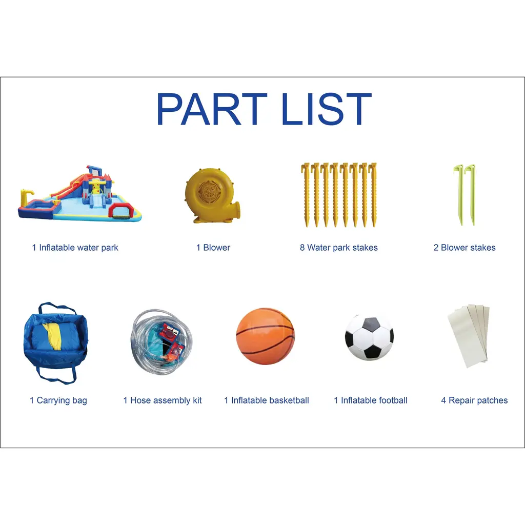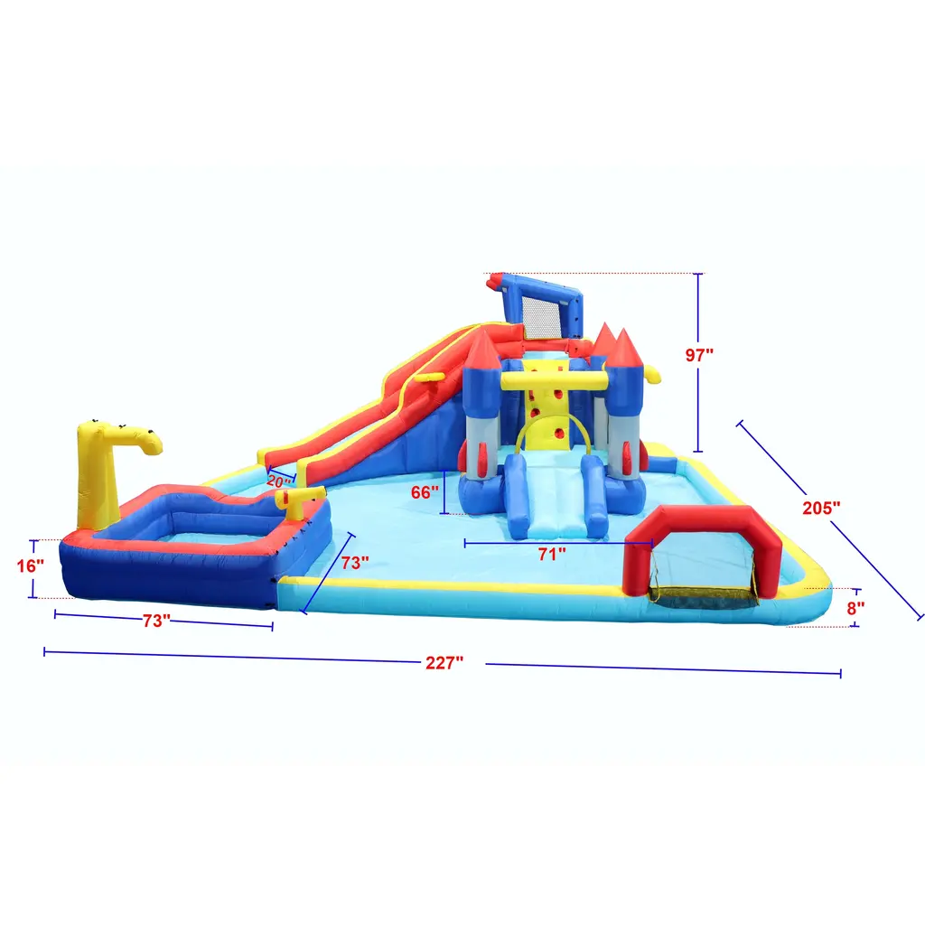 Specifications: Rich product package: This inflatable water park is the perfect gift for kids, especially during the season of outdoor fun. Set it up in your backyard and provide your kids with their very own party entertainment. Multiple children can play together in this inflatable castle, with a capacity of approximately 2-4 kids. They can jump, slide, tumble in the pool, or play basketball in the water. They can fully unleash their energy and enjoy endless fun. Safety is a priority when it comes to products for children. This inflatable facility is made of high-quality fabric and PVC lining, which are wear-resistant and durable. The powerful blower continuously supplies air to keep the play castle inflated, allowing children to play freely. With a rich package of accessories, we have considered every detail. Ground nails are included to secure the playhouse, water pipes for spraying, a storage bag for convenient storage, and a repair bag for any accidental damage. The complete and considerate design ensures that this bounce house and its joy remain long-lasting. Setting up and storing this inflatable castle is quick and easy, taking only a few minutes without occupying too much space. The unfolded overall dimensions of the product are 227*205*97 inches.