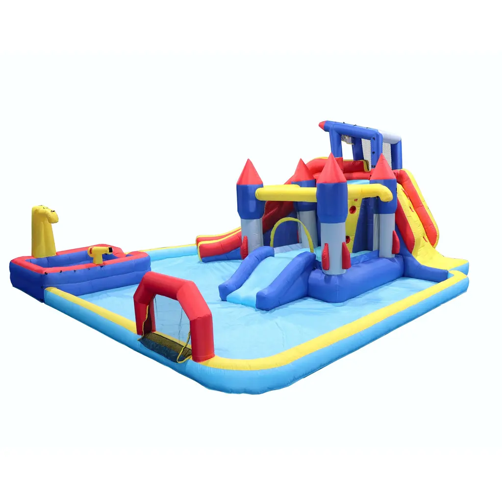 7-In-1 Inflatable Water Park: Slide, Trampoline, Bouncing House, Splash Pool, Water Gun, Basketball, Climbing Wall - Multi