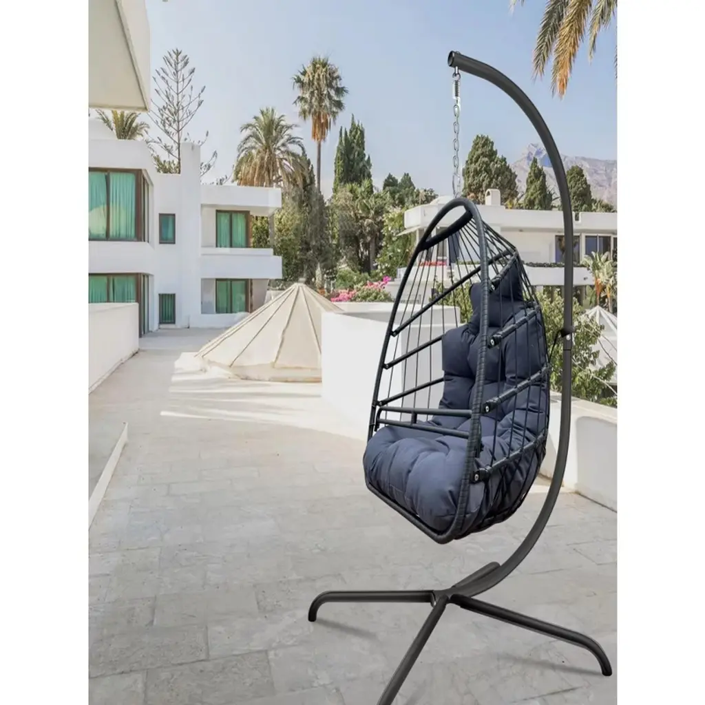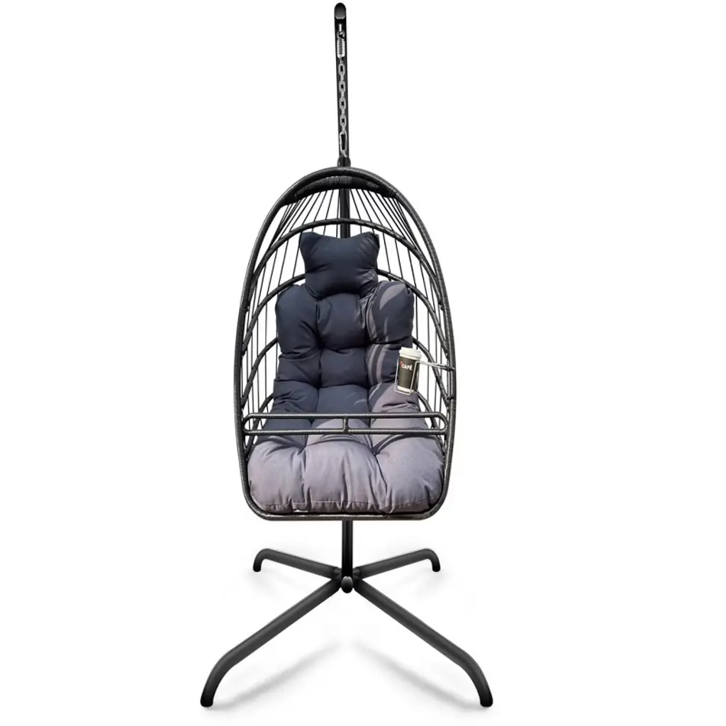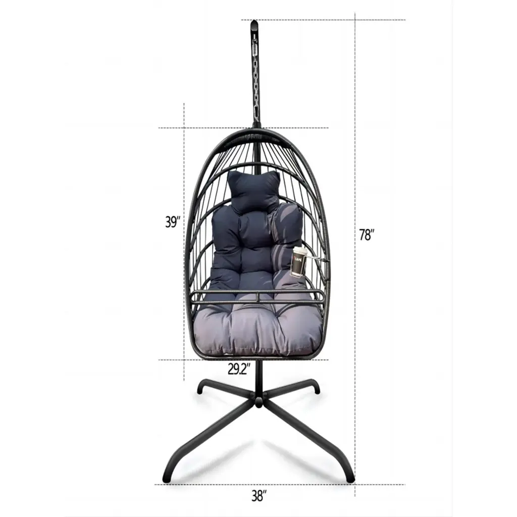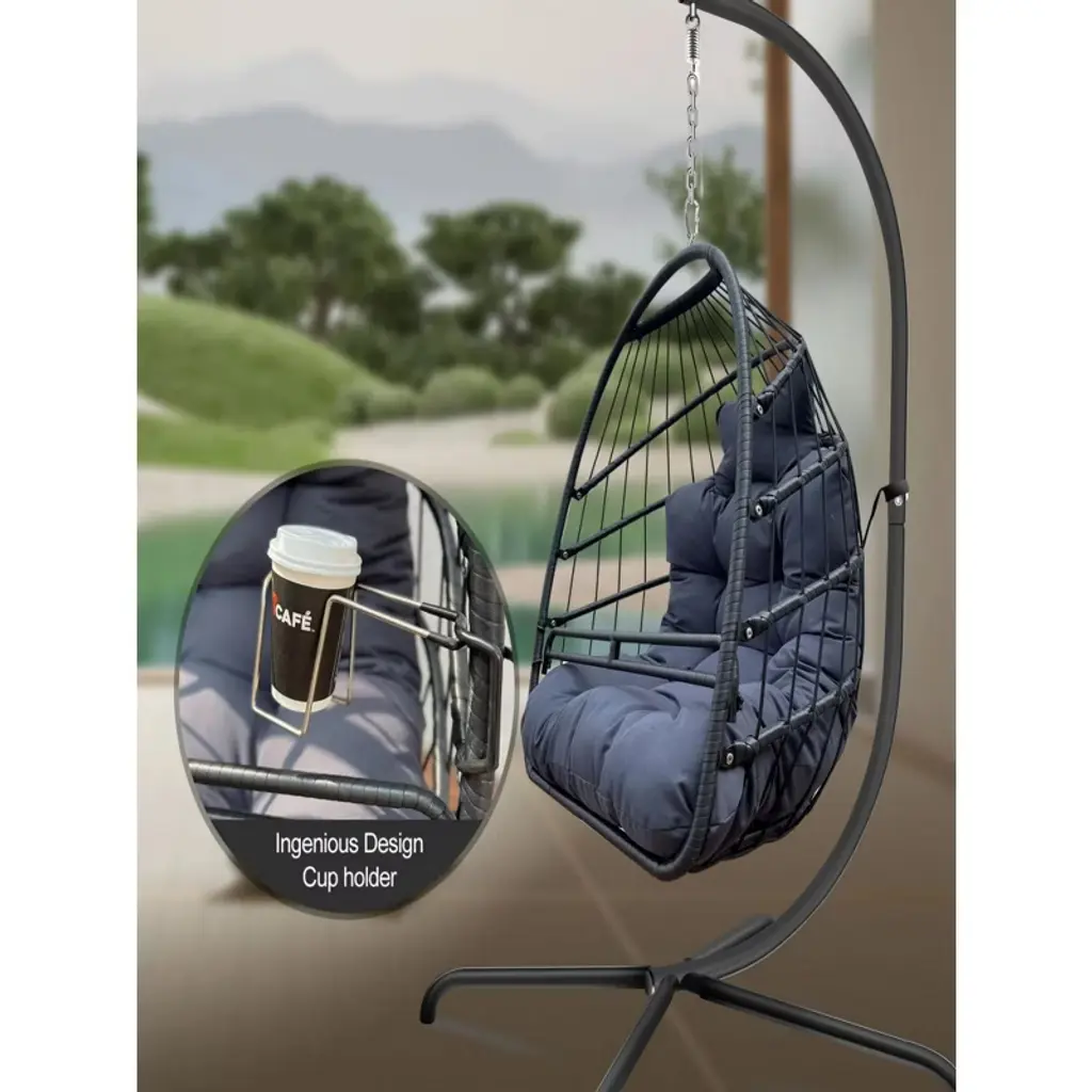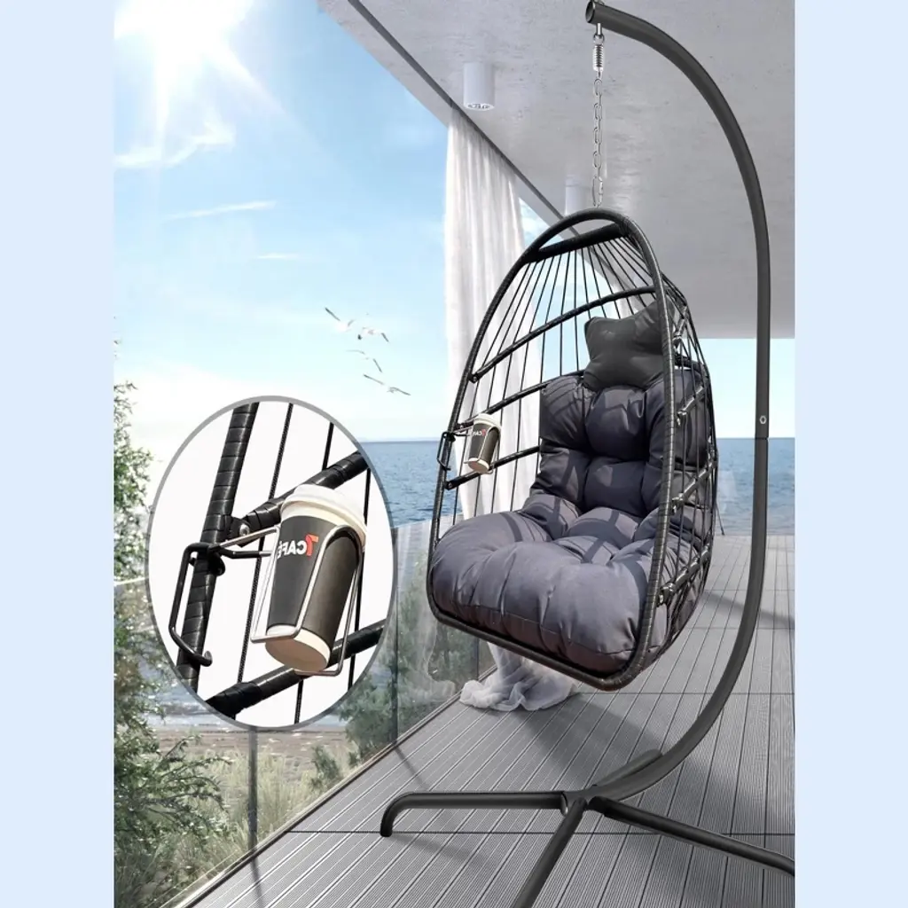 Stylish Black Outdoor Egg-Shaped Hanging Chair: The Perfect Blend of Safety and Comfort Searching for a home item that adds both fun and comfort to your life? This black outdoor egg-shaped hanging chair is the ideal choice. With dimensions of 38×38×78 inches and weighing 50 lbs, it has an impressive weight capacity of 350 lbs. It seamlessly combines stylish design with practical functionality, becoming a unique highlight in both indoor and outdoor spaces. The detachable guardrail and cup holder are its distinctive features. The guardrail creates a safe and joyful play area for children and can be easily removed when adults use the chair. The cup holder is convenient for adults to place their drinks while reading or sipping coffee, allowing them to enjoy a carefree time. Built to last, it features a powder-coated metal frame that resists rust, paired with rattan resin wicker that offers up to 3 years of anti-aging protection. The 304 stainless steel hooks and 4-point support stand ensure safety and reliability. The ergonomically curved mid-back, combined with soft UV-resistant thick cushions and pillows, perfectly contours to your body, effectively relieving pressure on the head and spine. The foldable design not only prevents children from playing unsupervised but also makes transportation and storage a breeze. Assembly is a cinch, with all necessary accessories included in the box. One person can complete the installation in just a few minutes, and moving it around is effortless. Whether it's a surprise gift for kids on Christmas, New Year, or other holidays, or a cozy addition to your personal relaxation corner, this hanging chair meets all your needs.