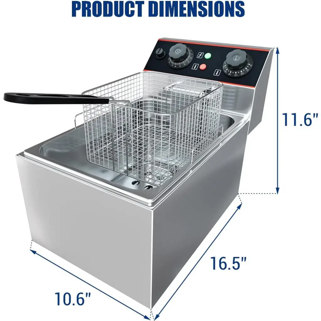 Acekool’s 6L Commercial Deep Fryer offers dependable frying power for home cooks, small restaurants, and snack stands. The 6L oil tank and included basket make it easy to prepare several servings at once, saving time and effort during busy prep. The 1500W heating element quickly brings oil up to temperature and keeps it steady, ensuring each batch turns out crisp and appetizing. Adjustable temperature control from 140°F to 392°F covers a wide range of recipes, and an auto shut-off at 464°F adds extra care. Stainless steel design, a removable basket, and easy-drain features simplify cleaning and maintenance. The splash guard lid and cool-touch handle help protect your hands, while the compact design fits most countertops. Specifications Oil Tank Capacity: 6L (5.44QT)Heating Element Power: 1500WTemperature Range: 140°F–392°F, auto shut-off at 464°FFeatures: Removable basket and tank, stainless steel body, splash guard lid, cool-touch handleDimensions: 10.6 x 16.5 x 11.6 inchesApplication: Home kitchen, restaurant, food truck, snack bar