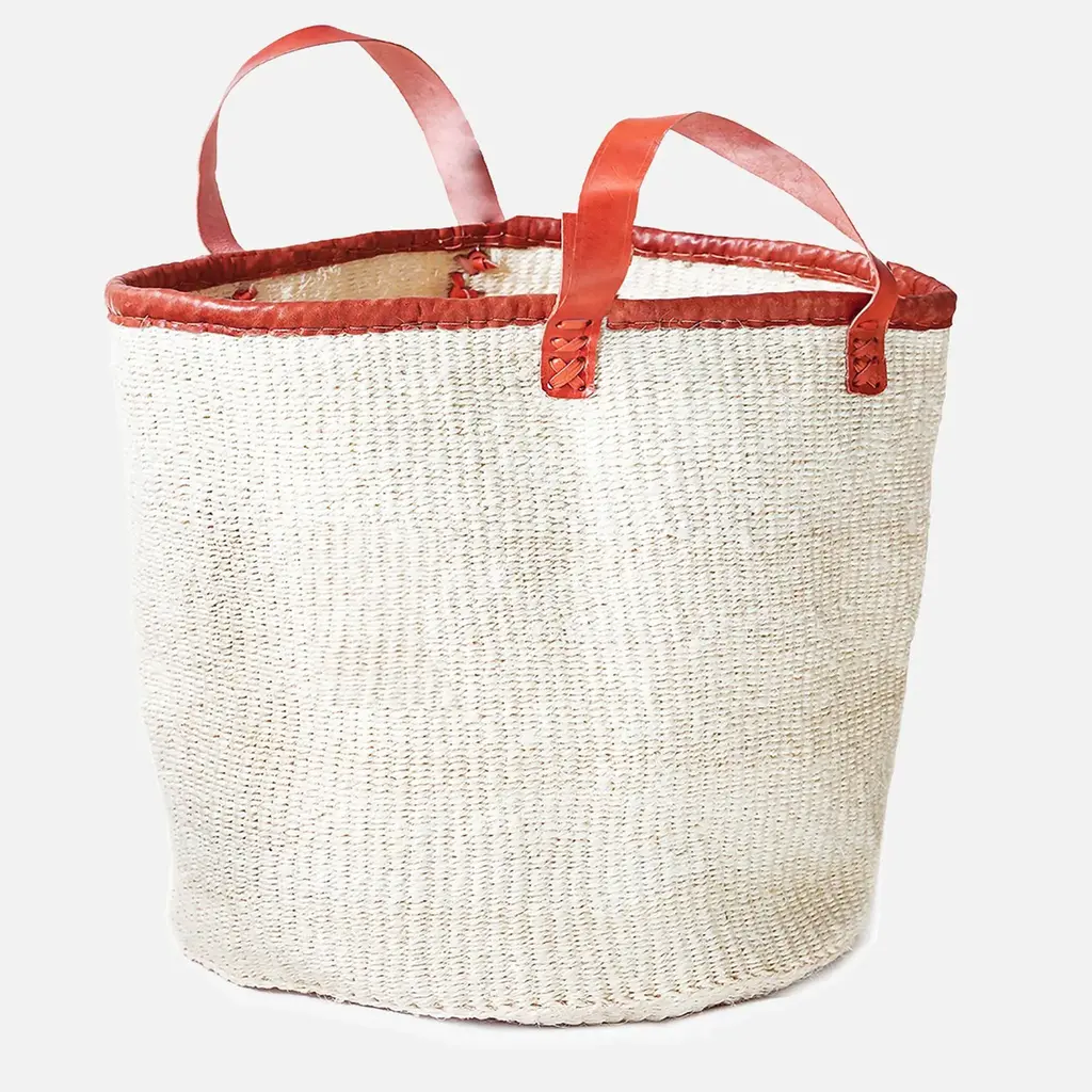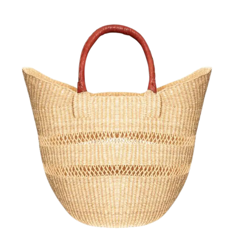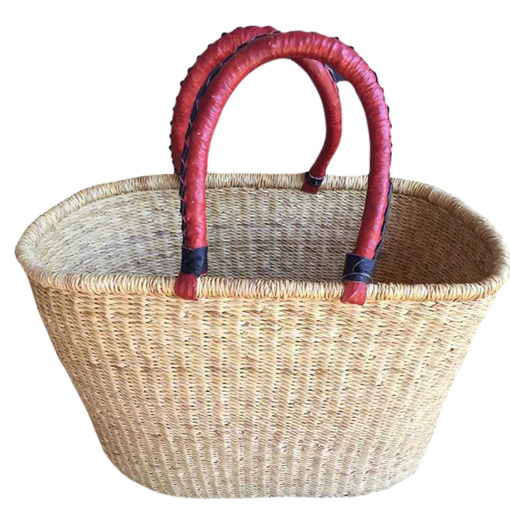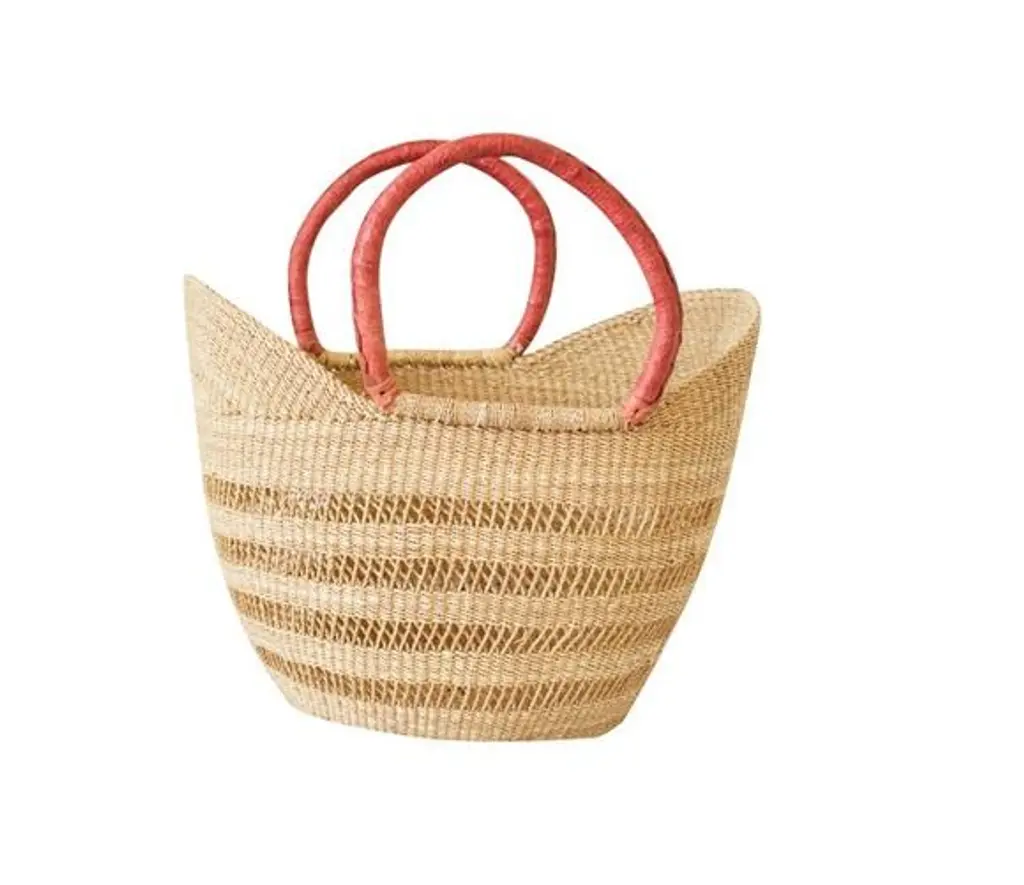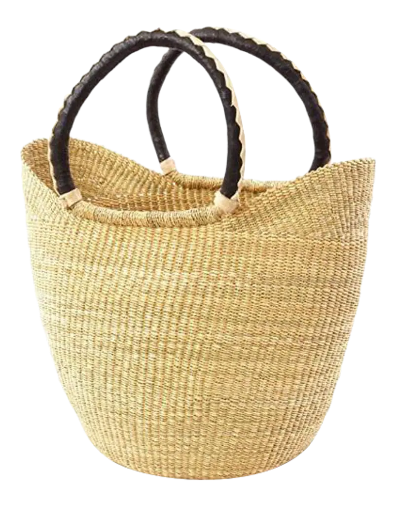 Artisans in the Bolgatanga region of Ghana weave these beautiful and durable baskets from thick, tough elephant grass. A popular choice among green shoppers, busy mothers and picnic planners worldwide, Bolga baskets stand up to use and abuse and remain functional and beautiful for years. Materials: elephant grass, leather Approx.15"-16" May have slight variations in size as this is a one-of-a-kind handmade product Care: easily reshape your basket by lightly spraying with water, press into shape by hand, then let dry This item is fairly made in Africa. Each artisan is able to work under a community cooperative. The fair payment they receive will not be reduced by traveling expenses, childcare costs or haggled prices. The artisans use their earnings to put food on the table and pay educational expenses for their children.