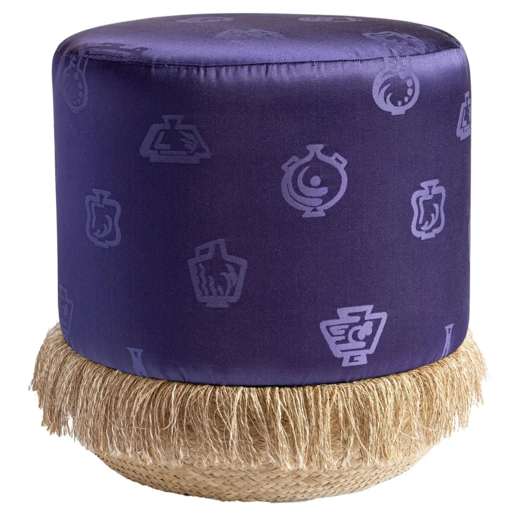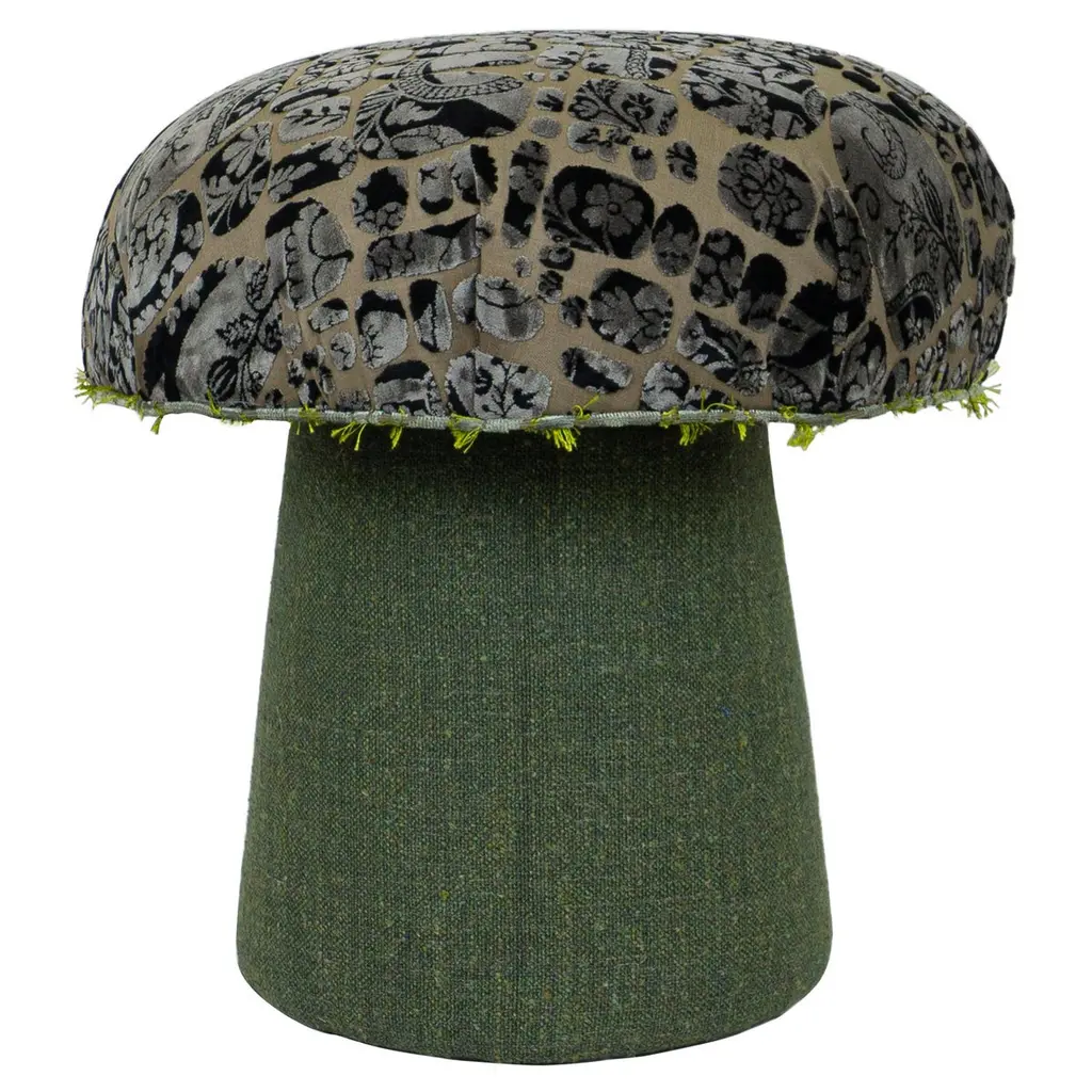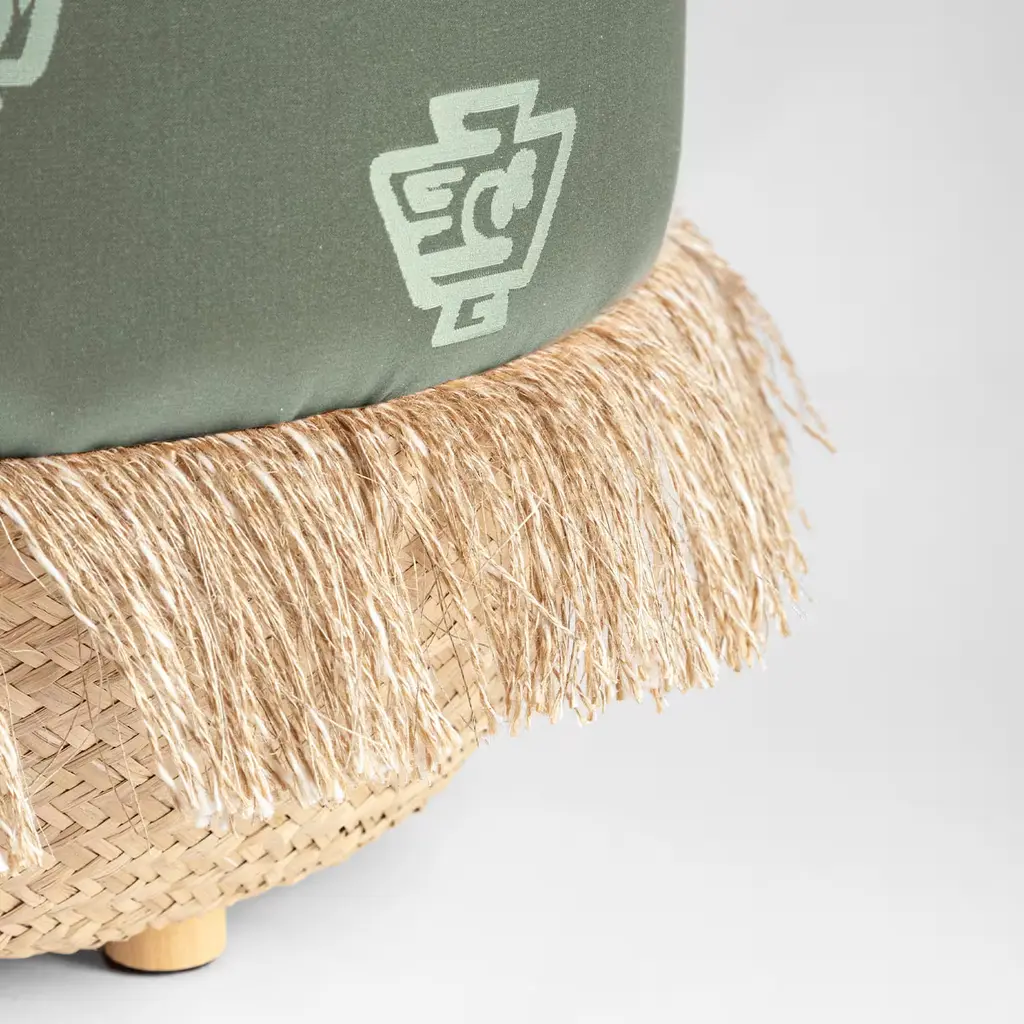 This pouf showcases the Alchimia pattern, designed by Gio Ponti, in a sage green colorway. It is part of the Grand Tour poufs by Vito Nesta collection. Each pouf features a soft upper part, upholstered with exclusive fabrics created for Grand Tour by the renowned Rubelli textile company. The structure is made in Veneto and distinguished by a basket base with linen fringes. Each pouf is circular, with a diameter of 45 cm and a height of 45 cm.