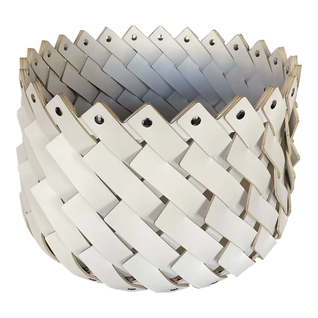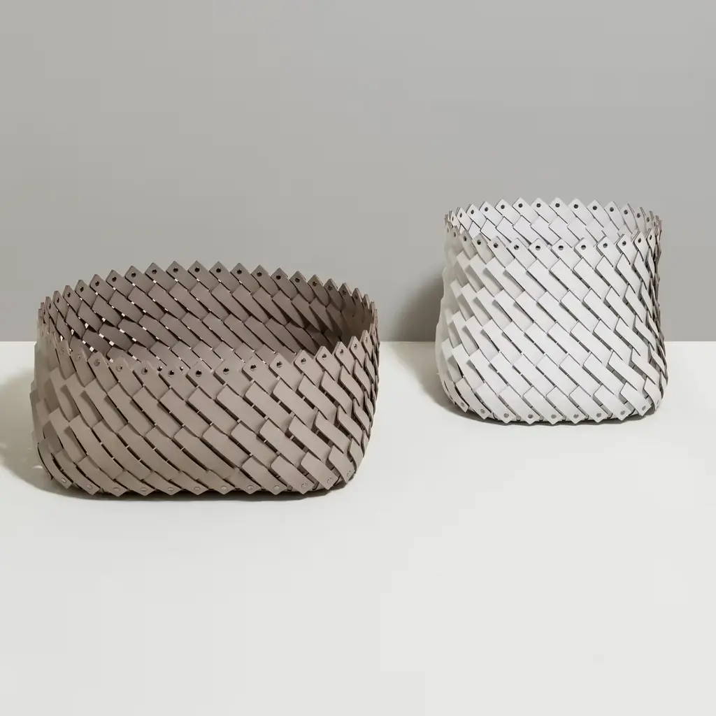 Pinetti transformed an ordinary household object into a luxurious accent piece in a recognizable, sought-after style. Part of the Almeria series, this basket is fashioned of white eco-friendly leather using straps that are hand-woven diagonally in a medium-size and square silhouette. The strips are fixed on top with a polished metal stud and create an elegant jagged rim. Available in other neutral colors of the Antibes series, this basket can be personalized with leather handles upon request. It is suitable for both indoor and outdoor use.