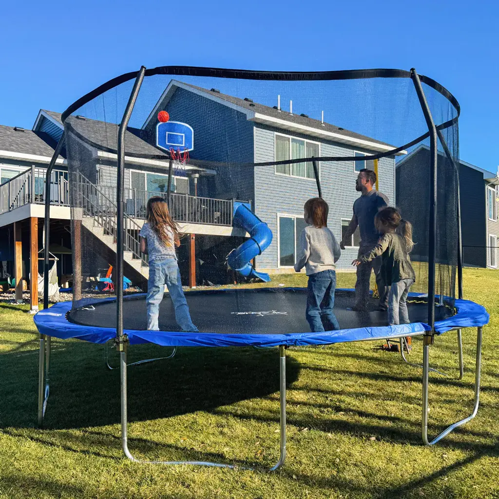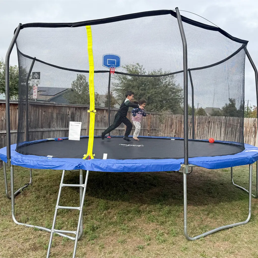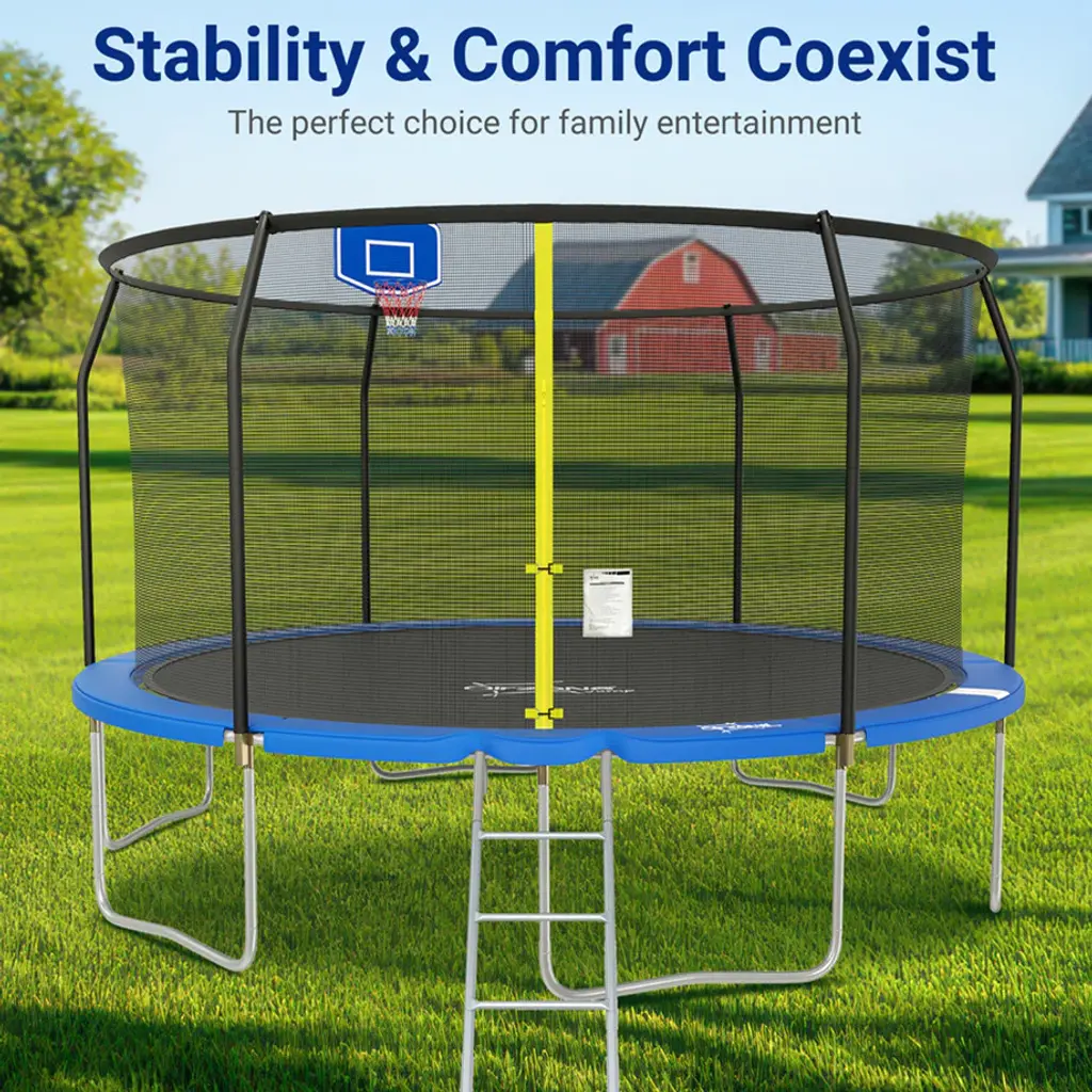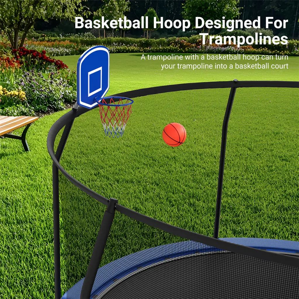 Unleash endless fun and laughter in your backyard with our next-gen trampoline, designed for ultimate safety with curved poles to protect your kids from accidents. ASTM compliant and featuring powerful springs for an exhilarating bounce, this trampoline comes with a sturdy ladder and durable double-sided zippers for easy, safe access. Plus, the added basketball hoop ensures unforgettable memories for the whole family, with a generous 400 lbs capacity that invites everyone to join in the joy!