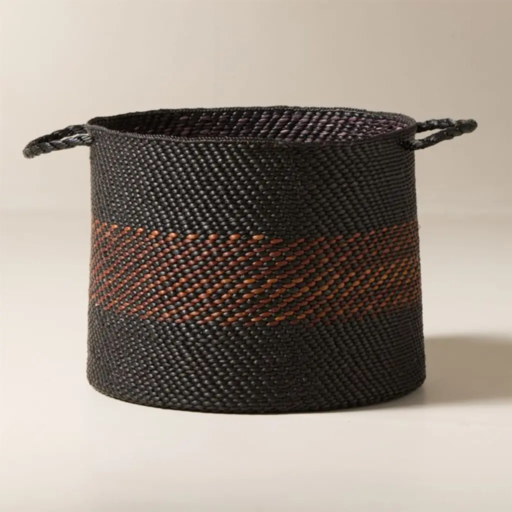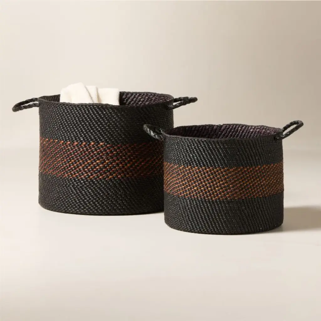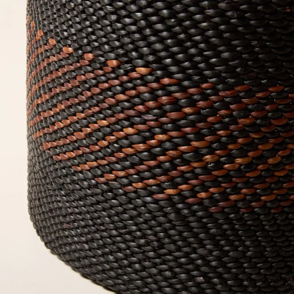 Handwoven from ilala palm leaves from the Limpopo province of South Africa, the Amara black storage basket by Mo's Crib adds a natural touch to any space. Local networks of craftspeople use traditional weaving techniques to craft the basket, dedicating two days to create the intricate dark brown patterns in the middle. Woven tightly for durability, the basket is finished with handles to easily tote it around. Due to the natural materials, each basket is unique. CB2 exclusive.Founded in 2016, Mo's Crib is a woman-owned, award-winning design company in South Africa committed to honoring traditional African craftsmanship through cultivating talent, creating jobs and producing thoughtful home decor where beauty lives in the details.