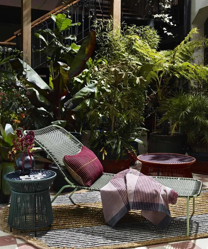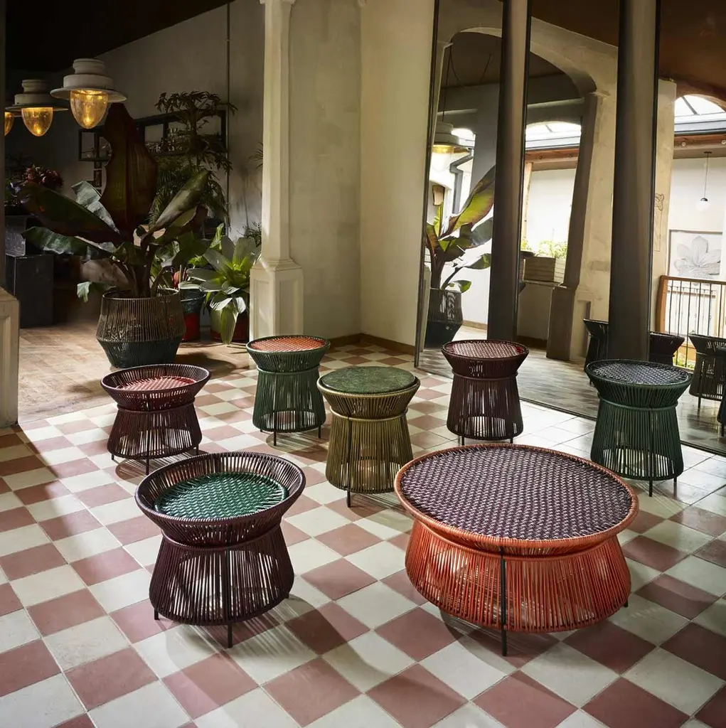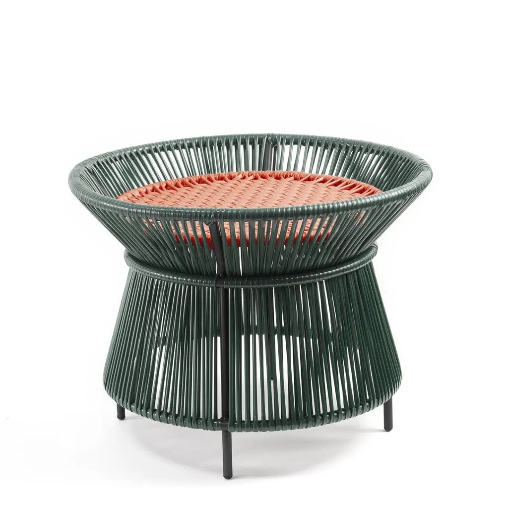 The Caribe Chic Basket Table is an elegant design by Sebastian Herkner and can be used inside and outdoors. It’s part of our Caribe Chic collection, featuring an intricate hand-woven webbing in contrasting earthy, muted shades. The pieces and colours are inspired by the incredible nature of the Colombian Huila region where the serene Tatacoa desert meets the powerful Rio Magdalena.MaterialsGalvanized and powder coated tubular steel, PVC strings made from recycled plasticColours٠ moss green/copper/black٠ dark blue/copper/black٠ black red/moss green/black٠ black red/copper/black٠ copper/black red/black٠ moss green/dark blue/black٠ black red/moss green/copper ٠ moss green/dark blue/copper ٠ curry yellow/honey yellow/pearl white٠ pastel beige/beige/pearl white ٠ beige/black/beige pink