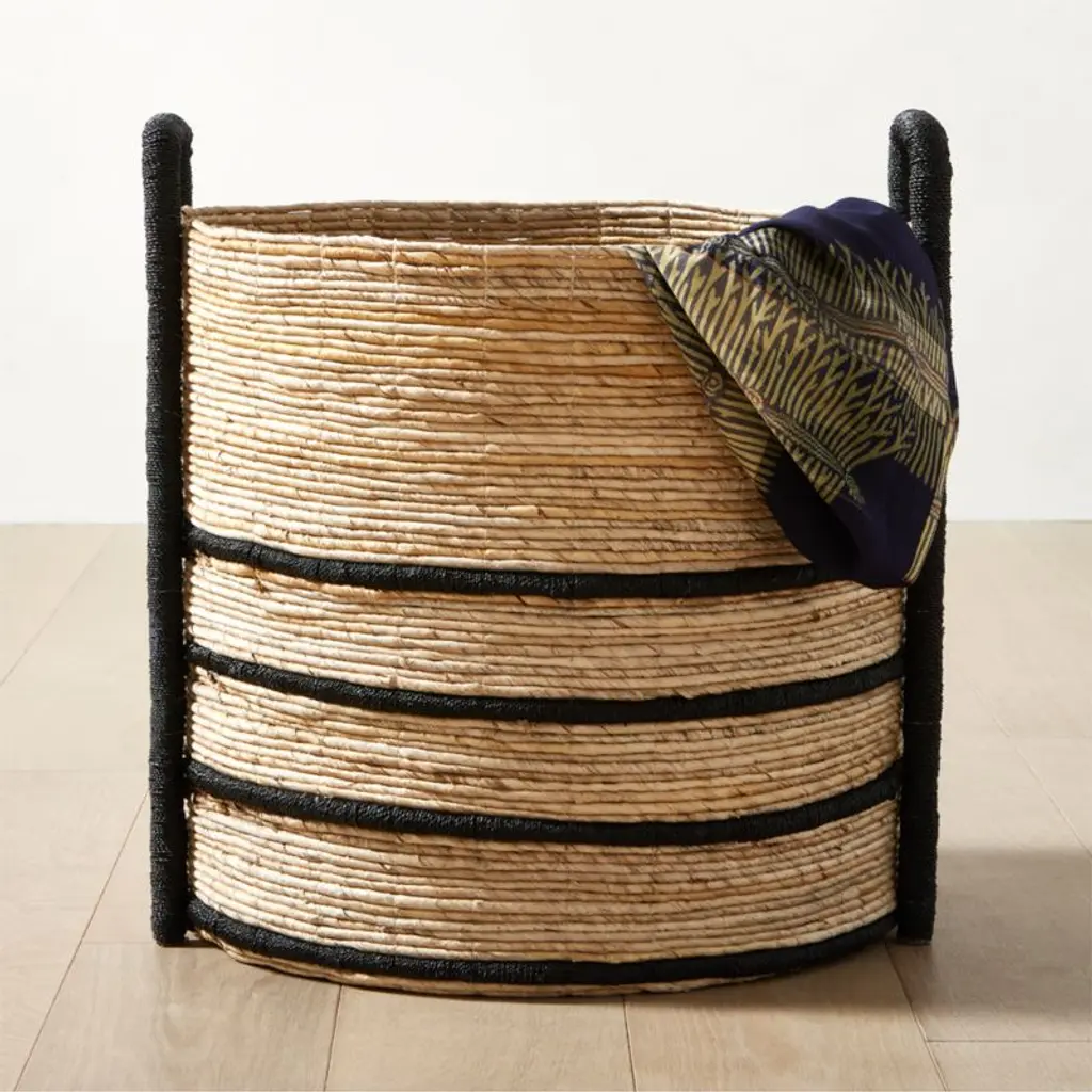 Woven by hand of natural banana bark, basket by Miami-based artist and designer Élan Byrd elevates storage through unconventional form. With high-contrast black handles and stripes, basket can also serve as an outer container for large, leafy potted houseplants. CB2 exclusive.