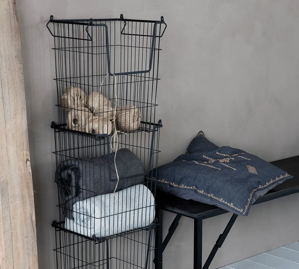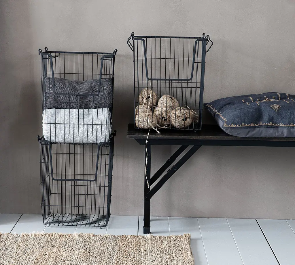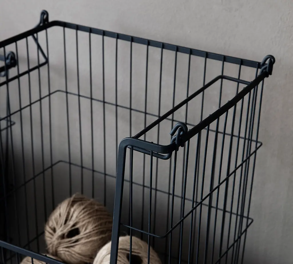 Tall vertical height, a see-through design, and side handles make this one of our favorite ways to organize our shelves. A front-facing notch opens up the basket to make grabbing something from the bottom easier, and matte black metal matches the neat and tidy vibe we want.