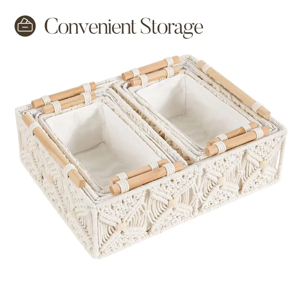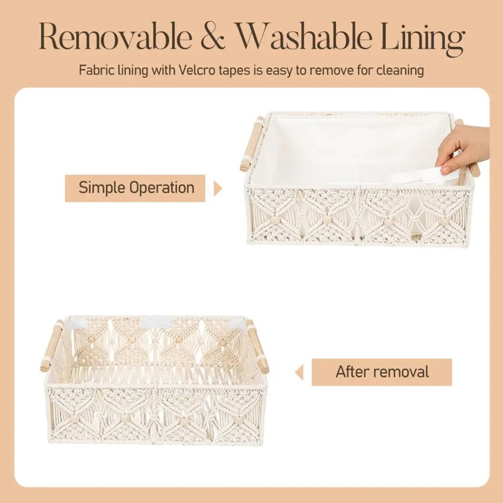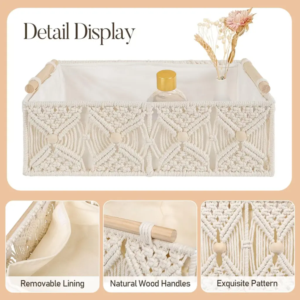 Transform your space with this set of elegant handwoven storage baskets, featuring exquisite macrame floral details and natural wooden handles for effortless organization and lifting. Thoughtfully designed with removable lining for easy cleaning and crafted from premium cotton rope with a sturdy iron frame, these baskets blend style and durability for any room. Perfect for bathrooms, bedrooms, shelves, or offices, they offer versatile storage and add a boho-chic vibe to your d¨¦cor¡ªmaking them a charming and practical gift.