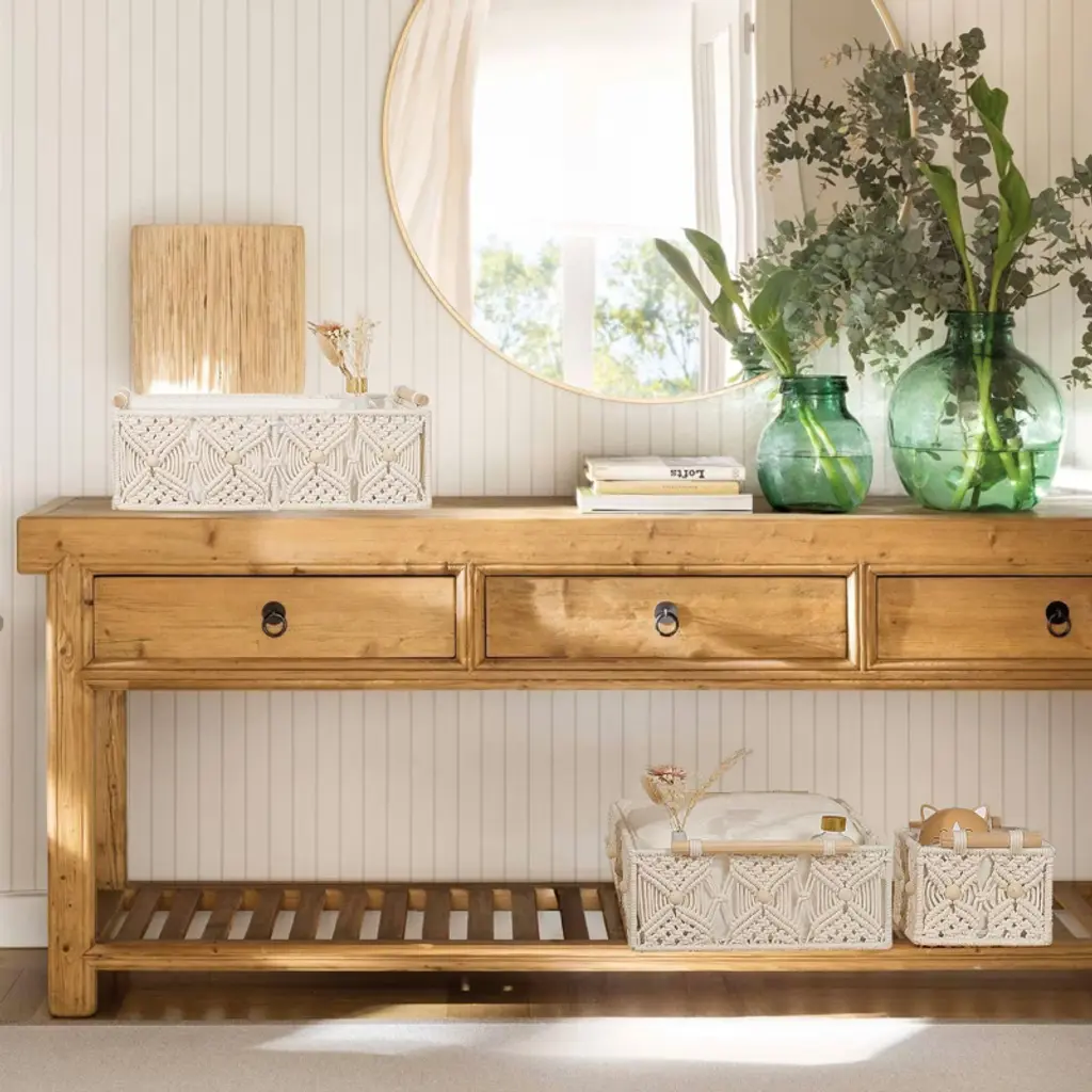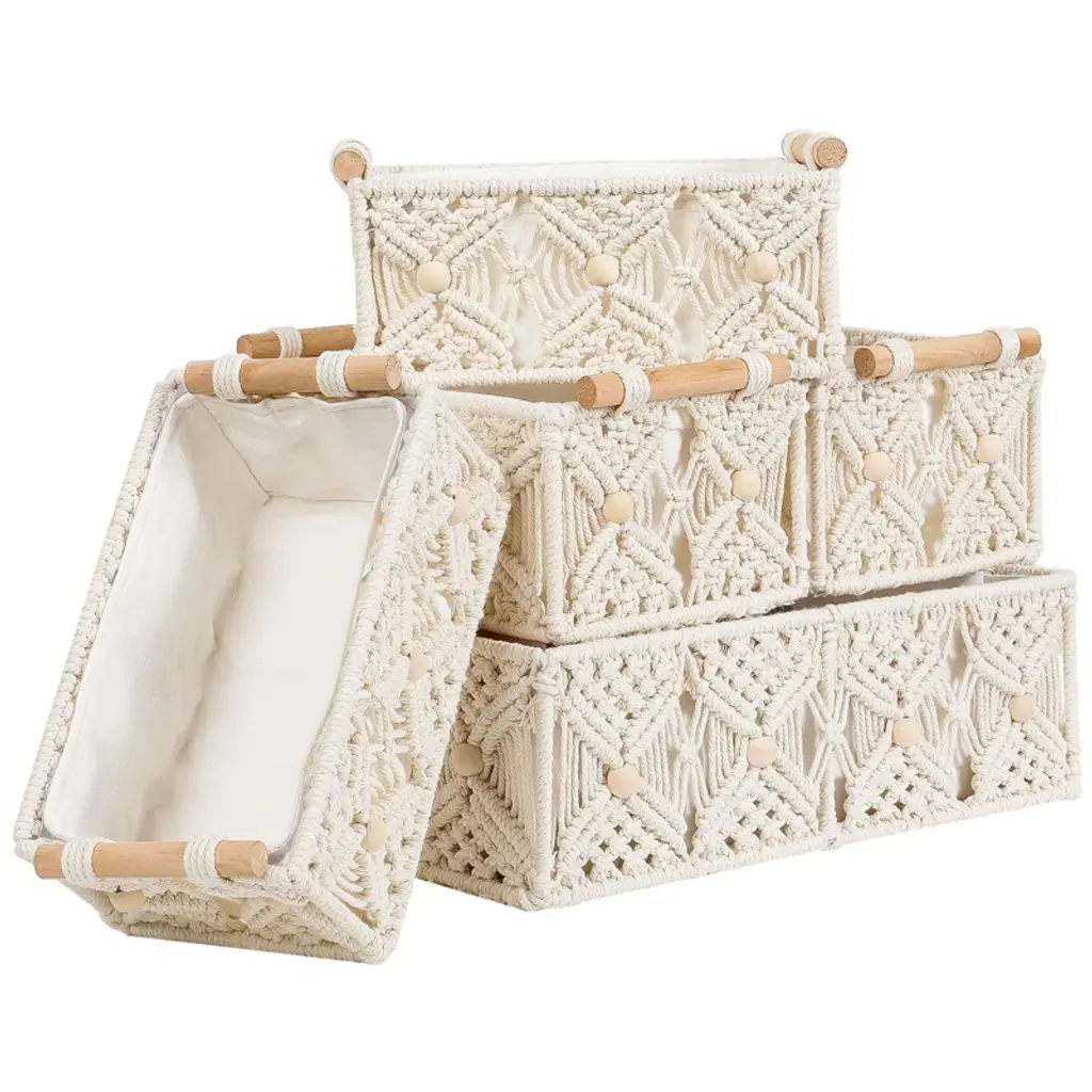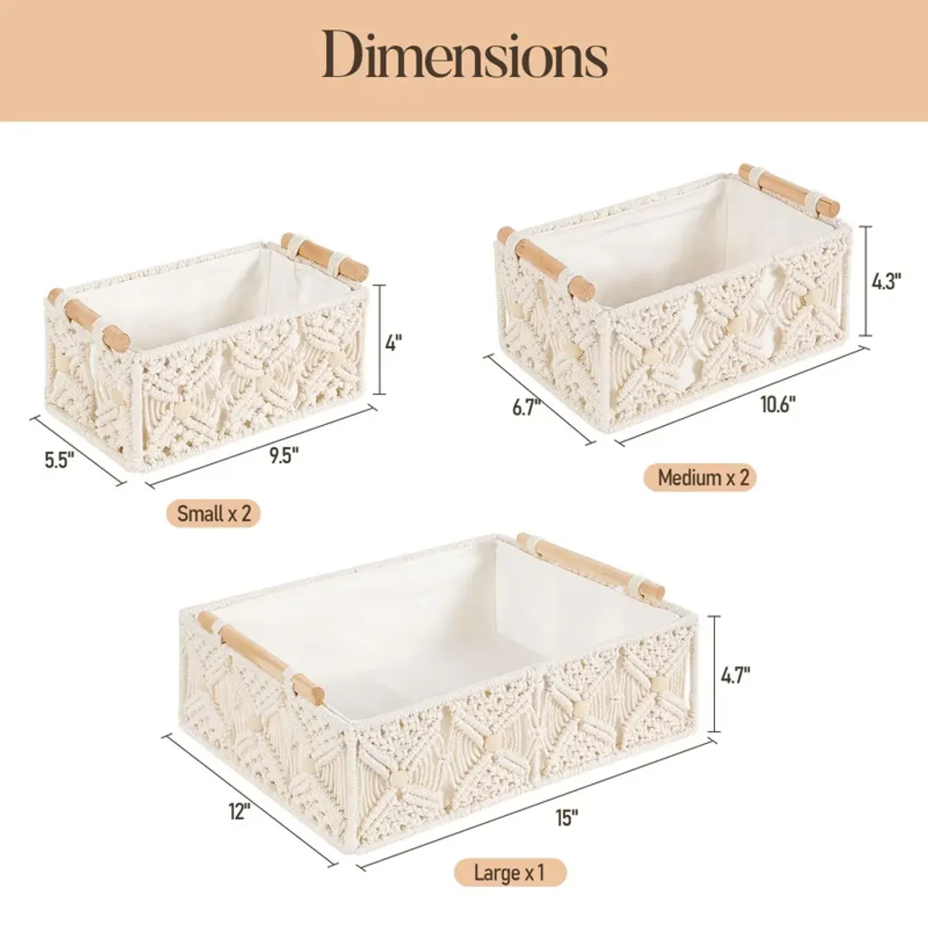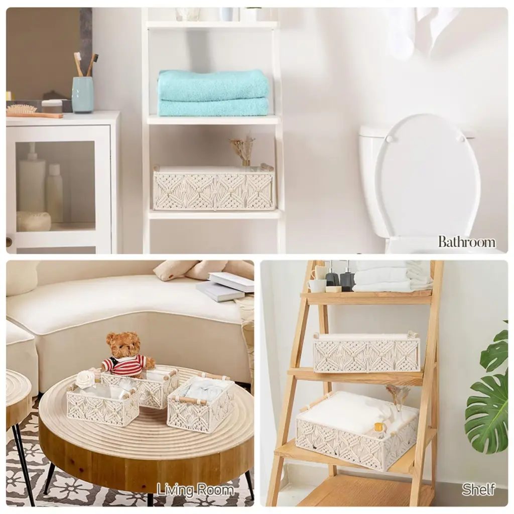 Transform your space with this set of elegant handwoven storage baskets, featuring exquisite macrame floral details and natural wooden handles for effortless organization and lifting. Thoughtfully designed with removable lining for easy cleaning and crafted from premium cotton rope with a sturdy iron frame, these baskets blend style and durability for any room. Perfect for bathrooms, bedrooms, shelves, or offices, they offer versatile storage and add a boho-chic vibe to your d¨¦cor¡ªmaking them a charming and practical gift.