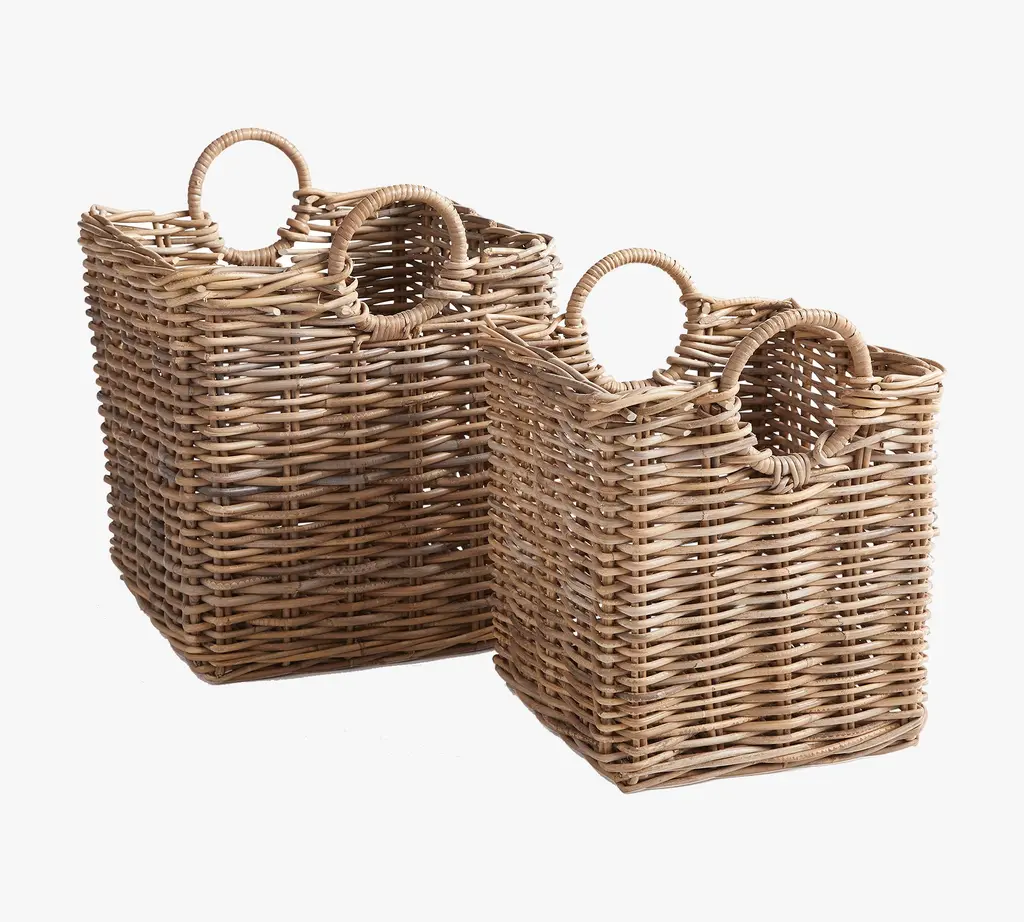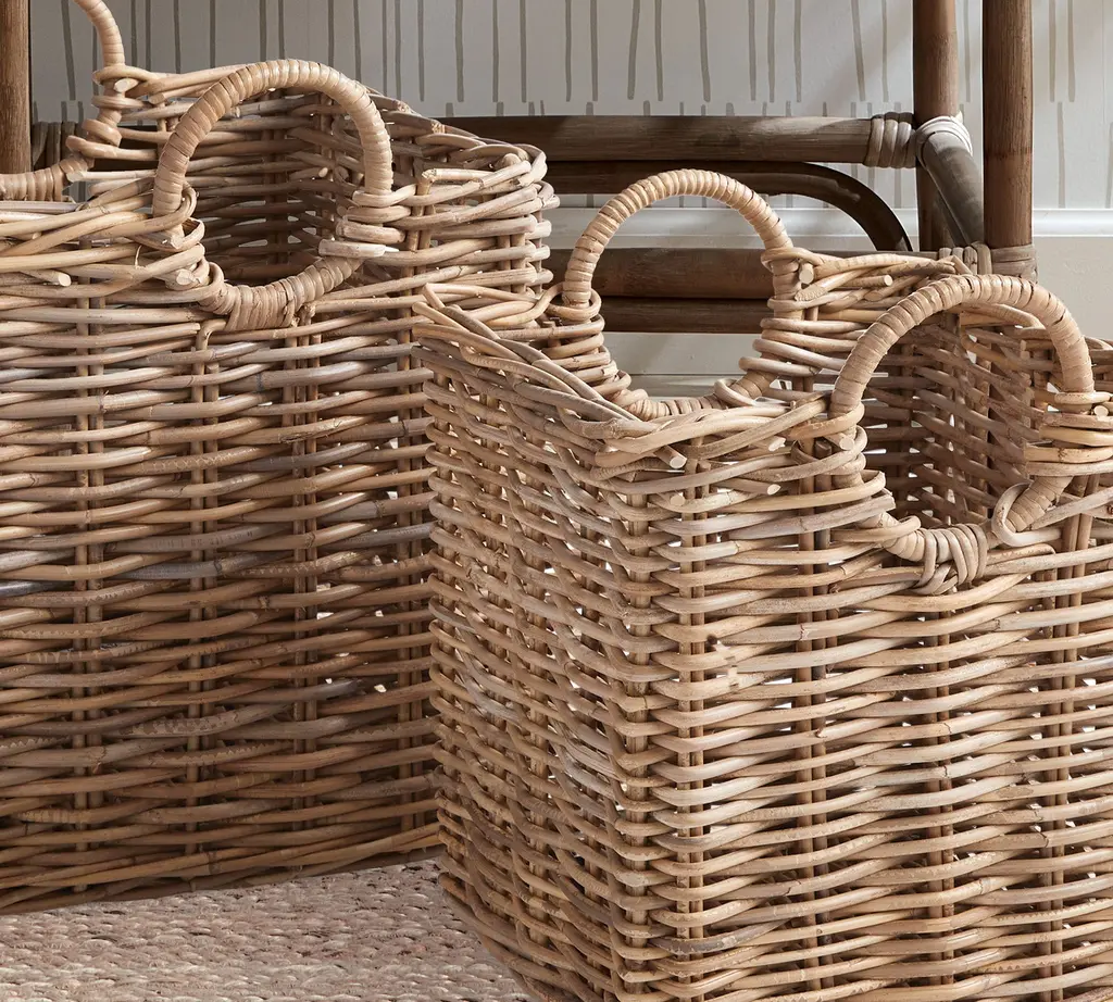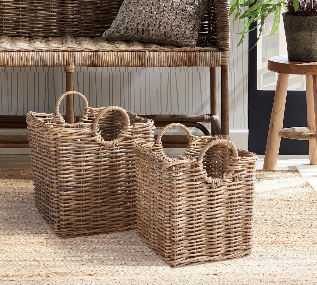 Corral clutter while adding a stylish new storage option with our set of baskets. Woven by hand of textural rattan and fit with a pair of handles for easy transport, Asheville exudes a relaxed, organic vibe. Use for laundry, slide under a console, or position on either side of a doorway.
