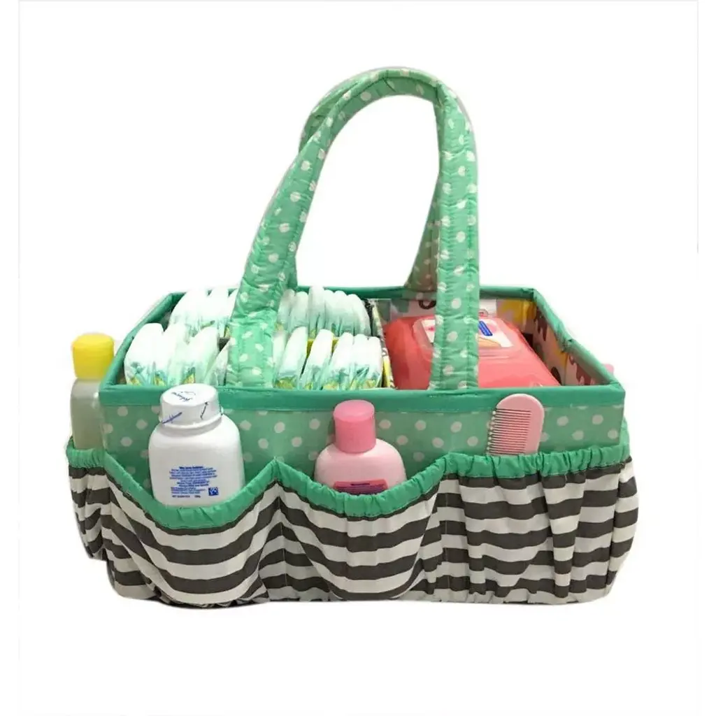 Add organization to any area of your home with the portable Nursery/Toddler Storage Caddy by Bacati. Perfect for dressers and changing stations, this lightly padded caddy has 8 outer pockets and a removable "T" separator for maximum versatility. The soft cotton percale fabric with stiffner inside keeps the shape intact, lining and handles feature a padded with polyfilled and cordinating trim. Keep diapers, wipes and other necessities tidy while traveling from room to room. Caddy also functions as an organizer for crafts, picnics, pet supplies, etc. Measures 12.5 in x 6.25 in x 8.5 in.