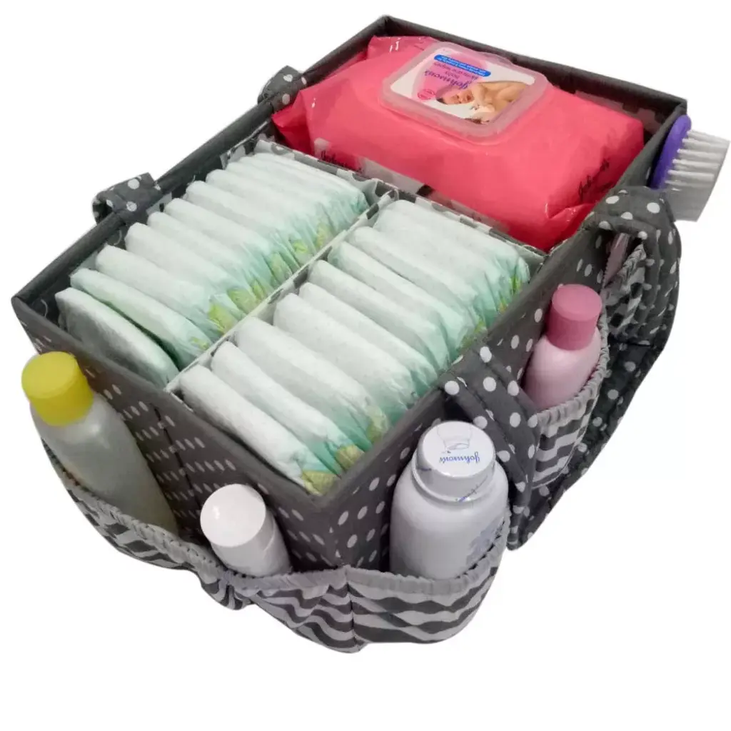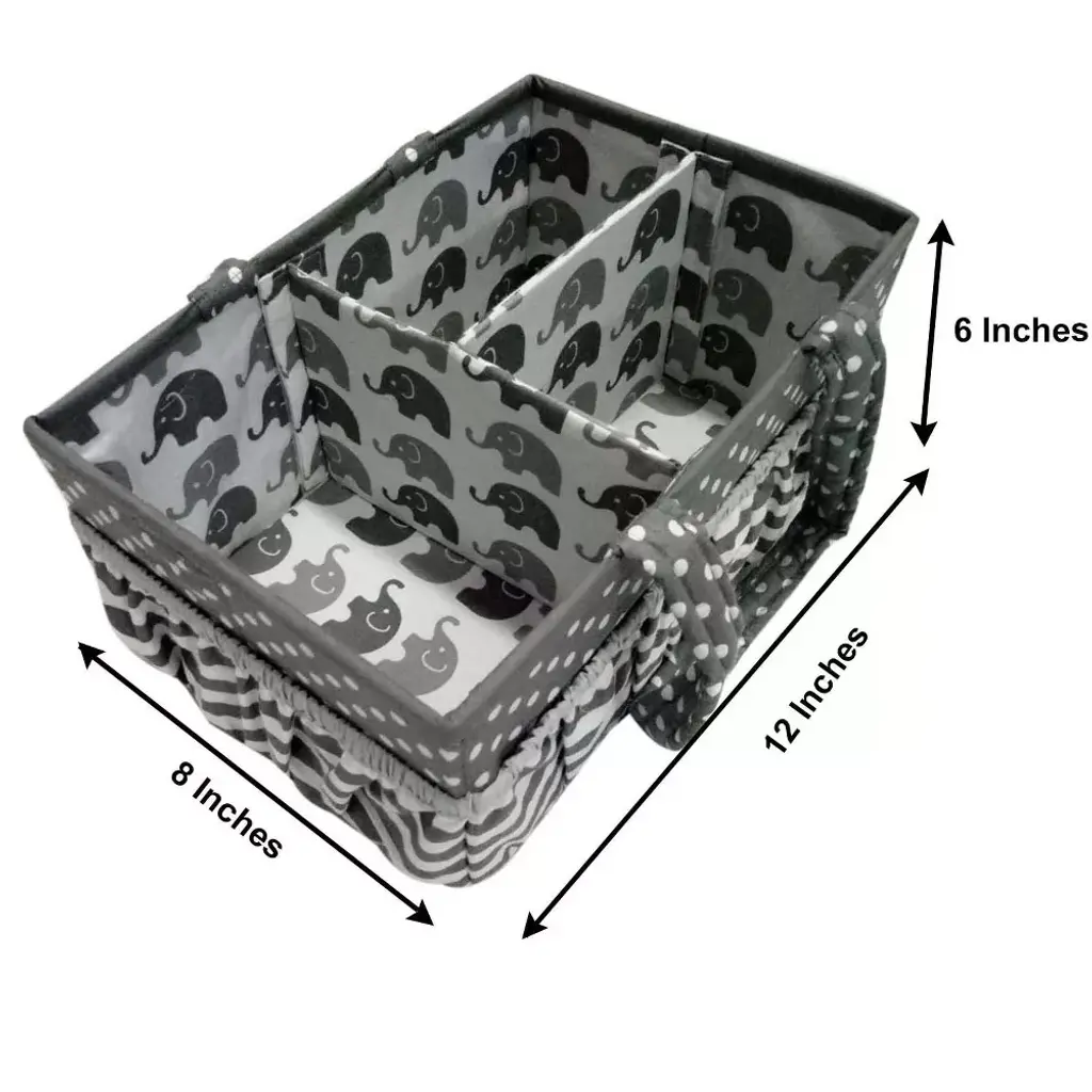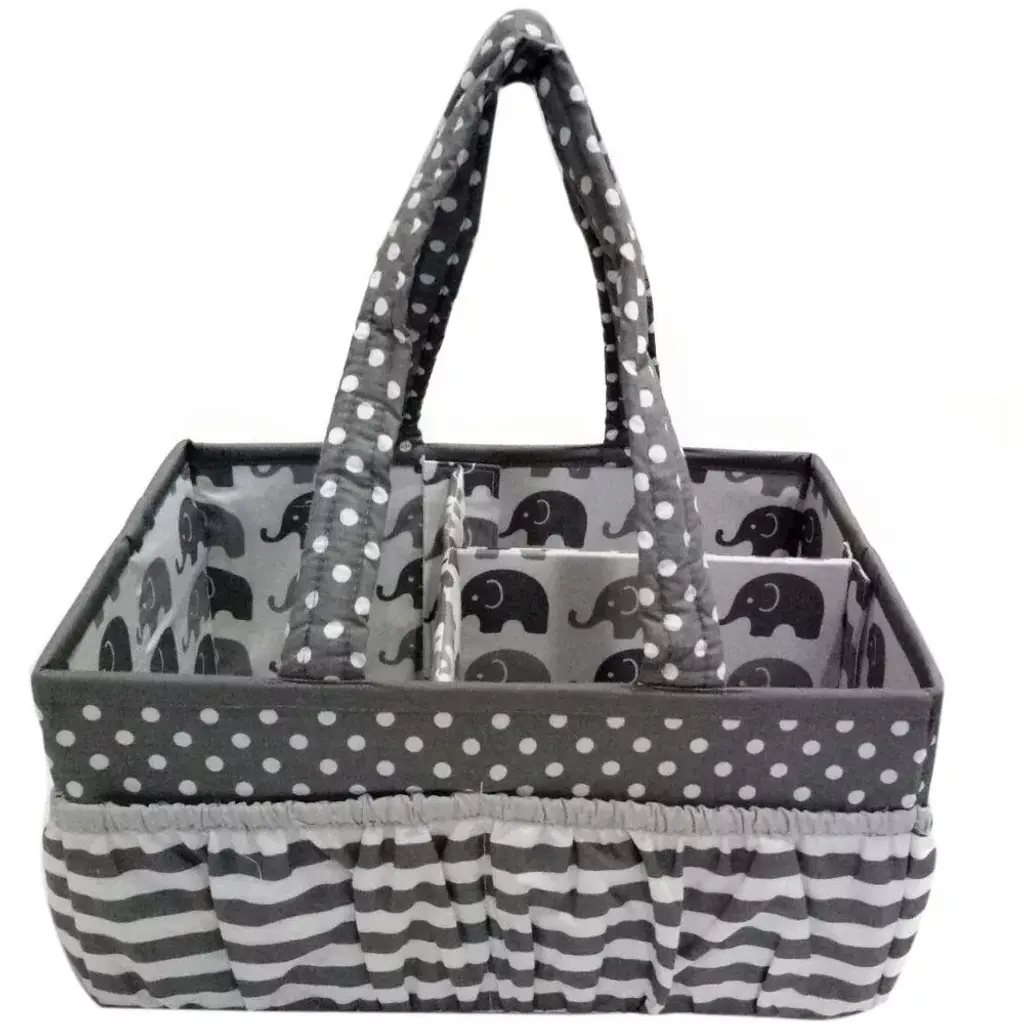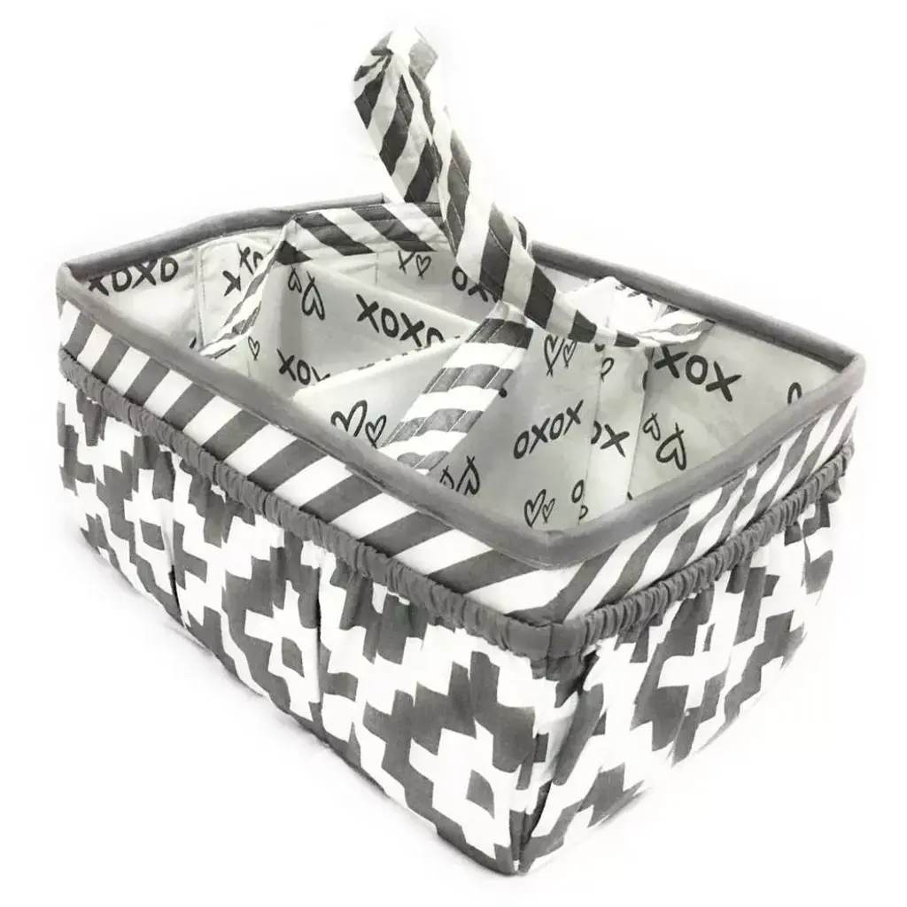 Add organization to any area of your home with the portable Nursery/Toddler Storage Caddy by Bacati. Perfect for dressers and changing stations, this lightly padded caddy has 8 outer pockets and a removable "T" separator for maximum versatility. The soft cotton percale fabric with stiffner inside keeps the shape intact, lining and handles feature a padded with polyfilled and cordinating trim. Keep diapers, wipes and other necessities tidy while traveling from room to room. Caddy also functions as an organizer for crafts, picnics, pet supplies, etc. Measures 12.5 in x 6.25 in x 8.5 in.