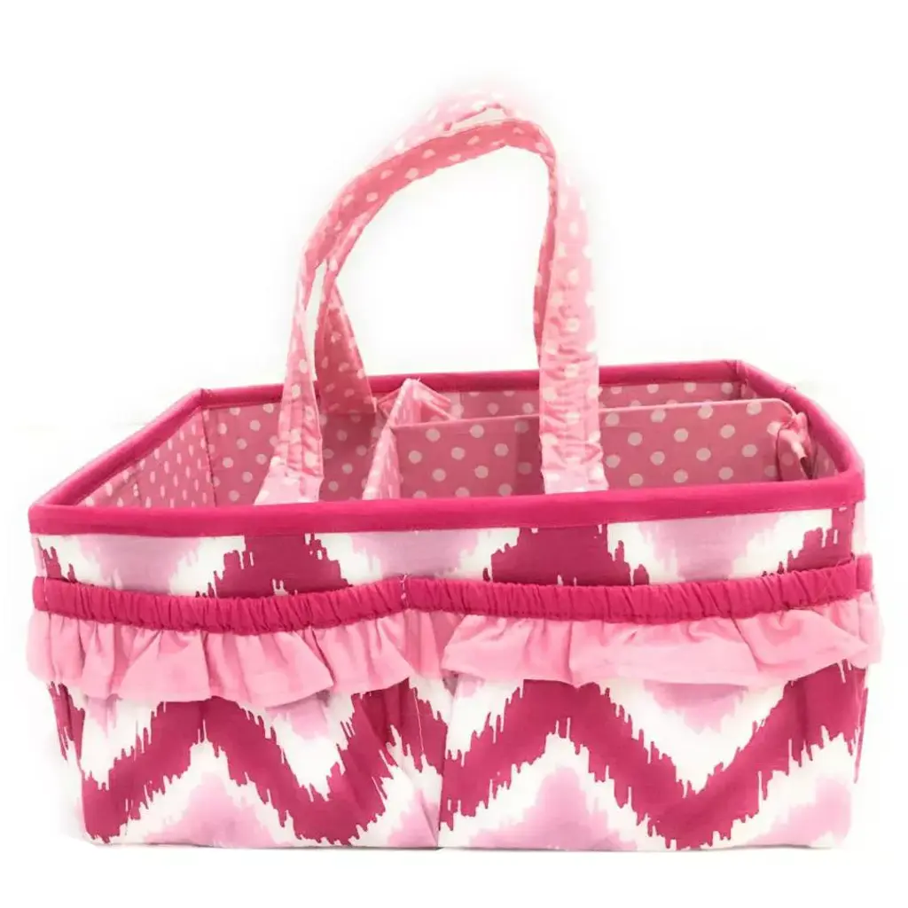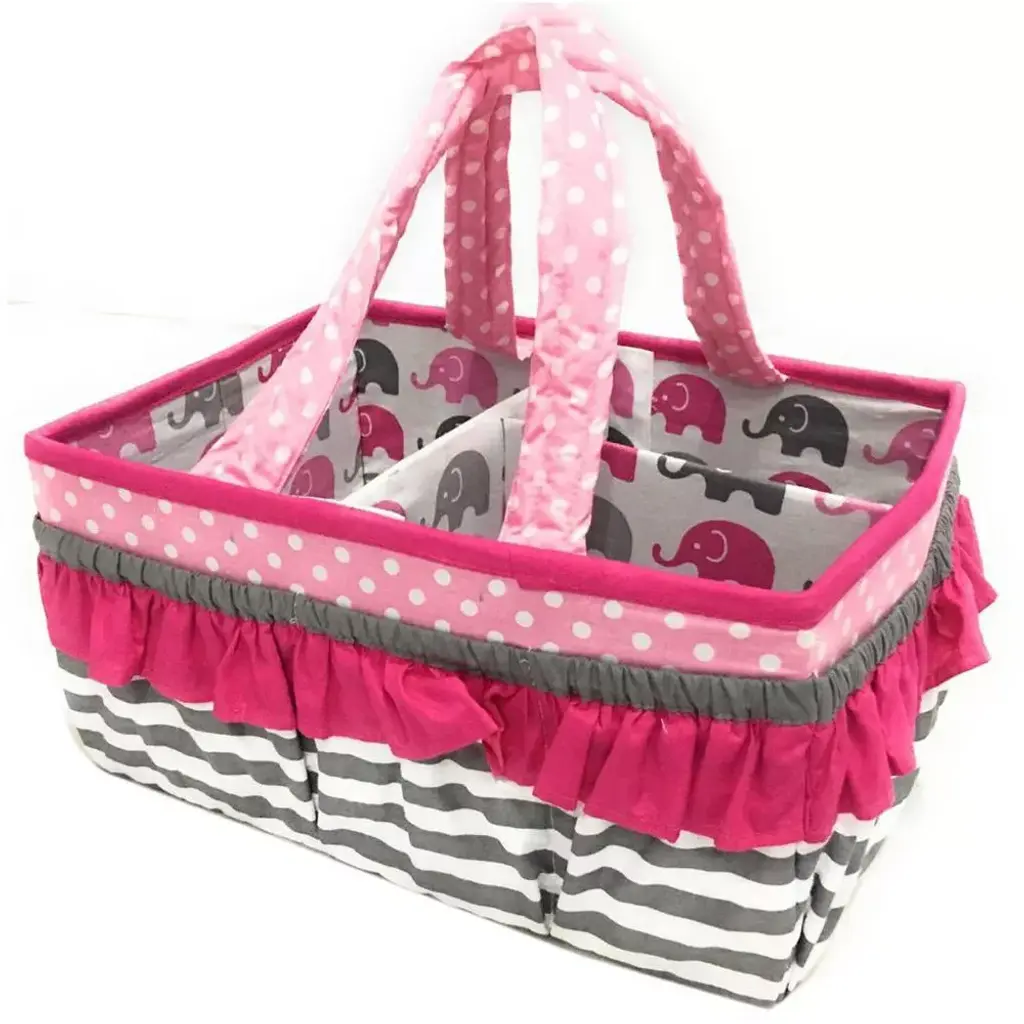 Add organization to any area of your home with the portable Nursery/Toddler Storage Caddy by Bacati. Perfect for dressers and changing stations, this lightly padded caddy has 8 outer pockets and a removable "T" separator for maximum versatility. The soft cotton percale fabric with stiffner inside keeps the shape intact, lining and handles feature a padded with polyfilled and cordinating trim. Keep diapers, wipes and other necessities tidy while traveling from room to room. Caddy also functions as an organizer for crafts, picnics, pet supplies, etc. Measures 12.5 in x 6.25 in x 8.5 in.