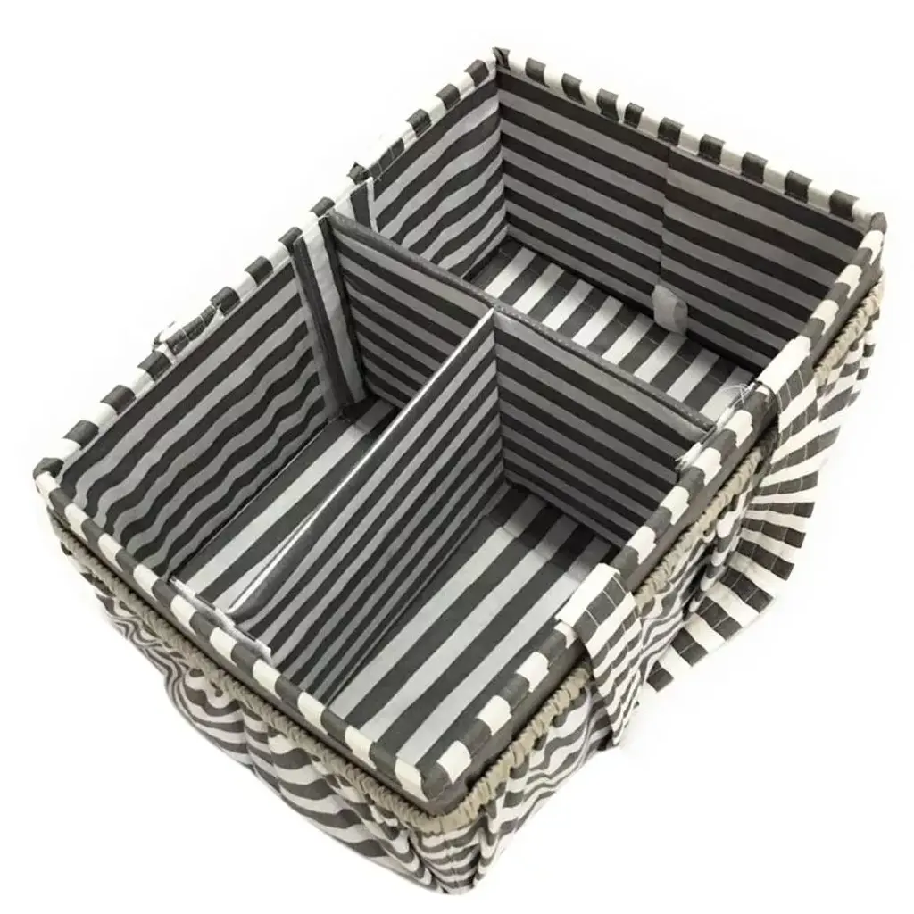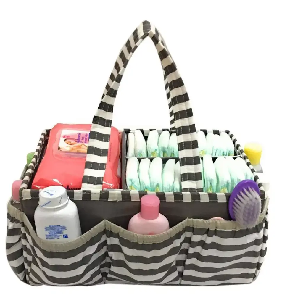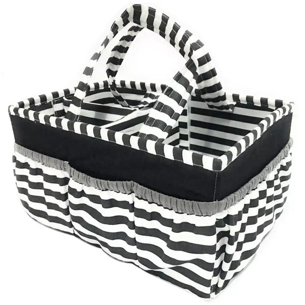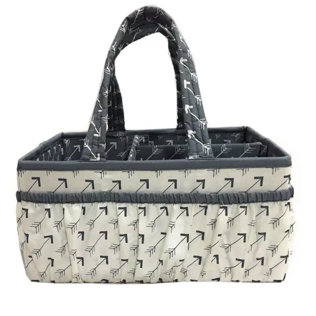 Add organization to any area of your home with the portable Nursery/Toddler Storage Caddy by Bacati. Perfect for dressers and changing stations, this lightly padded caddy has 8 outer pockets and a removable "T" separator for maximum versatility. The soft cotton percale fabric with stiffner inside keeps the shape intact, lining and handles feature a padded with polyfilled and cordinating trim. Keep diapers, wipes and other necessities tidy while traveling from room to room. Caddy also functions as an organizer for crafts, picnics, pet supplies, etc. Measures 12.5 in x 6.25 in x 8.5 in.