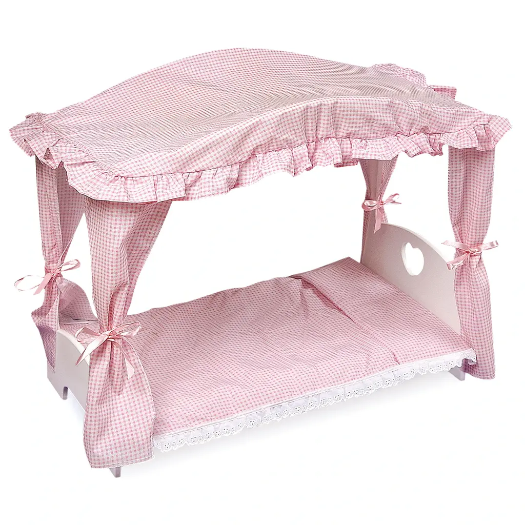 Badger Basket’s Canopy Doll Bed with Bedding is fancy toy furniture fit for a queen! Your doll will look forward to hitting the sheets every night below the pretty, flowing canopy and the fabric-wrapped corner posts. It will be the centerpiece of your child's special doll furniture collection. Dolls, and special stuffed animals, will slumber in comfort thanks to the padded mat with attached pillow. Fun for little mommies caring for their pretend, sleepy children; or an elegant way to display prized collector dolls. Heart cut out on the headboard adds to the appeal. Classically arched canopy is trimmed with a sweet ruffle and tied around the posts with silky, pink ribbons. Canopy Doll Bed is made with engineered wood and a metal canopy frame. Removable bedding is made with 100% Polyester fabric with 100% Polyester fill. For Dolls up to 20 inches. Fits 18 inch dolls such as American Girl, My Life As, Madame Alexander, Ashton Drake, and Our Generation; and also fits 15 inch American Girl Bitty Baby dolls and 14.5 inch American Girl WellieWishers dolls. Overall doll bed measures 22 inches L x 11.75 inches W x 20 inches H. Interior of the bed measures 21.5 inches L x 11.25 inches W. Assembled weight: 6 pounds. All measurements approximate. Spot clean or hand wash the fabric bedding with cold water and mild detergent as needed and air dry. Wipe the frame clean as needed with a lightly dampened cloth and dry thoroughly. Adult assembly required. Illustrated instructions included. For children from three years old and up. This item is to be used with dolls only and is never to be used with real infants or pets. /!\ WARNING: CHOKING HAZARD - Small parts. Not for children under 3 yrs. Product complies with all currently applicable safety standards. Product includes a limited warranty of 30 Days Parts to the original purchaser. Doll and doll clothes/accessories not included. Product may vary slightly from shown and described. Props/accessories shown are for illustration purposes only and are not included with the product. Actual color/finish may vary slightly from screen display. This item ships in its original carton which may include a product photo.