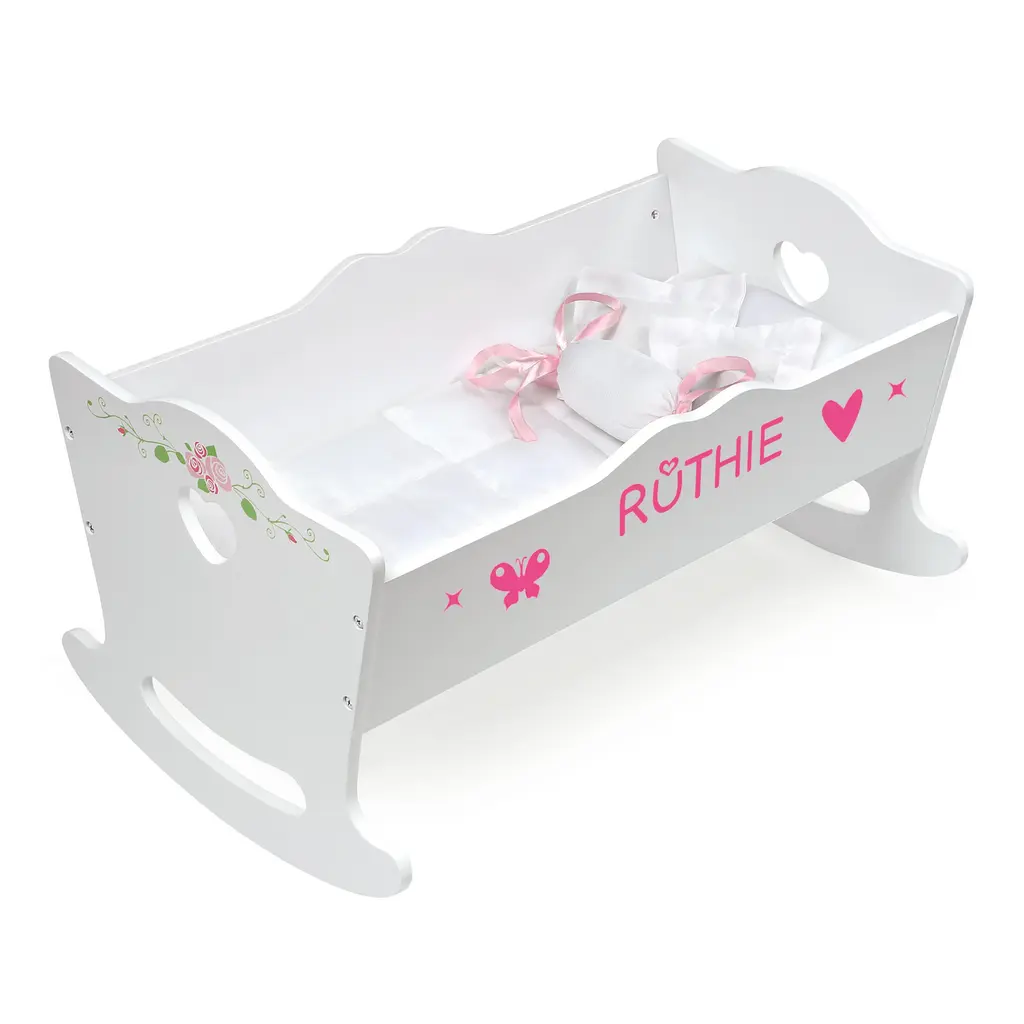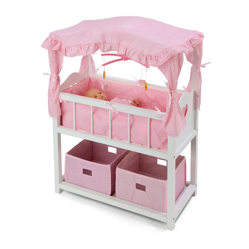 Badger Basket’s Canopy Doll Crib with Baskets, Bedding, and Mobile suits your treasured dolly at bed time and includes a nice sized storage area below to keep her things organized for the day! All-in-all, it's a complete set-up to keep your child engaged with her baby dolls for hours. Waking up for the day, getting dressed (from her wardrobe stashed in the baskets), and going to sleep at night (in style!) can be endlessly and lovingly re-enacted. Two convenient and removable storage baskets keep your doll clothes and accessories sorted, contained, and accessible from all sides of the crib. Classically arched canopy is trimmed with a sweet ruffle and tied around the posts with silky ribbons. Heart cutouts on the sides enhance the precious style. Bedding set includes liner fully covering the inside of the crib, a blanket, and a pillow. Also includes a real, working musical mobile! Wind-up the mobile and it slowly rotates to soothe your baby doll into dreamland. Interesting shapes dangling from the mobile add to the realistic look. Mobile plays a happy nursery or lullaby tune (tunes vary) and does not require batteries. Mobile can be detached if you don't want to use it. The baskets fold flat for storage – simply remove the bottom panel and collapse the sides. Helpful handle slots on front and back of the baskets make them easy to pull out. Leave the baskets out and you have an open storage shelf instead. Taller crib design is comfortable for children of all ages to play with. For Dolls up to 22 inches. Fits 18 inch dolls such as American Girl, My Life As, Madame Alexander, Ashton Drake, and Our Generation; and also fits 15 inch American Girl Bitty Baby dolls and 14.5 inch American Girl WellieWishers dolls. Doll Crib is made of wood and engineered wood. Bedding is made with 100% Polyester fabric with 100% Polyester fill. Mobile is plastic. Overall assembled dimensions 24 inches W x 12 inches L x 31 inches H. Interior of crib: 22.5 inches L x 10.25 inches W x 7.25 inches H. Shelf area: 22 inches L x 12 inches W x 10 inches H. Blanket: 19.5 inches L x 9.5 inches W. Pillow: 7.5 inches L x 5 inches W. Height from crib rail to top of canopy: 12.5 inches H. Height from top of crib rail to floor measures 19.75 inches. Storage baskets: 9.5 inches L x 9.5 inches W x 5.75 inches H. Assembled weight: 13.5 pounds. All measurements approximate. Spot clean or hand wash the fabric bedding with cold water and mild detergent as needed and air dry. Wipe the frame clean as needed with a lightly dampened cloth and dry thoroughly. Spot clean the baskets as needed. Never immerse the baskets in water. Adult assembly required. Illustrated instructions included. For children from three years old and up. This item is to be used with dolls only and is never to be used with real infants or pets. /!\ WARNING: CHOKING HAZARD - Small parts. Not for children under 3 yrs. Product complies with all currently applicable safety standards. Product includes a limited warranty of 30 Days Parts to the original purchaser. Doll and doll clothes/accessories not included. Product may vary slightly from shown and described. Props/accessories shown are for illustration purposes only and are not included with the product. Actual color/finish may vary slightly from screen display. This item ships in its original carton which may include a product photo. NOTE: The crib includes a music box for the mobile but this is not shown in the photograph here or on the packaging. When actually assembled, the mobile hangs lower due to the music box.