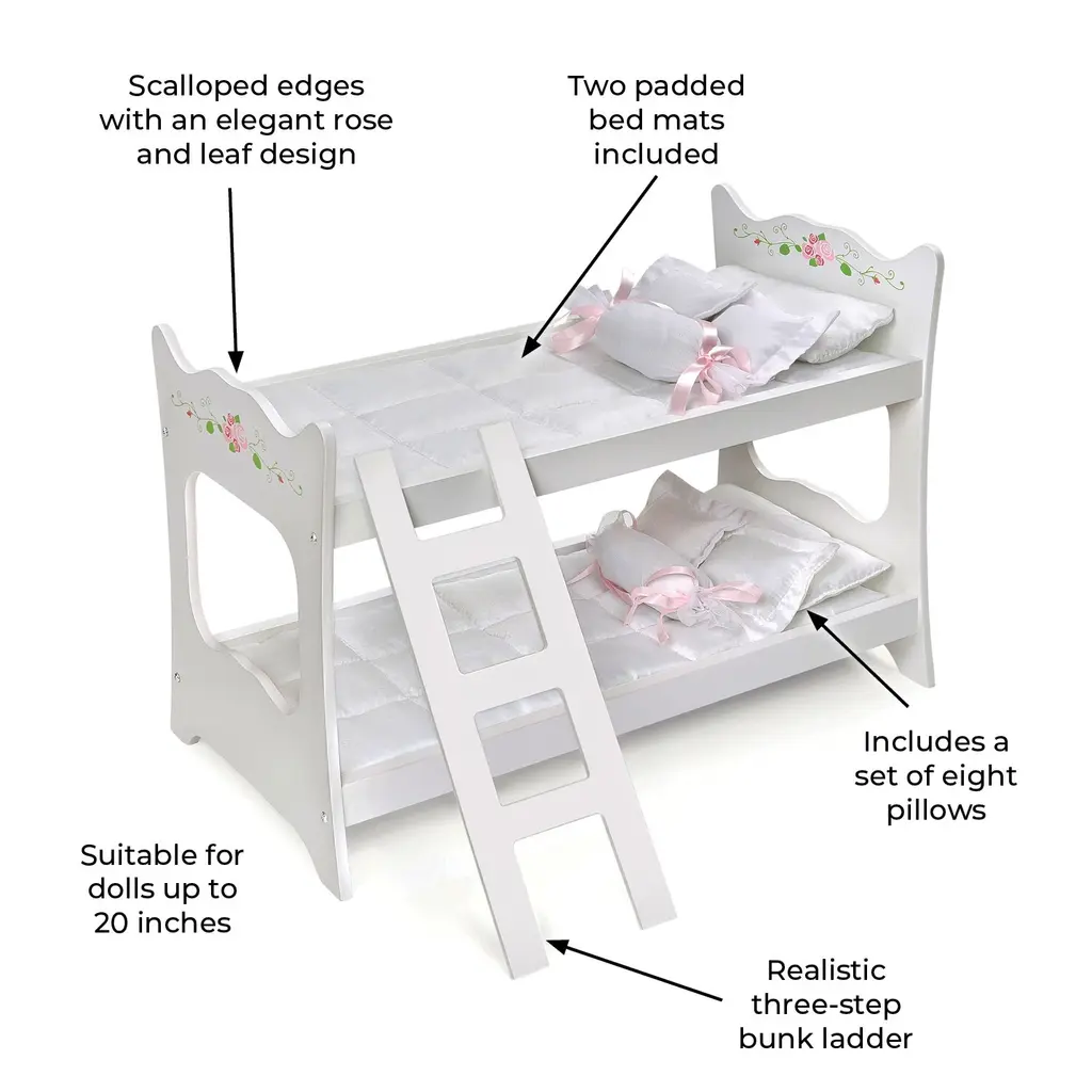 Badger Basket's elegant White Rose Doll Bunk Bed is perfect for sisters or sleepovers! Two dolls can slumber in comfort thanks to the two quilted, padded blankets, four square pillows, two rectangle pillows, and two cylindrical pillows. The stuffed linens can also be used as mattresses instead of blankets. Includes a removable ladder for extra fun and realism. The bunk bed is so pretty and sophisticated, your dolls, and special stuffed animals, will be begging for afternoon naps, too! Fun for little mommies caring for their pretend, tired children; or an elegant way to display prized collector dolls. The white bunk bed features fancy, scalloped details with silk-screened rose and leaf design. Rose design is bursting with pretty pinks and spring greens. Bed is made with durable engineered wood with a white finish. Removable bedding is made with 100% Polyester fabric with 100% Polyester fill. For Dolls up to 20 inches. Fits 18 inch dolls such as American Girl, My Life As, Madame Alexander, Ashton Drake, and Our Generation; and also fits 15 inch American Girl Bitty Baby dolls and 14.5 inch American Girl WellieWishers dolls. Overall doll bunk bed measures 22.25 inches L x 11.25 inches W x 17 inches H to the top of the headboard. Height to top of Footboard: 15.25 inches H. Interior of beds: 21.5 inches L x 9.25 inches W x 0.5 inch H. Distance between bunks: 9.5 inches H. Height from floor to bottom rail: 2 inches H. Assembled weight: 6.3 pounds. All measurements approximate. Spot clean the fabric as needed and air dry. Wipe the frame clean as needed with a lightly dampened cloth and dry thoroughly. Adult assembly required. Illustrated instructions included. For children from three years old and up. This item is to be used with dolls only and is never to be used with real infants or pets. /!\ WARNING: CHOKING HAZARD - Small parts. Not for children under 3 yrs. Product complies with all currently applicable safety standards. Product includes a limited warranty of 30 Days Parts to the original purchaser. Doll and doll clothes/accessories not included. Product may vary slightly from shown and described. Props/accessories shown are for illustration purposes only and are not included with the product. Actual color/finish may vary slightly from screen display. This item ships in its original carton which may include a product photo.