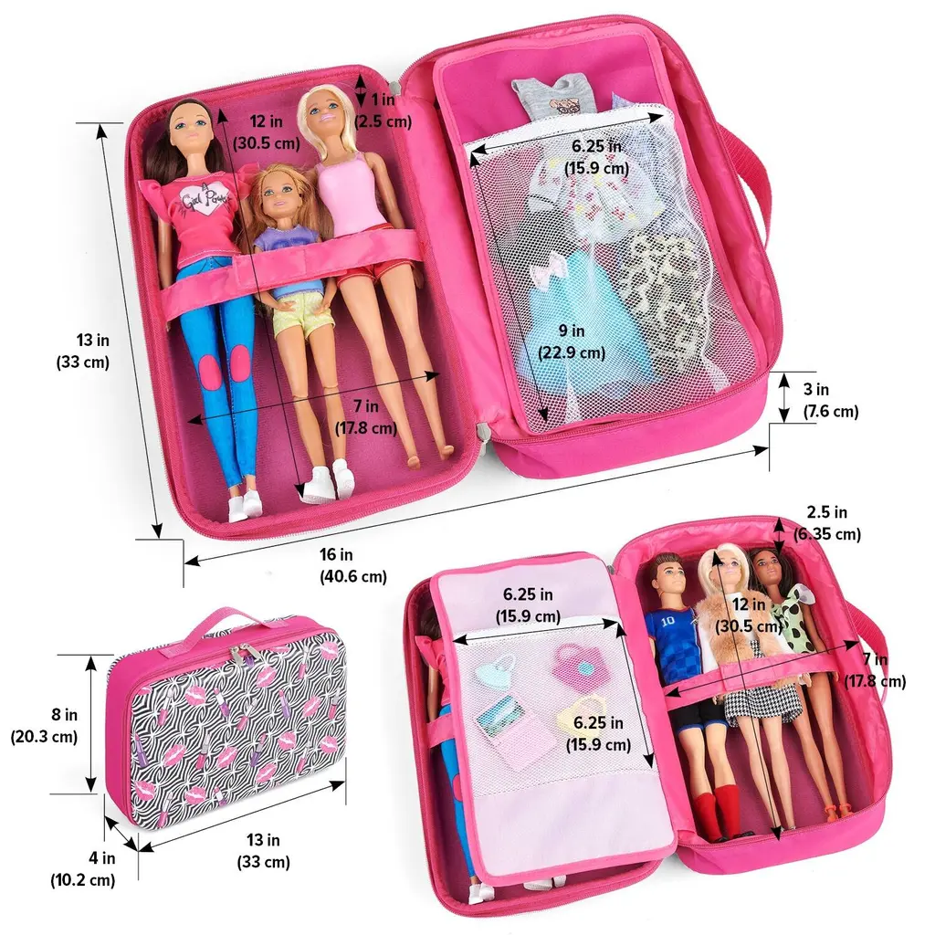 Our Badger Basket travel case is the perfect on-the-go accessory to keep your 12-inch fashion doll collection safe and secure. A double-sided hard shell design helps to protect your fashion dolls while you are out and about. Both sides feature a hook and loop strap that can be used to hold up to six dolls in place, secured so there's no chance of them moving around during travel. The case features an additional flap with two mesh pockets that are perfect for packing doll clothing or other accessories like shoes, purses and hats. Designed for all fashion and action figure dolls up to 12-inches, such as Barbie and Ken. The travel tote measures 13" L x 8" W x 4" D. Bottom storage space: 12"L x 7"W x 2.5"H. Top storage space: 12"L x 7"W x 1"H. Large mesh pocket: 9"L x 6.25"W. Small mesh pocket: 6.25"L x 6.25"W. All measurements approximate. Wipe clean with a damp cloth. Made with EVA and 100% polyester. /!\WARNING: CHOKING HAZARD – Small parts. Not for children under 3 yrs. Product complies with all currently applicable safety standards. Manufacturer’s 30 day limited warranty to the original purchaser. Product may vary slightly from shown and described. Dolls/accessories shown are for illustration purposes only and are not included with the product. Actual color/finish may vary slightly from screen display. This item ships in its original carton that may include a product photo.