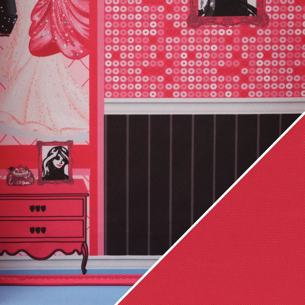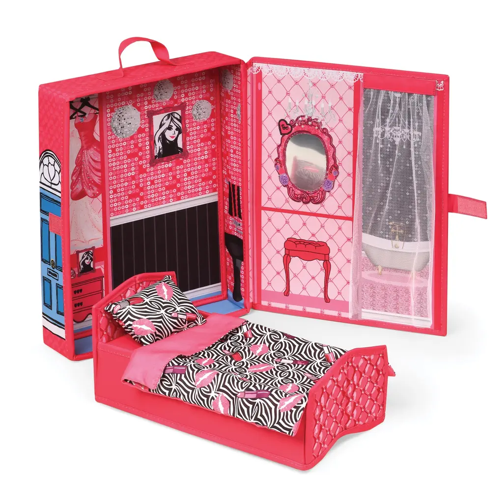 Plenty of room inside the case for the fold-up travel bed and coordinated blanket and pillow, plus a couple of fashion dolls and their clothes/accessories. Thoughtfully covered in full color fabric inside and out bursting with glamorous home and fashion details to encourage imaginative play. Your doll can check her hair in the shiny mirror, and take a pretend shower behind the sheer bathroom curtain. Details decorate all around the outside as well for make-believe fresh-air adventures. Hook-and-loop strap keeps the case closed.Spot clean the travel case and bed frame and hand wash the bedding as needed. Designed for all fashion and action figure dolls up to 12-inches, such as Barbie and Ken. Made with 100% polyester fabric and MDF.Overall dimensions 11 inches L x 3.5 inches W x 14 inches H. Interior storage area on the left side is 10.25 inches L x 2.75 inches D x 13.5 inches H. Bed: 13 inches L x 6 inches W x 5 inches H. Reversible blanket: 12.5 inches L x 8.5 inches W. Pillow: 4.25 inches L x 3 inches W x 1.25 inches H. Assembled weight: 2.5 pounds. All measurements approximate.Adult assembly required. No tools needed for assembly. Illustrated instructions included. This item is for use with dolls only and is not for use with real infants or pets. /!\ WARNING: CHOKING HAZARD - Small parts. Not for children under 3 yrs. Product complies with all currently applicable safety standards. Manufacturer's 30 day limited warranty to the original purchaser. Product may vary slightly from shown and described. Dolls/accessories shown are for illustration purposes only and are not included with the product. Actual color/finish may vary slightly from screen display. This item ships in its original carton that may include a product photo.
