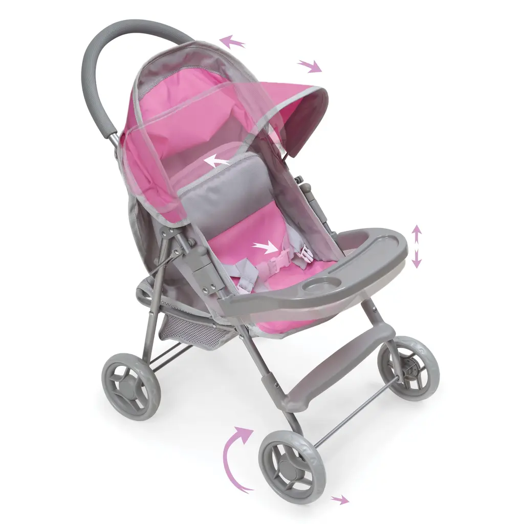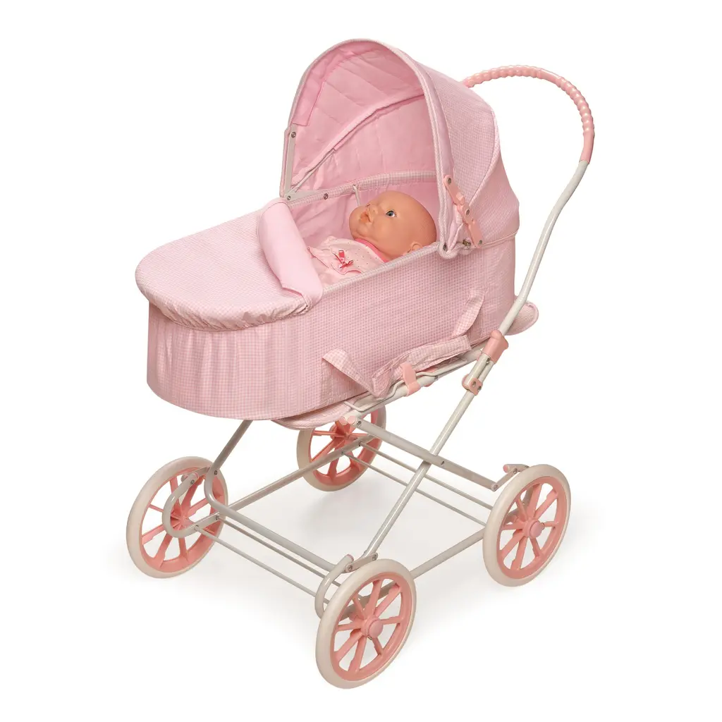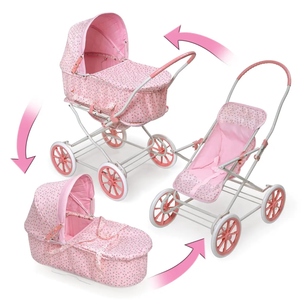 The three, fun configurations, and additional realistic features, offer extra play value and numerous opportunities for your child to make thoughtful baby care decisions during play. Use the carrier and stroller separately for different baby dolls. Carrier attaches to the frame so that the pram faces forward or back. Carrier also includes a fabric cover, interior padding, and adjustable canopy.Adjustable stroller seat with three-point harness. Rubber grip on the stroller/pram handle. Stroller frame easily folds down. Made with fabric, PP plastic, EVA wheel tread, metal tubing, PVC-free synthetic rubber, and MDF.For dolls up to 22 inches. Fits 18-inch dolls such as American Girl, My Life As, Madame Alexander, and Our Generation; and fits 15-inch American Girl Bitty Baby dolls and 14.5-inch American Girl WellieWishers dolls. Overall pram measures approximately 30 inches L x 15.5 inches W x 32 inches H. Wheels: 7.5 inches diameter. Height from floor to top of handle: 26 inches H. Carrier: 24 inches L x 12 inches W x 9 inches H (7 inches H not including folded hood, 17 inches H with hood up). Interior of the carrier: 22.5 inches L x 9.5 inches W x 6.75 inches H. Stroller: 30 inches L x 15.5 inches W x 26 inches H. Interior of stroller seat: 9 inches W x 19.5 inches H.Wipe and spot clean as needed. For children from three years old and up. This item is a toy only. Adult assembly required. /!\ WARNING: CHOKING HAZARD - Small parts. Not for children under 3 yrs. Doll not included. Product may vary slightly from shown. Props shown are for illustration only and are not included. Item ships in its original carton that may include a product photo.
