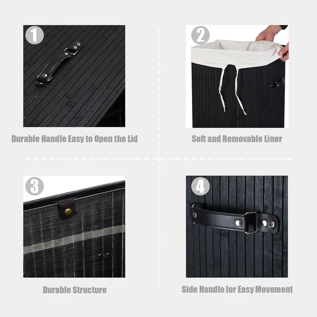Our new laundry hamper is made of premium bamboo material, which is sturdy, lightweight and harmless. It's suitable for frequent use in your bedroom, laundry room or bathroom. The laundry hamper comes with the lid and removable liner, which can prevent the odor release. Except for storing your dirty laundry, this hamper also can be used to store your washed clothes, children's toys and other products.Features:Specification
