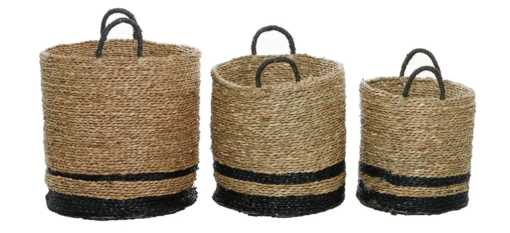 Place this brown set of 2 basket organizers in your living room or laundry room to hold blankets or throws. This item ships in 1 carton. Due to the handmade nature of these, there will be slight color, shape, and size variations, as well as loose fibers. Suitable for indoor use only. This item ships fully assembled in one piece. Maximum weight limit is 5 lbs. Made in Indonesia. This brown colored banana leaf basket organizer comes as a set of 2. Coastal style.