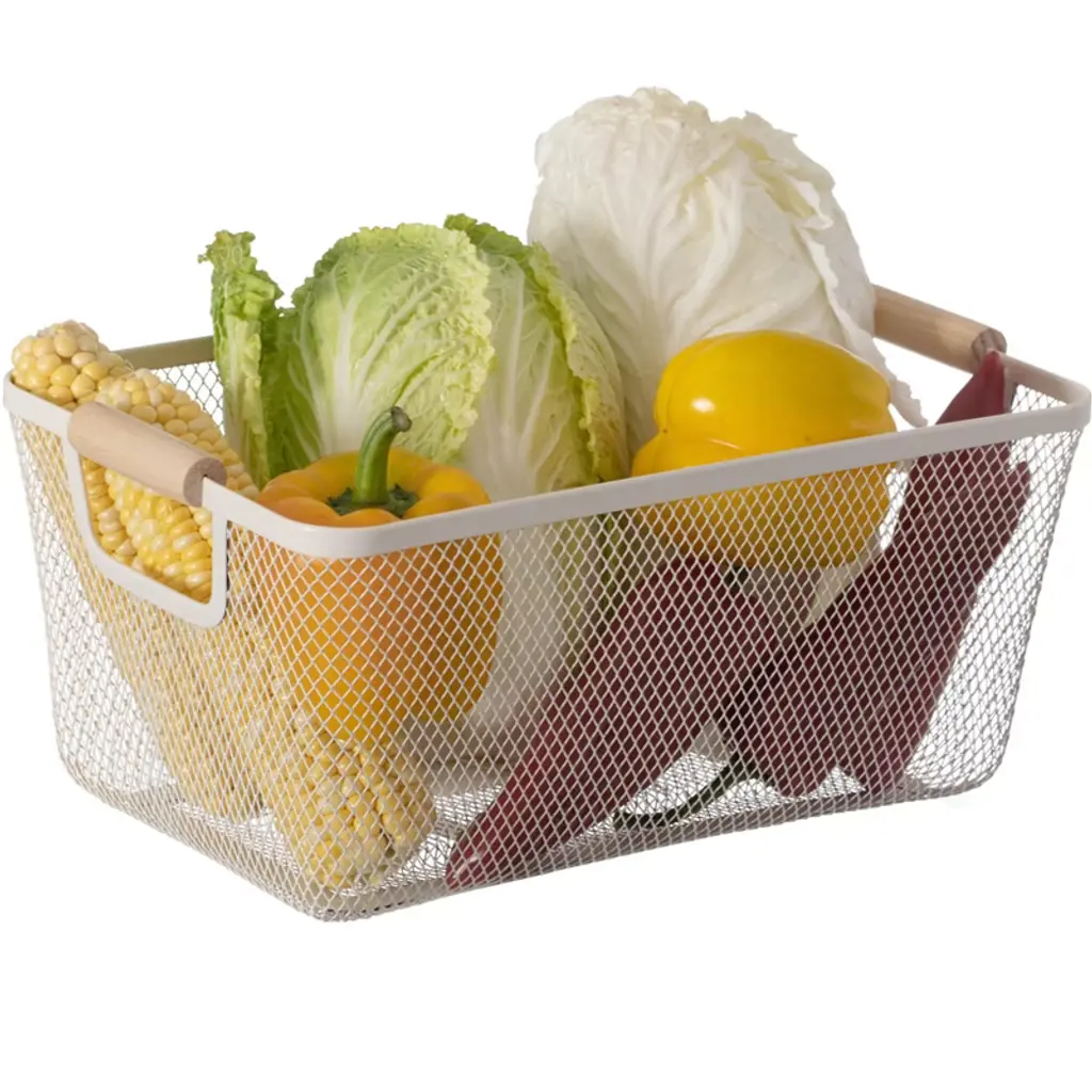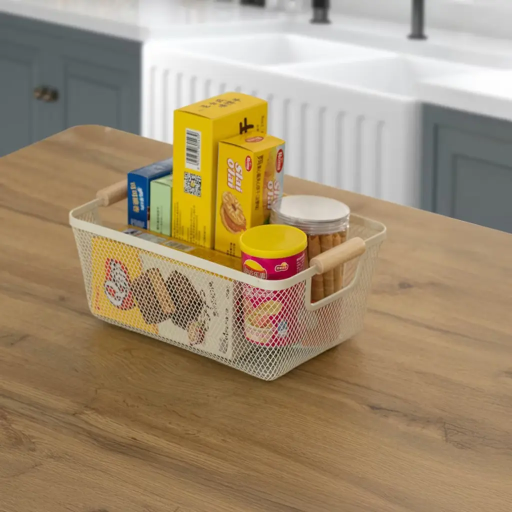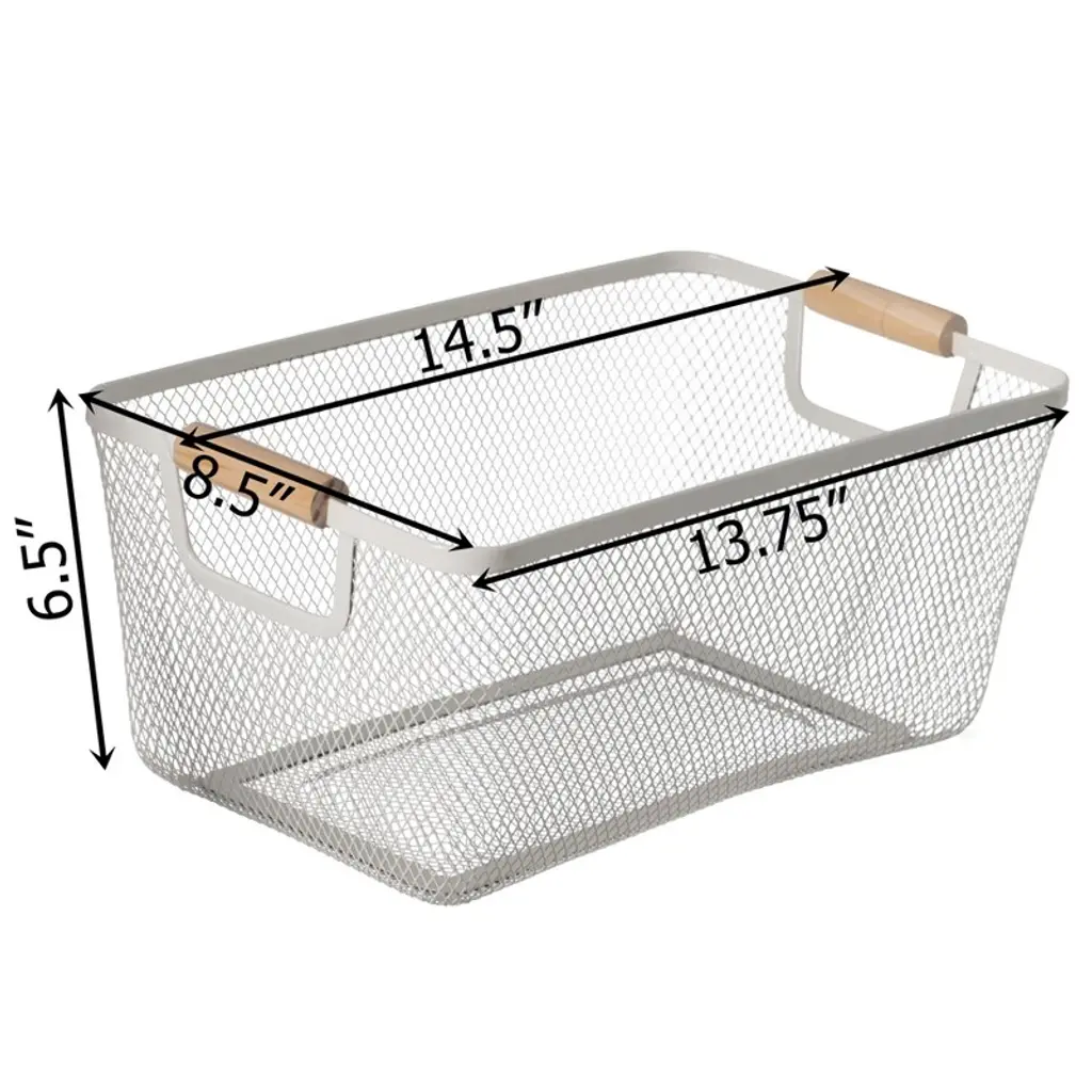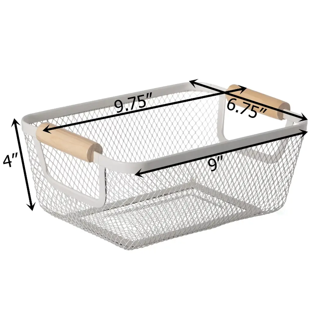 Basicwise Multipurpose Metal Mesh Basket With Wooden Handle Storage Organizers For Kitchen, Bathroom, Cabinet, And Closet, Large