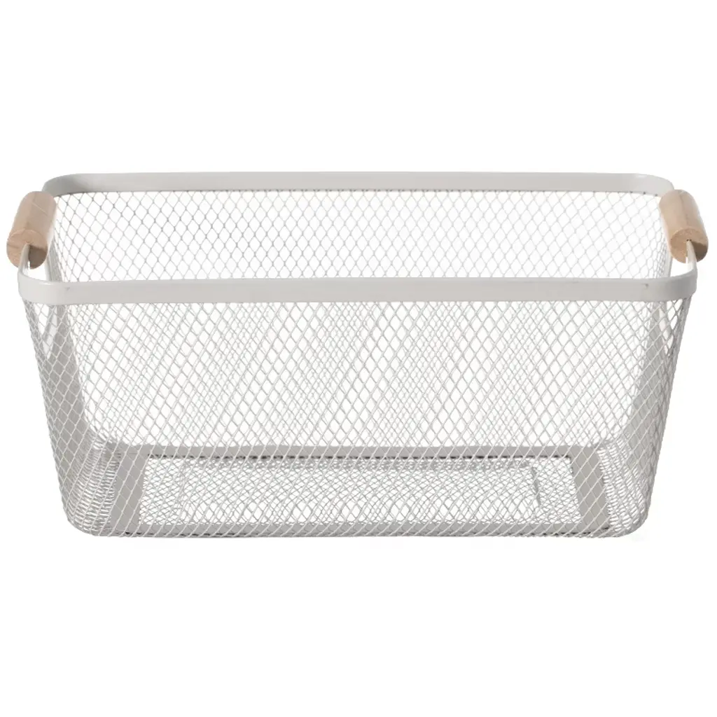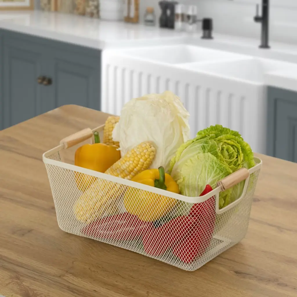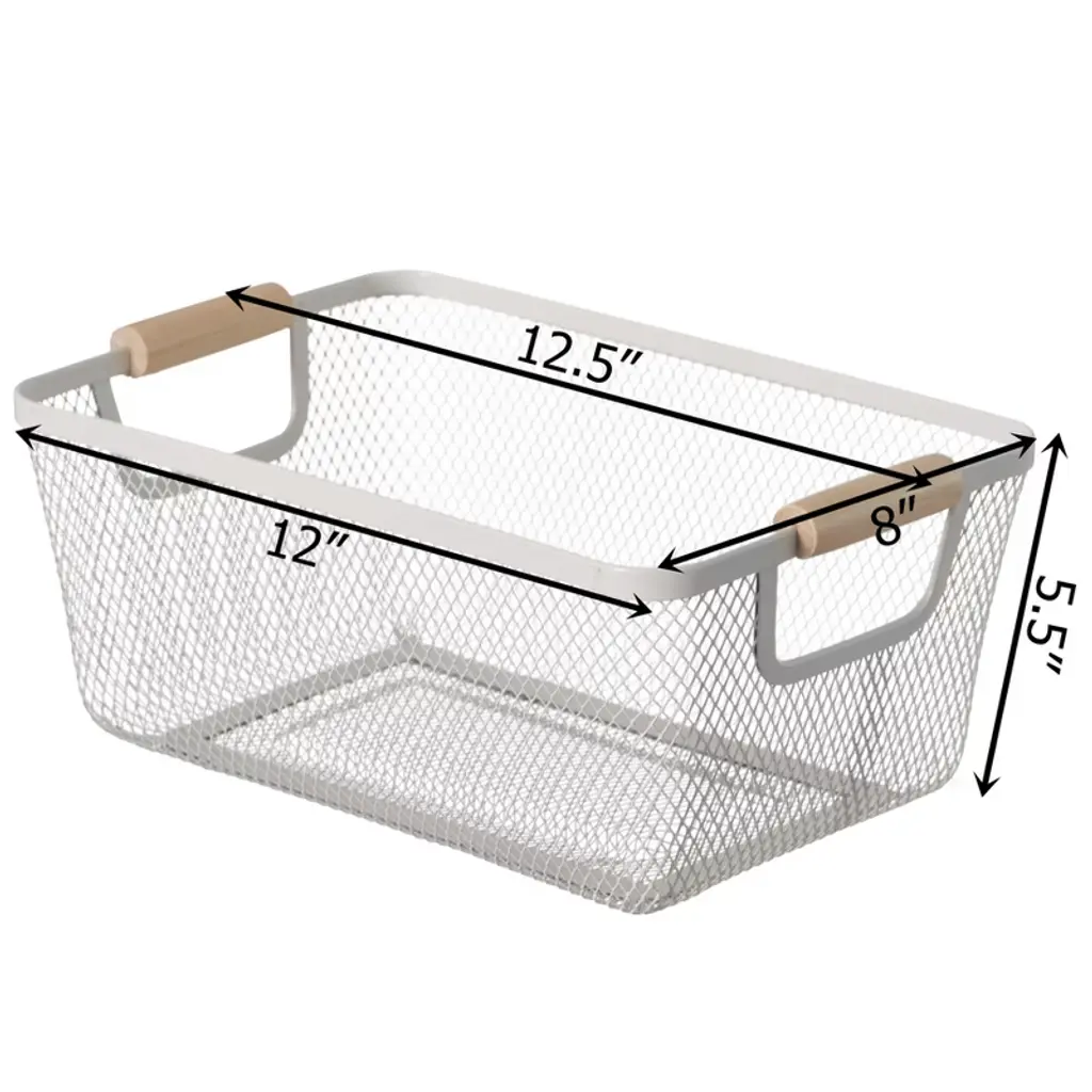 Basicwise Multipurpose Metal Mesh Basket With Wooden Handle Storage Organizers For Kitchen, Bathroom, Cabinet, And Closet, Medium
