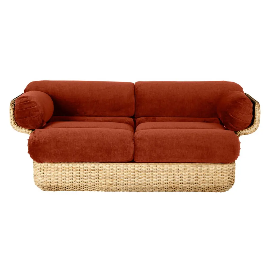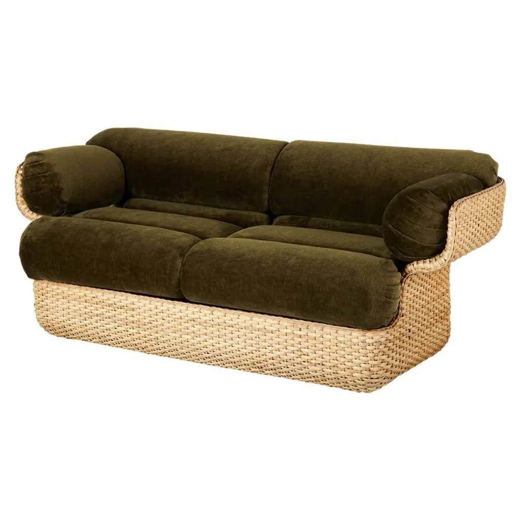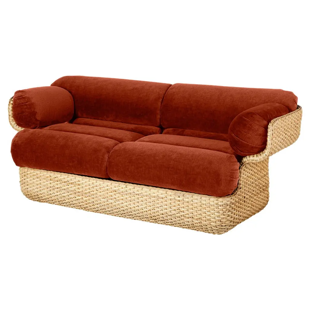 GUBI's Basket 2-seater sofa is part of a captivating rattan furniture collection designed by Joe Colombo. Basket sofa combines industrial manufacturing and extremely detailed artisanship: modernist, even futuristic shape meets ancient techniques. The name "Basket" is a tribute to the classic hand-weaving method of rattan baskets. Originally designed back in the 1960s, GUBI has now reproduced the elegant collection remaining faithful to the original design, with only a few minor changes. The sofa's dimensions have been updated to meet today's ergonomic needs. The original inner shell, made from fiberglass, has been replaced with an environmentally friendly carbon steel shell that offers more stability and durability. The steel frame is covered with carefully hand-crafted rattan strips interlaced over each other. The rounded, embracingly comfortable cushions on the seat and backrest crown the look of the charming 2-seater.