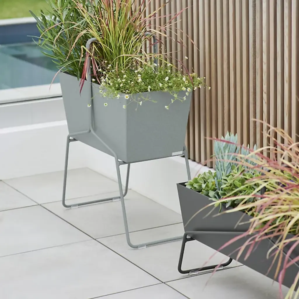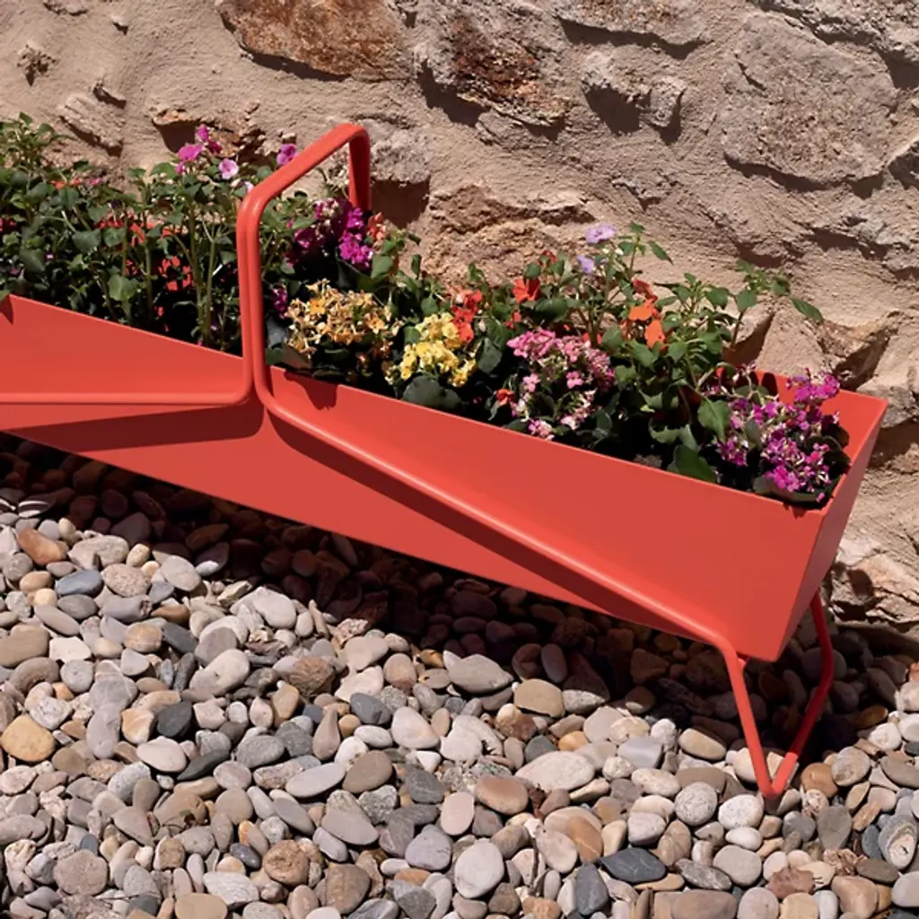 A long and low place for plants. The Fermob Basket Long Planter features a lengthy aluminum planter set in a steel rod frame, which acts as both planter stand and a carrier. Two drainage holes at either end of the planter help prevent standing water, whether plants are kept in their original containers (as recommended) or planted in soil.