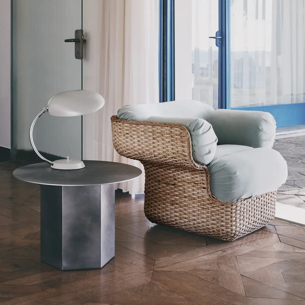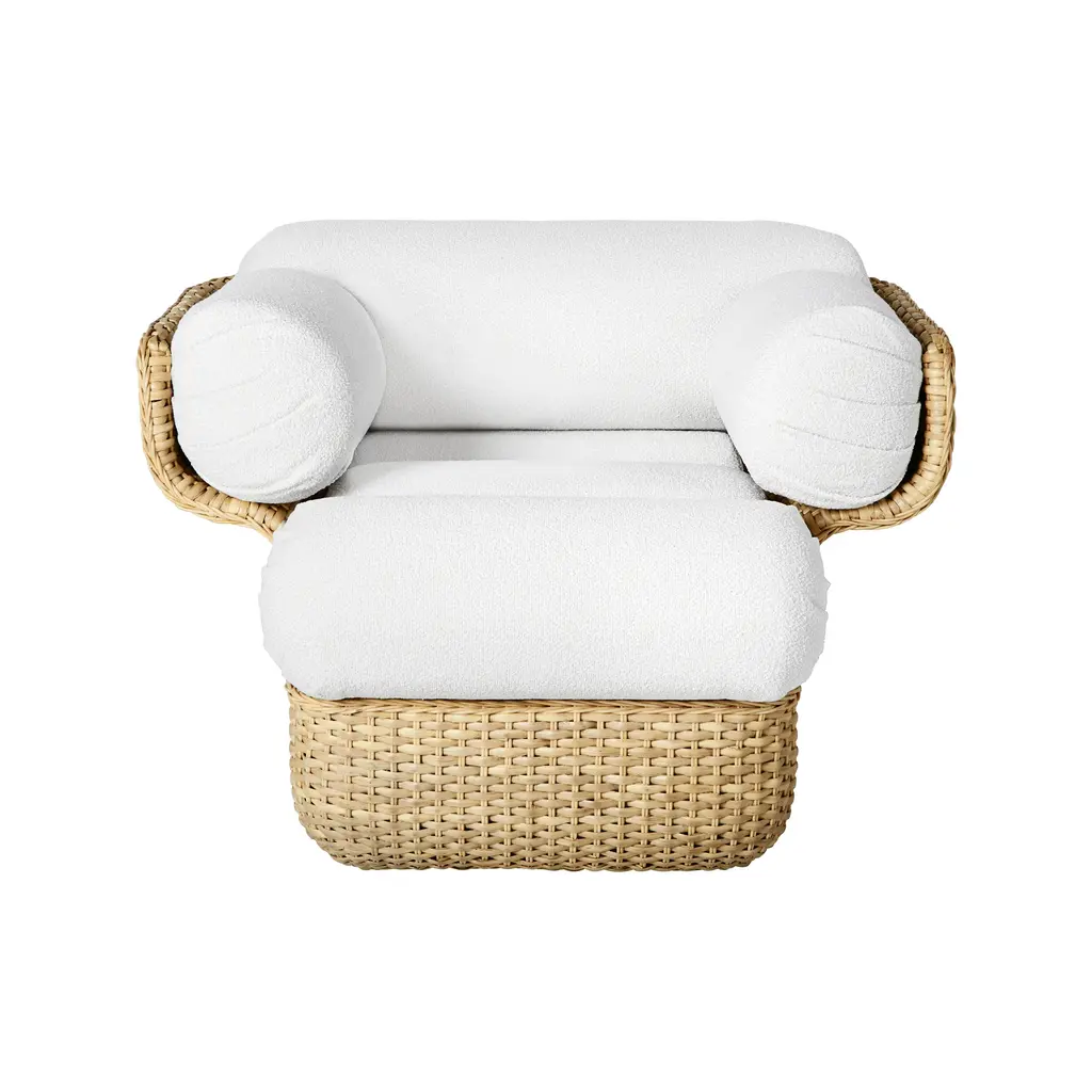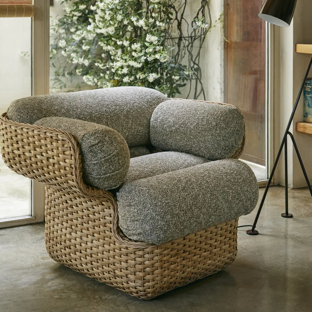 The Basket Lounge Chair from Gubi is a modern take on traditional rattan basket weaving. Its steel skeleton construction provides strength and stability, while the hand-woven rattan skin adds a touch of skilled craftsmanship. Topped with plush cushions wrapped in removable covers, this lounge chair adds a cozy, retro touch to any interior. Highlights
