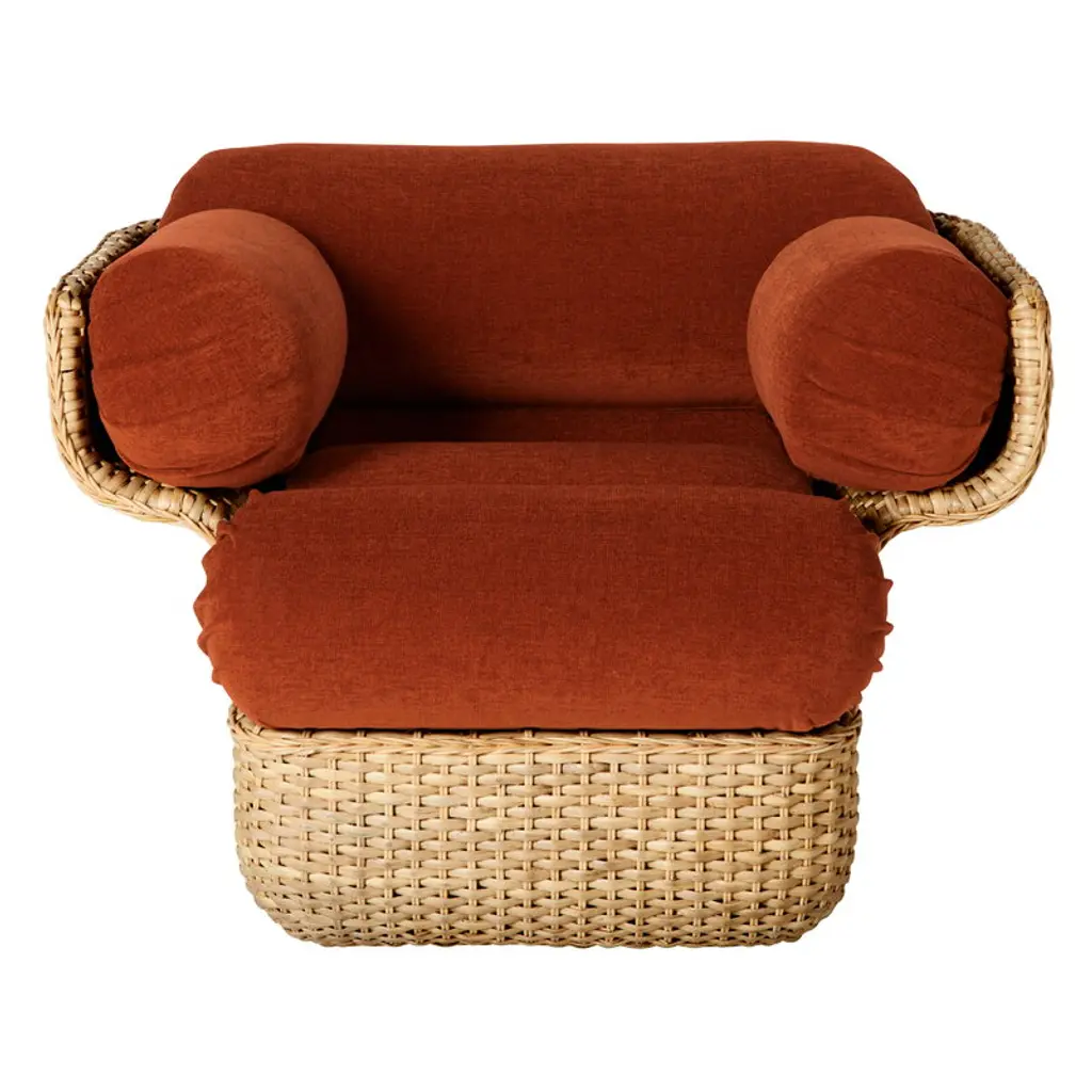 GUBI's Basket lounge chair is part of a captivating rattan furniture collection designed by Joe Colombo. Basket armchair combines industrial manufacturing and extremely detailed artisanship: modernist, even futuristic shape meets ancient techniques. The name "Basket" is a tribute to the classic hand-weaving method of rattan baskets. Originally designed back in the 1960s, GUBI has now reproduced the elegant collection remaining faithful to the original design, with only a few minor changes. The chair's dimensions have been updated to meet today's ergonomic needs. The original inner shell, made from fiberglass, has been replaced with an environmentally friendly steel shell that offers more stability and durability. The steel frame is covered with carefully hand-crafted rattan strips interlaced over each other. The rounded, embracingly comfortable cushions on the seat and backrest crown the look of the charming lounge chair.
