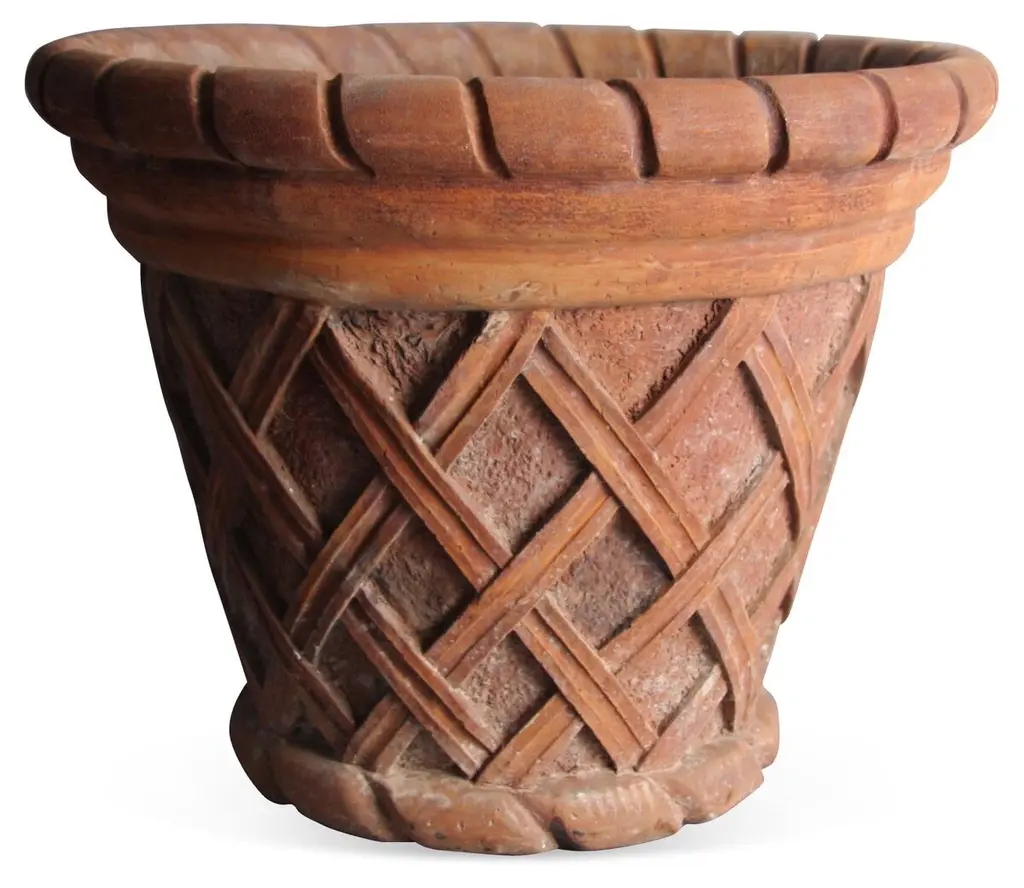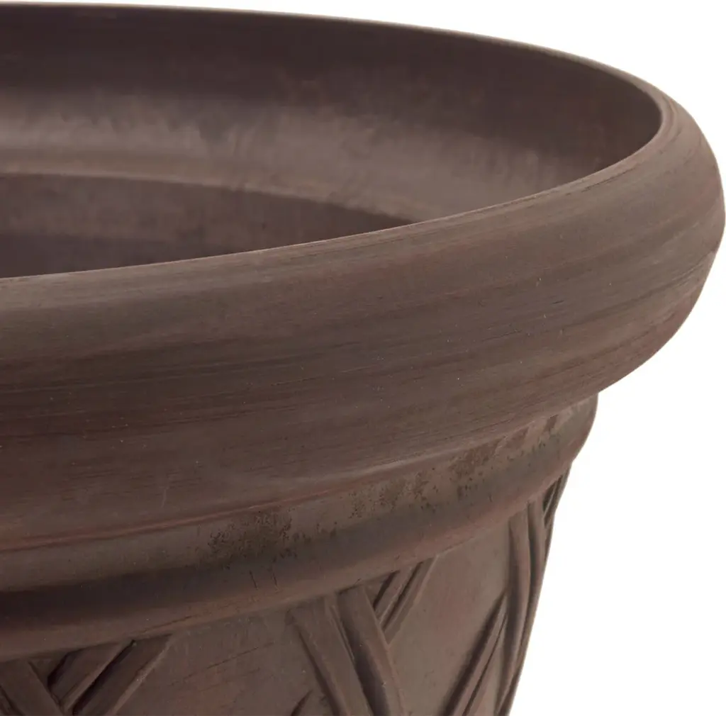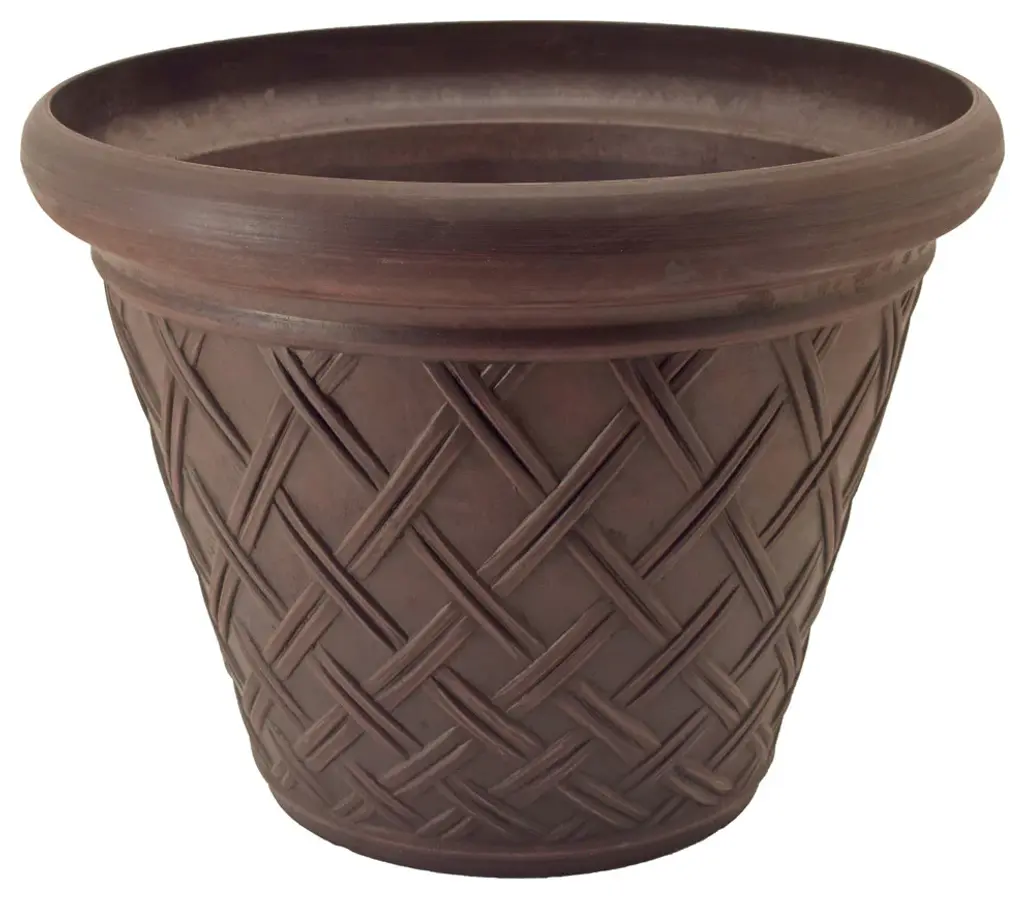 Showcase your favorite flowers and greenery in the ecofriendly Basket-Weave Pot by Arcadia Garden Products. Made from a mix of recycled polymer, stone powder, and wood dust, this brown pot is lightweight, weather-resistant, and durable. Its classic shape and basket-weave exterior complement traditional decor.RECYCLED MATERIALS: A blend of recycled plastic, stone powder and wood dust is used to create this substantial-feeling and good looking product line. Gardeners and botanical centers appreciate our PSW Pots made from 100% recycled materials. LIGHTWEIGHT & DURABLE: Answering a gardener"™s wish, PSW items are sturdy while notably lightweight, which makes for easy positioning and planting. ORIGINAL: The unique appearance of each pot is one-of-a-kind due to the blending of recycled materials.WEATHER RESISTANT: Resistant to all weather types and UV rays.VARIETY: Available in a variety of colors.OPTIONAL DRAINAGE HOLE: Easily drillable for optional drainage.