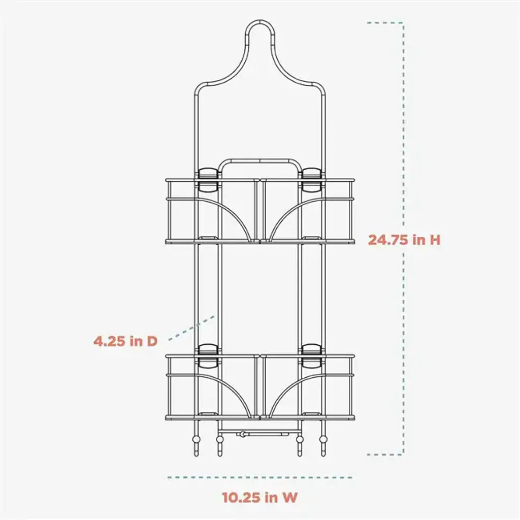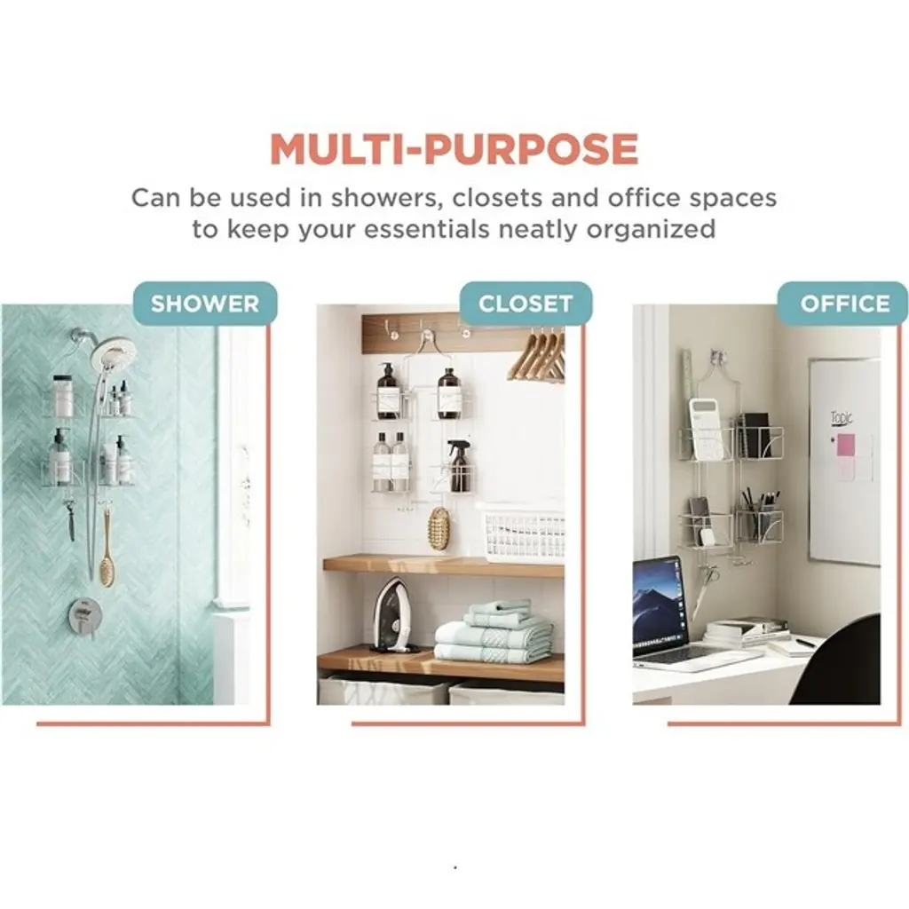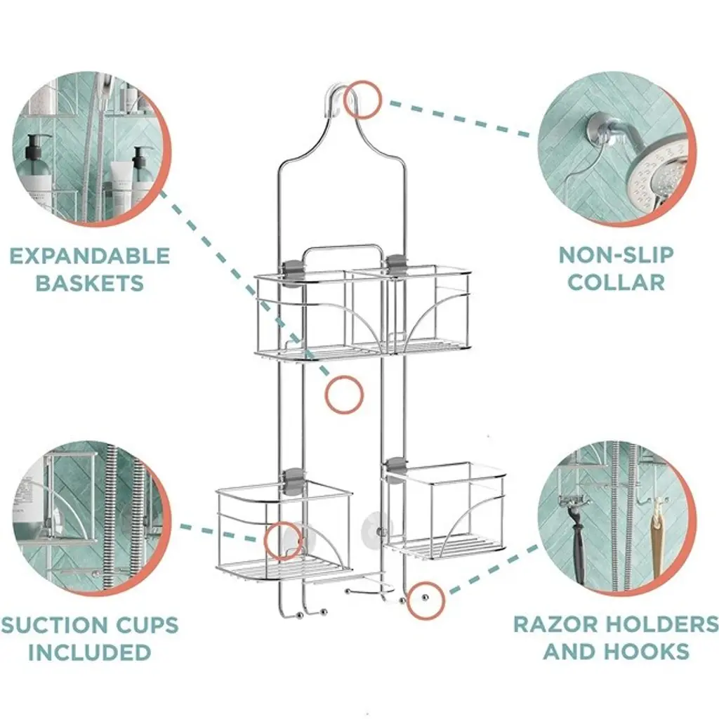 MULTIFUNCTIONAL BATHROOM ORGANIZATION: This shower caddy that hangs from the shower head has 4 expandable baskets that provide plenty of space and are ideal for storing a variety of bathroom essentials such as soap, razors, sponges, body lotion, lotion and shampoo. DESIGNED FOR HANDHELD SHOWERS: This innovative shower rack features sliding baskets that easily make room for a handheld shower hose, ensuring a perfect fit without compromising on storage capacity or accessibility to all your shower essentials. SECURE AND EASY INSTALLATION: This shower head hanger is equipped with a non-slip ring to securely hold the shower head in place. The included suction cups further stabilize the unit, preventing it from slipping, tilting and any unwanted movement. HEAVY DUTY CONSTRUCTION: This shower organizer that hangs from the shower head is made of durable materials that can withstand daily use and prevent wear and tear, providing long-lasting, reliable and sturdy storage for your bathroom essentials. RUST-PROOF FINISH: The chrome finish on this bathroom shower hanging organizer ensures that it won't rust or corrode, and maintains a smooth and shiny look even in wet, high humidity shower environments.