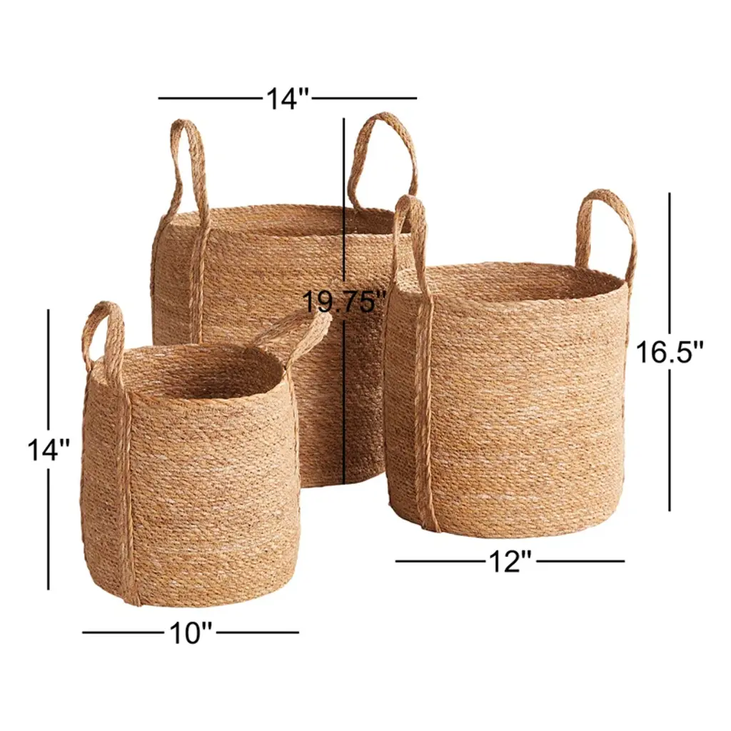 Elevate your home organization game with this set of three hand-woven seagrass baskets. These versatile, round baskets come in a natural color, seamlessly blending with any decor style. Each basket features a sturdy handle for easy transport, making them ideal for storing anything from magazines to toys or even as plant holders. The nesting design allows for convenient storage when not in use. Handmade with care, these baskets are a timeless addition to your home, bringing a sense of warmth and community. Remember, they're not just baskets – they're your trusty storage companions!