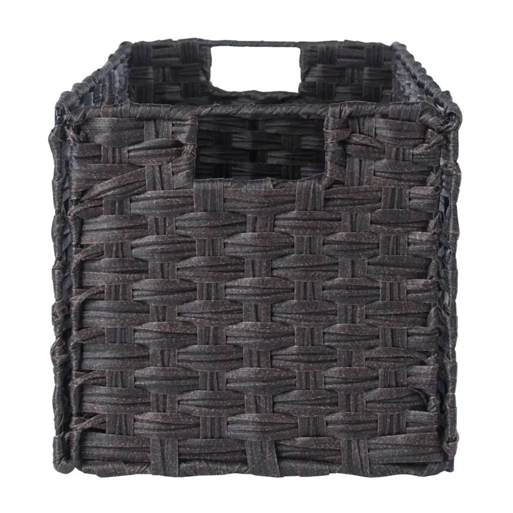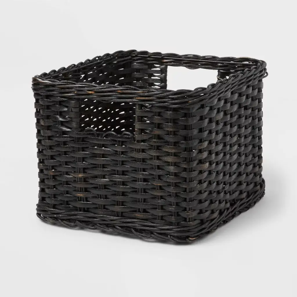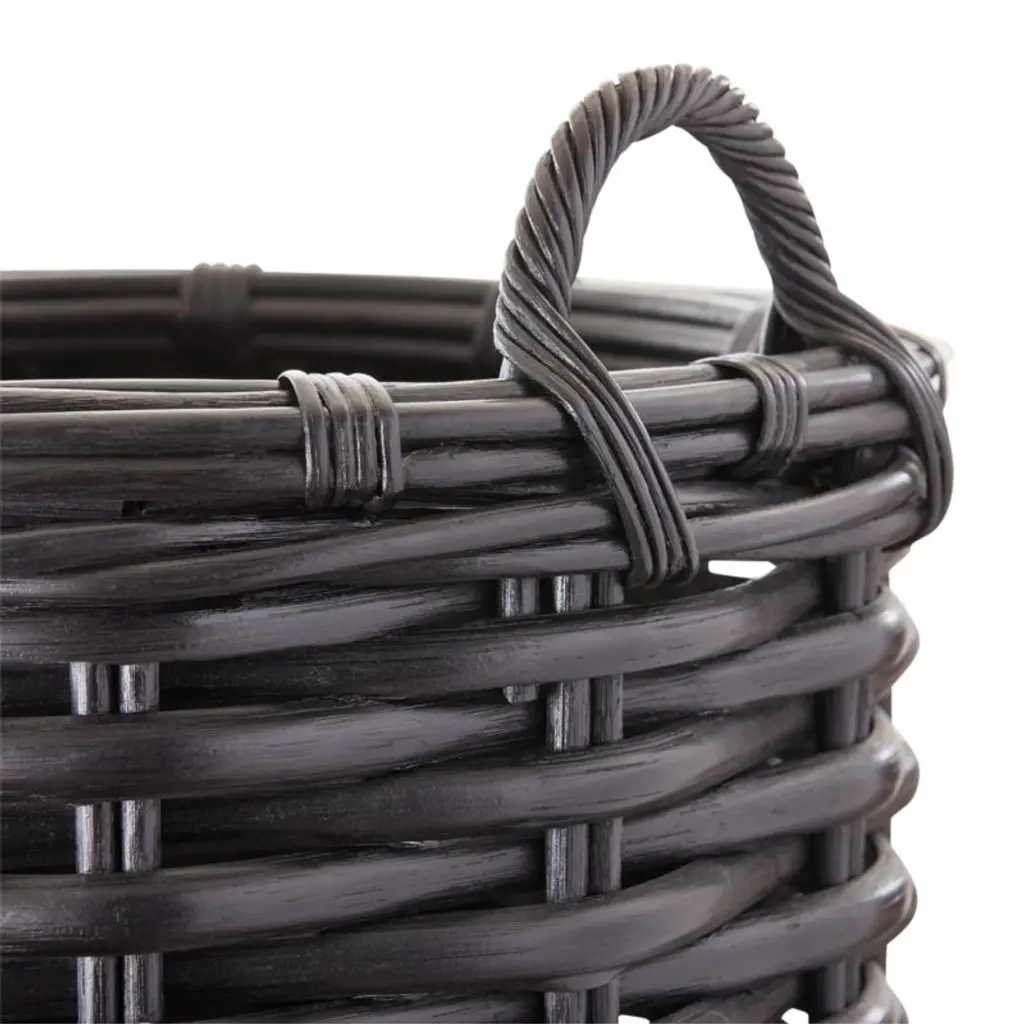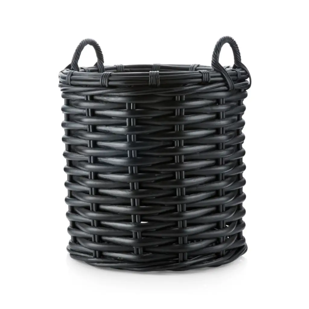 Heated until pliable, sustainable rattan weaves a simple and elegant round basket. Two twisted handles provide convenient handholds for carrying, and the matte black finish is understated and sophisticated. Our exclusive black rattan basket neatly corrals everything from toys to decorative pillows or serves as a modern organic cachepot for a potted plant.