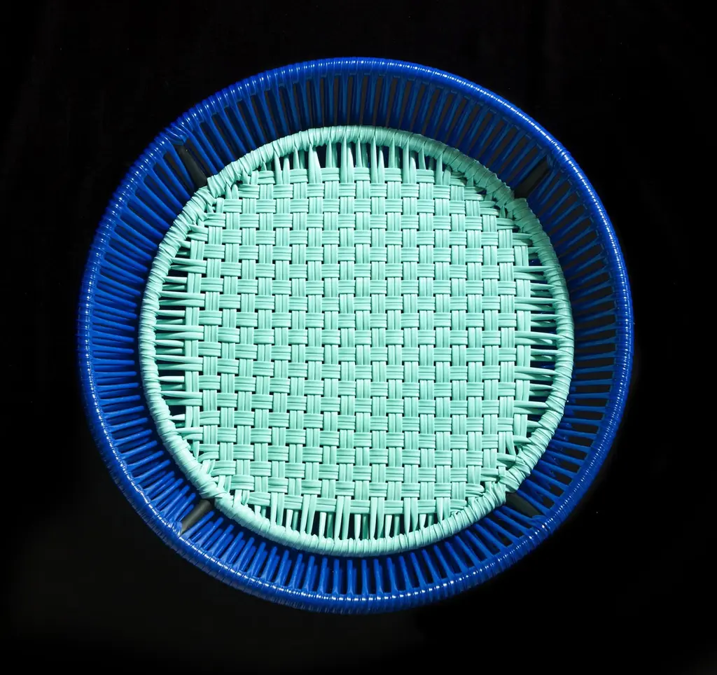 Blue Caribe basket table by Sebastian HerknerMaterials: Galvanized and powder-coated tubular steel. PVC strings are made from recycled plastic.Technique: Made from recycled plastic and weaved by local craftspeople in Colombia. Dimensions: Diameter 54.1 x H 41 cm Also available colors: blue/ mint/ black, mint/ green/ black, orange/ rose/ curry, green/ rose/ curry.The charming Caribe Basket Table is a colorful companion for seating arrangements inside and outdoors. It’s part of the Caribe collection, designed by Sebastian Herkner for ames. The German designer visited Colombia together with Ames founder Ana Maria Calderon-Kayser and translated the vibrancy and spirit of the country’s people and traditions into joyful, modern furniture pieces defined by clean lines, strong colors, and the hand-woven webbing.Each basket is made in Santa Marta, a city on the Caribbean coast of Colombia, by local craftspeople. They weave the PVC strings, which are made from recycled plastic, around the tubular steel frame. The weaving technique the artesanos and artesanas use are called Momposino, a traditional method known for intricate patterns. Just the preparation of all the materials takes ten days, while the production of each table takes two daysGerman designer Sebastian Herkner is a long-term collaborator of Ames and has visited Colombia multiple times to experience the country’s cities, nature and people first hand. He also visited many of the ateliers that Ames has partnered with to learn about the unique traditional crafts of Colombia's regions. A sought-after contemporary designer and recipient of many industry awards, he has worked with many international design brands, creating intriguing pieces that showcase his intuition for interesting material, color, and texture combinations.