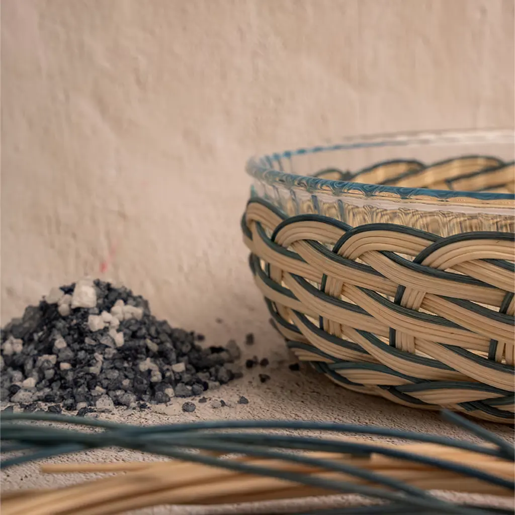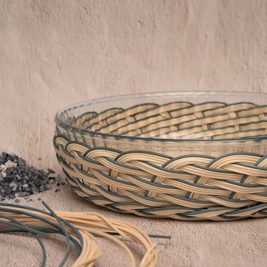 Skillfully crafted from natural wicker with a touch of blue woad, this cake pan features a Pyrex glass mold, guaranteeing elegance and practicality. Inspired by classic bread baskets, its design exudes quality and sophistication. The blue pigment is expertly derived from the renowned woad plant, celebrated for its exceptional dyeing properties, making this cake pan the epitome of refinement, the perfect centerpiece for any occasion.