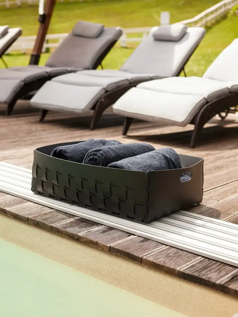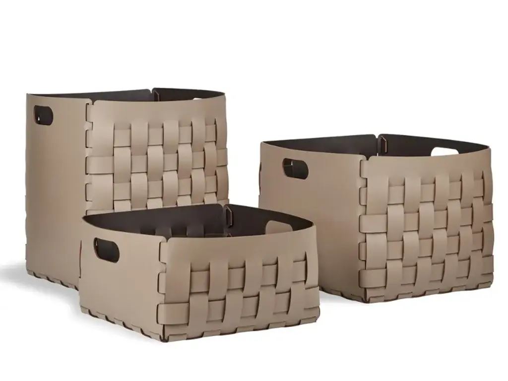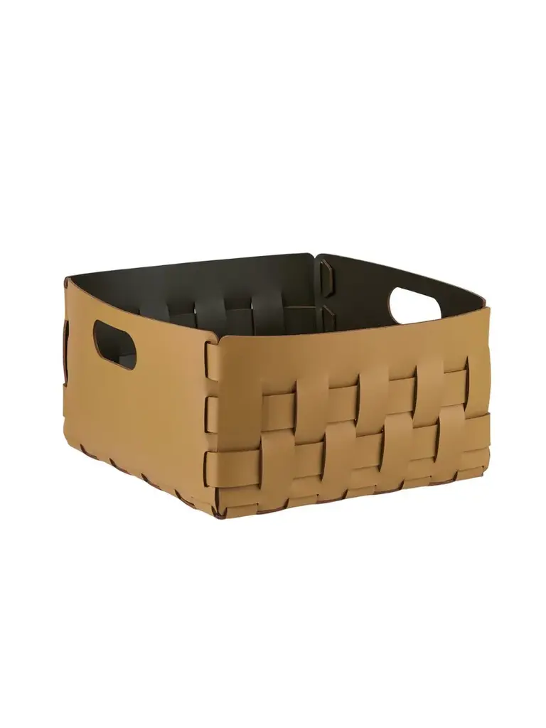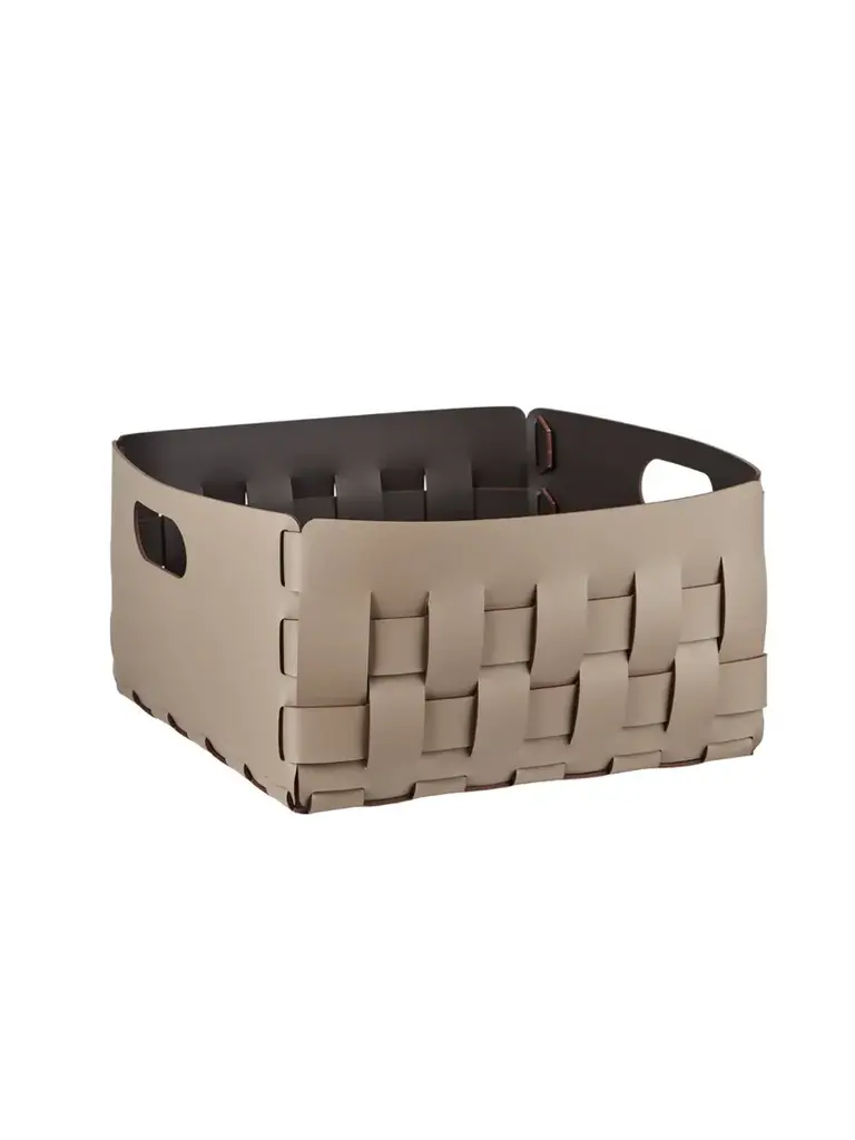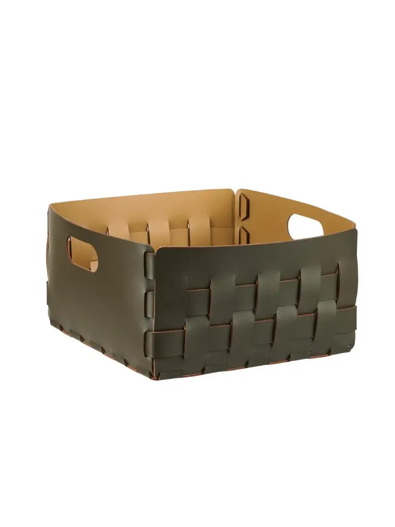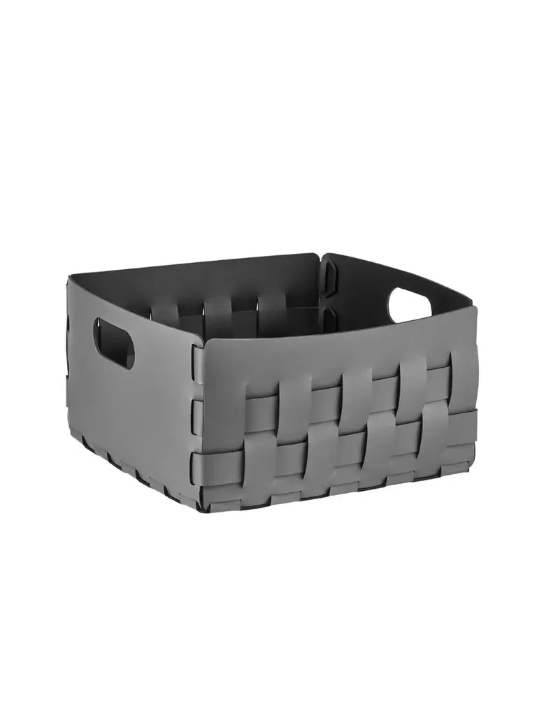 An elegant rectangular or square shaped basket with large weaving is convenient for storing clothes, slippers, plaids, toys or sports equipment. Each product utilizes ADJ's multifunctional leather, which undergoes double-sided dyeing and a specialized anti-vandal treatment, resulting in enhanced durability against wear, scratches, and abrasions.